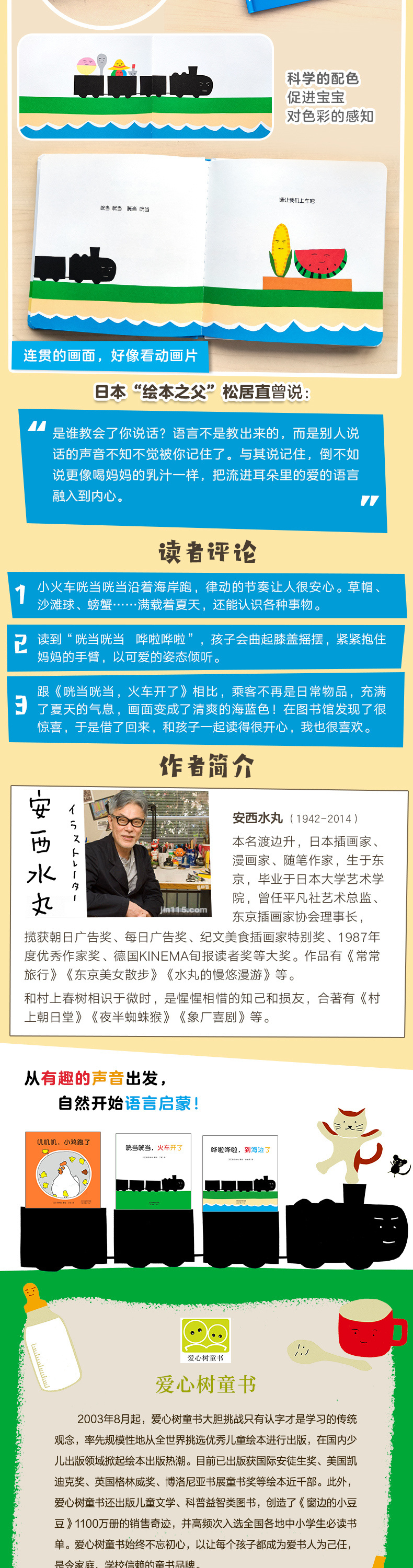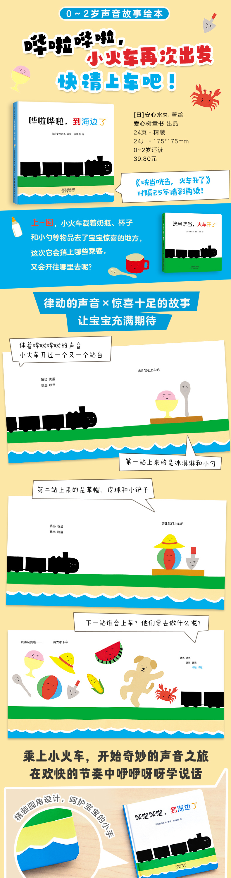 1、咣当咣当的小火车沿着海岸跑,律动的节奏很安心。草帽、沙滩球、螃蟹……满载着夏天,还能认识各种事物。