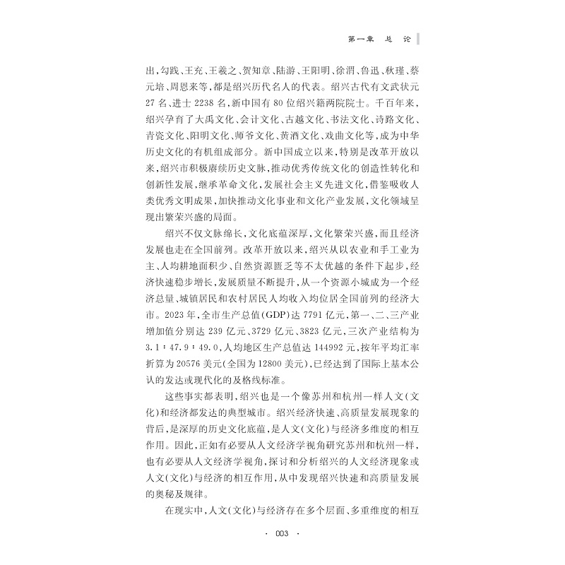 绍兴是浙江经济强市,经济发展走在全国前列。绍兴经济快速、高质量发展的背后,是深厚的历史文化底蕴、是人文与经济多维度的相互作用。本书旨在从人文经济学的视野,聚焦于绍兴人文经济或人文与经济相互融合的多个层面、多重维度,探讨和分析绍兴的人文经济现象以及人文与经济的相互作用,从中发现绍兴经济快速和高质量发展的根本原因及其规律。全书从绍兴人文经济或人文与经济相互作用的人文经济化、绍兴人文经济或人文与经济相互作用的经济人文化、绍兴人文经济或人文与经济相互作用的人文动力作用、绍兴人文经济或人文与经济相互作用的人本取向四个维度进行研究,鲜明地体现了经济发展以人为中心的价值宗旨与价值取向。