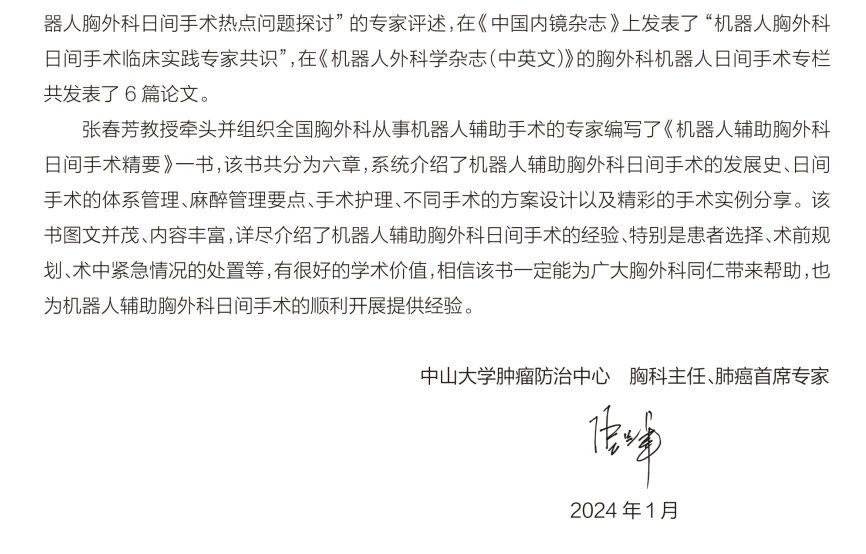 张春芳教授主持编写的这部《机器人辅助胸外科日间手术精要》,对于我们常规机器人辅助手术的开展提供了很多借鉴和参考,内容丰富,从ERAS的角度对手术流程、麻醉实施及病患管理等多方面进行了阐述。相信对于广大胸外科同仁具有很高的参考价值和指导意义。