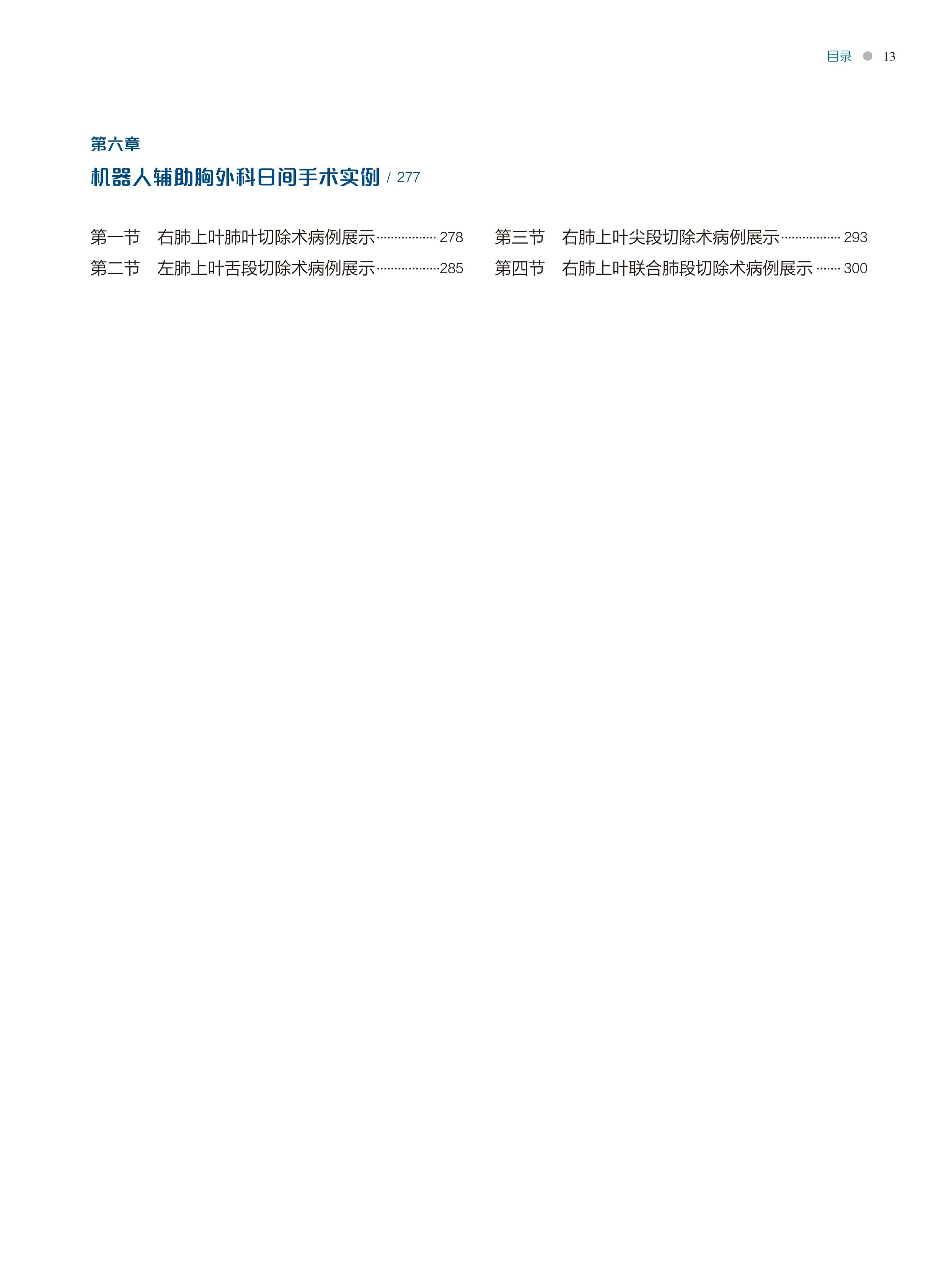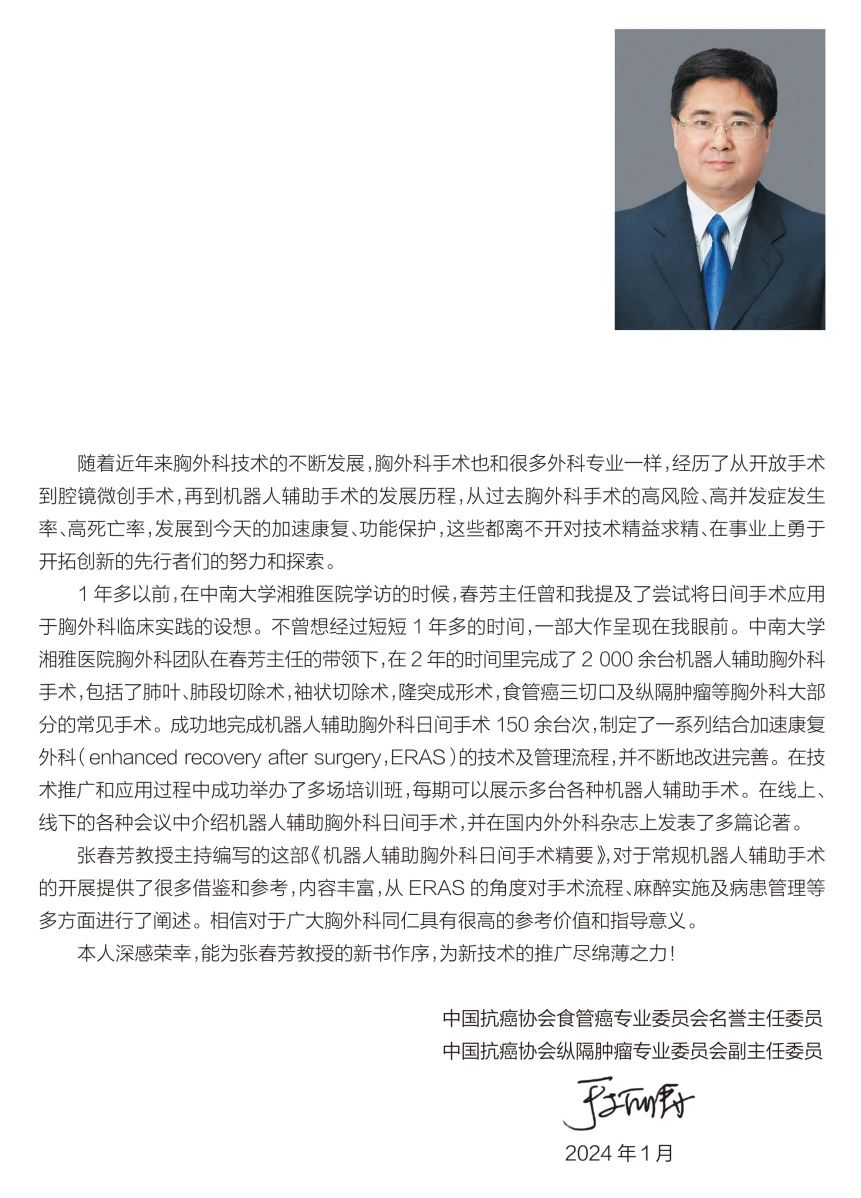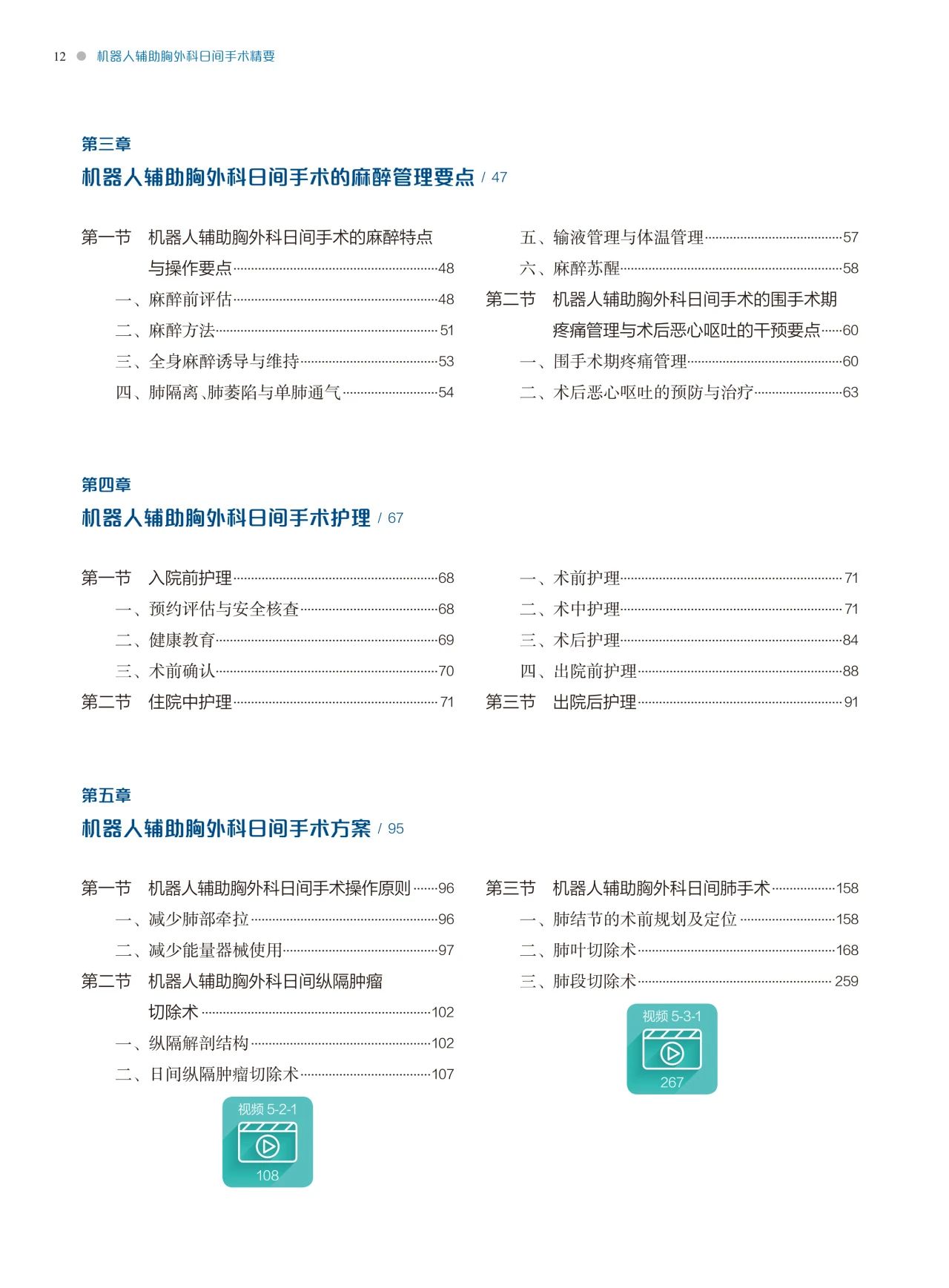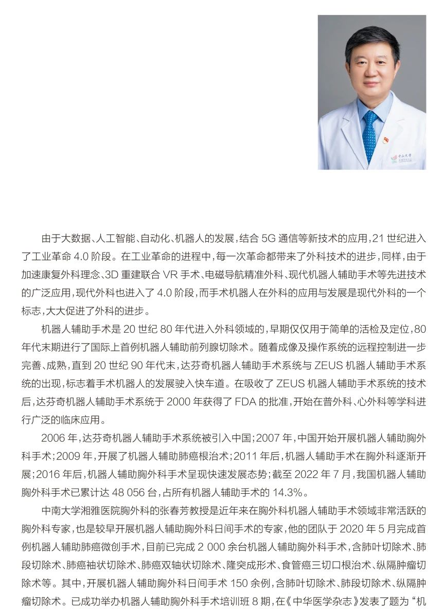该书图文并茂、内容丰富,详尽介绍了机器人日间手术的经验、特别是患者的选择、术前的规划、术中紧急情况的处置等,有很好的学术价值,相信该书一定能为广大胸外科同仁带来帮助,也为胸外科机器人日间手术的顺利开展提供经验。