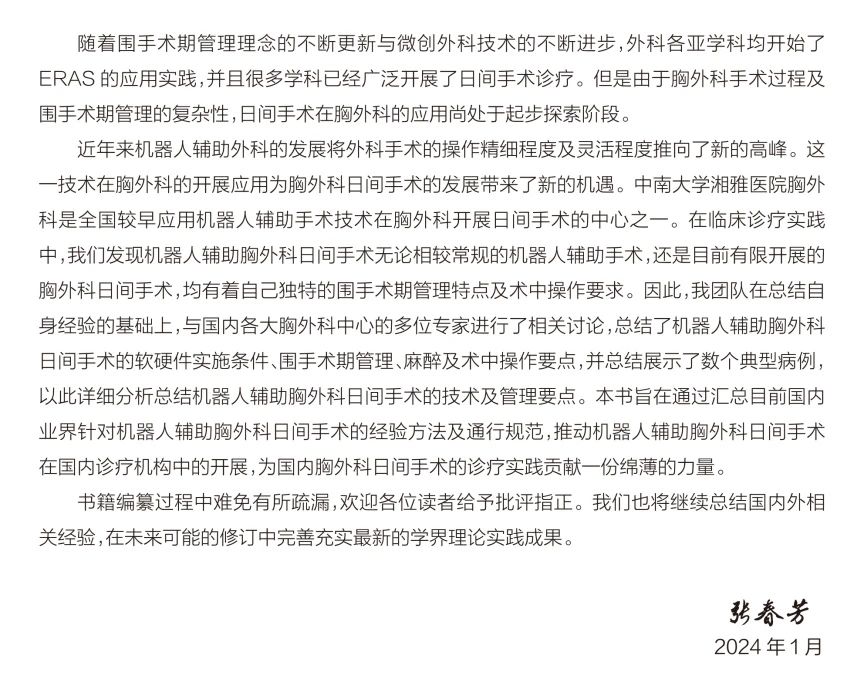 机器人辅助胸外科日间手术无论相较常规的机器人辅助手术,还是目前有限开展的胸外科日间手术,均有着自己独特的围手术期管理特点及术中操作要求。主编团队来自中南大学湘雅医院,他们已成功完成胸外科机器人辅助胸外科日间手术150余台次。在总结自身经验的基础上,他们与国内各大胸外科中心的多位专家进行了相关讨论,总结了机器人辅助胸外科日间手术的软硬件实施条件、围手术期管理、麻醉及术中操作要点,并总结展示了数个典型病例,以此详细分析总结机器人辅助胸外科日间手术的技术及管理要点。
