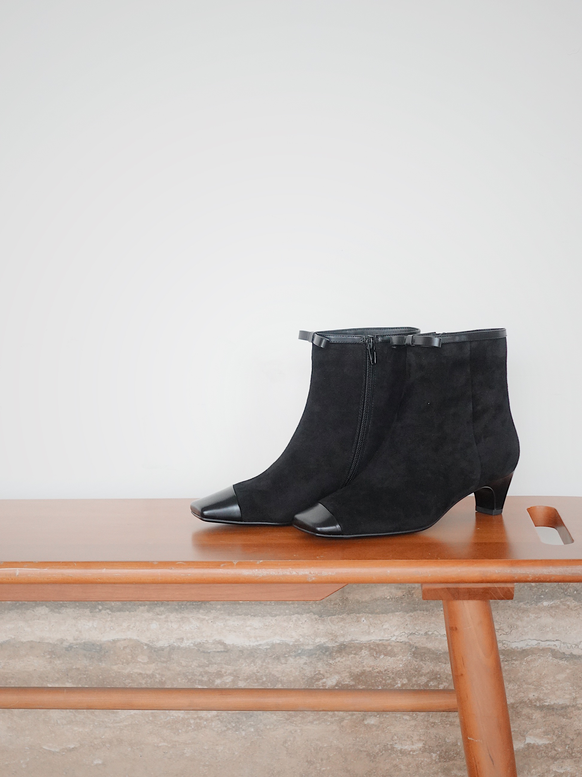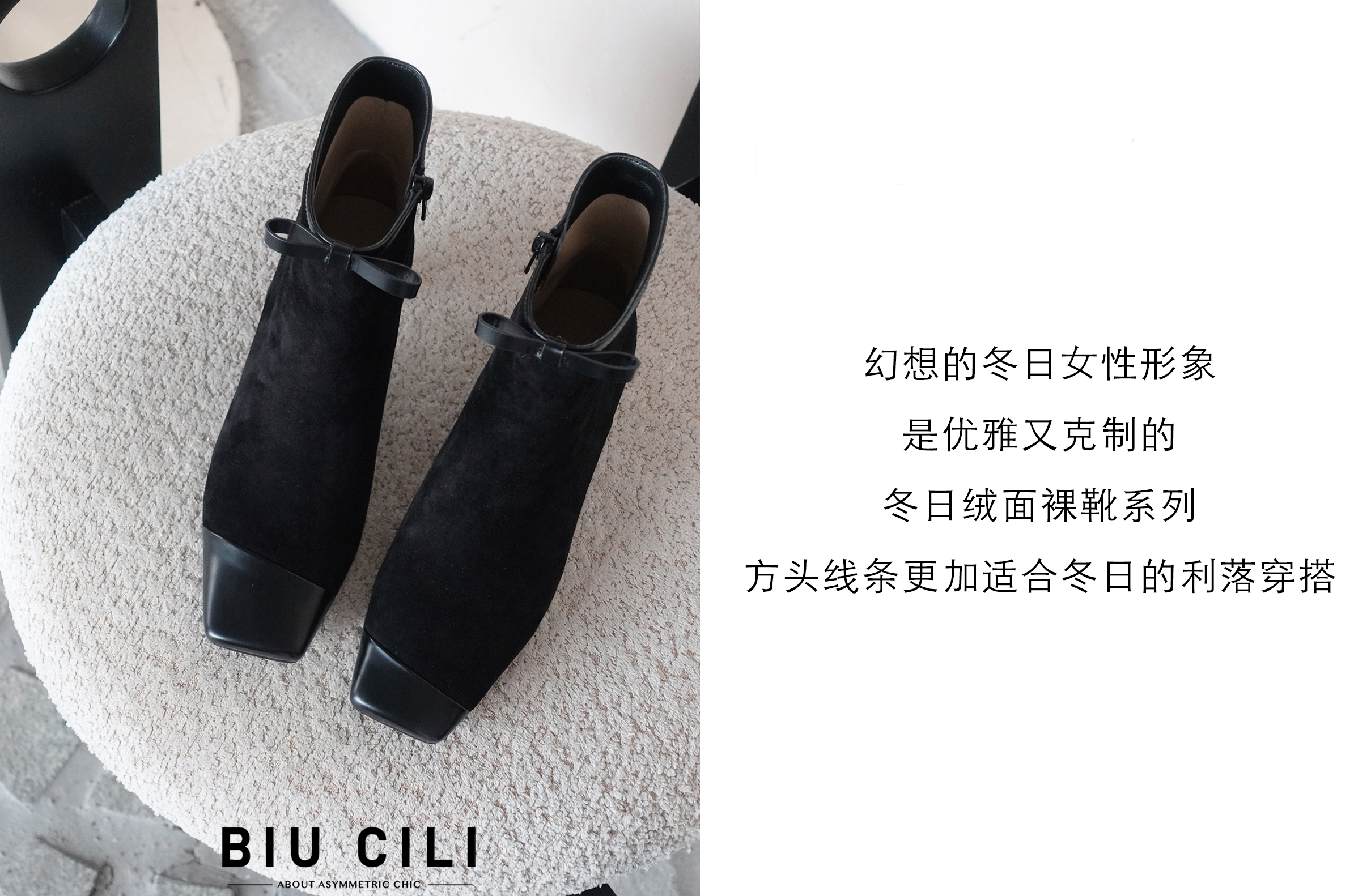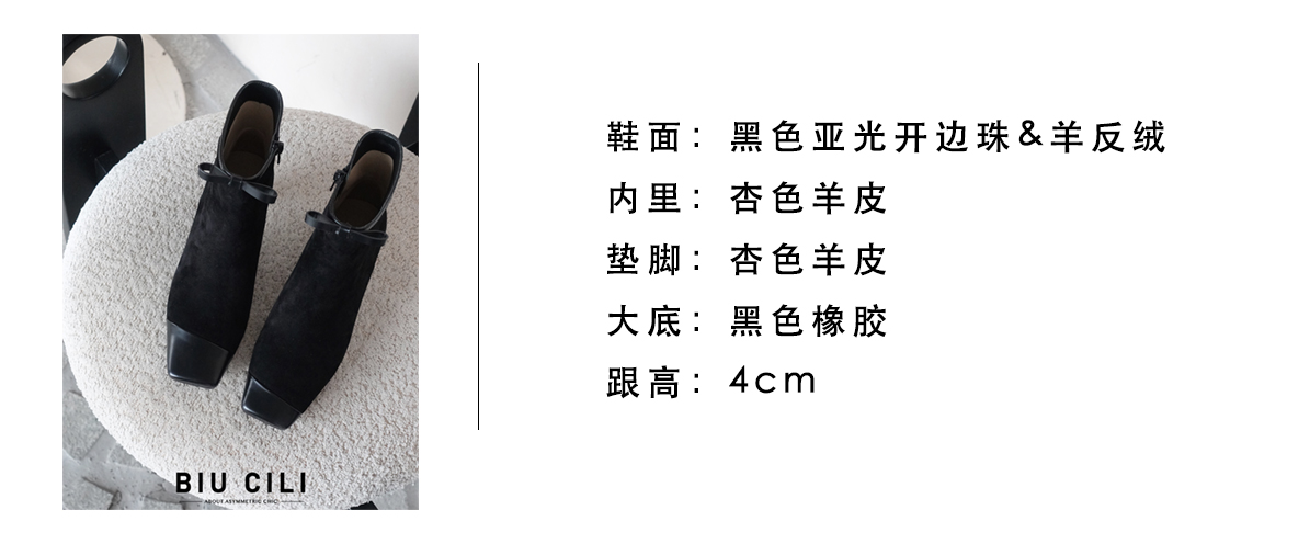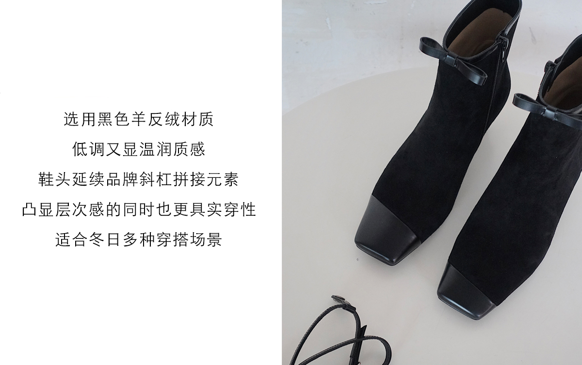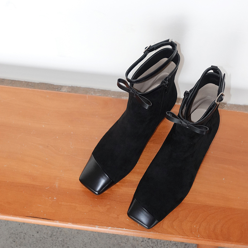 BIUCILI 「莫妮卡」原创设计蝴蝶结法式绒面方头中跟裸靴短靴
