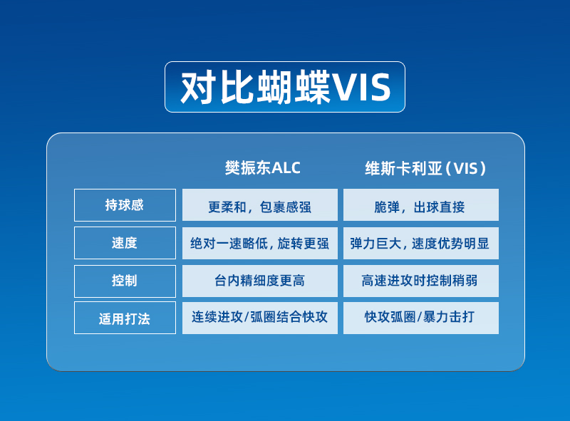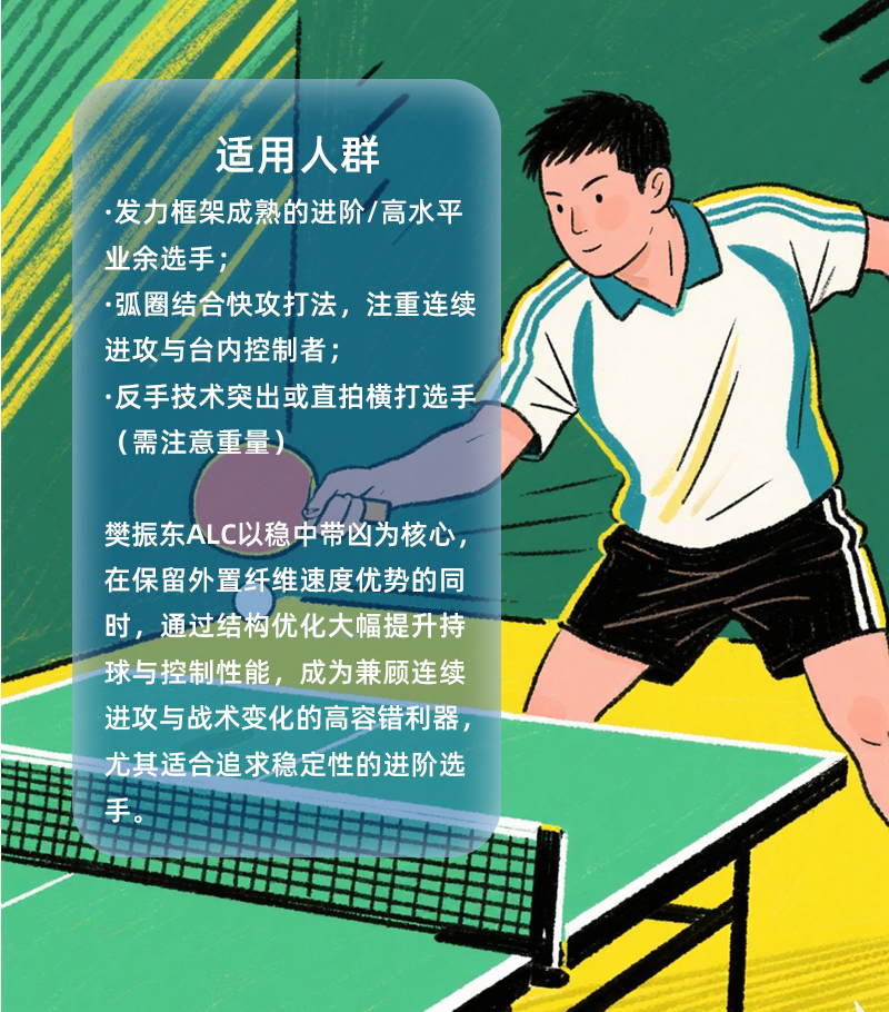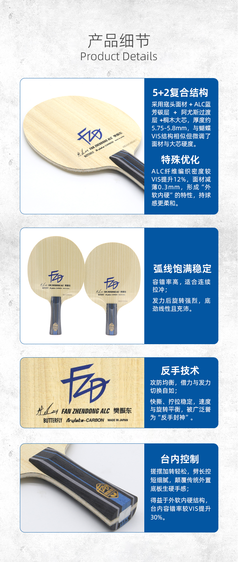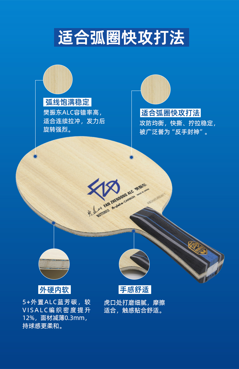 简介:樊振东ALC进攻威力强,被球友称为横打利器也是樊振东本人所使用的底板出自于VISCARIA合板构成样式的高性能加上ALC的特殊素材樊A是做到了既能很好地吃球又能提升你想猛攻时的威力,非常适合于全面型打法的选手使用