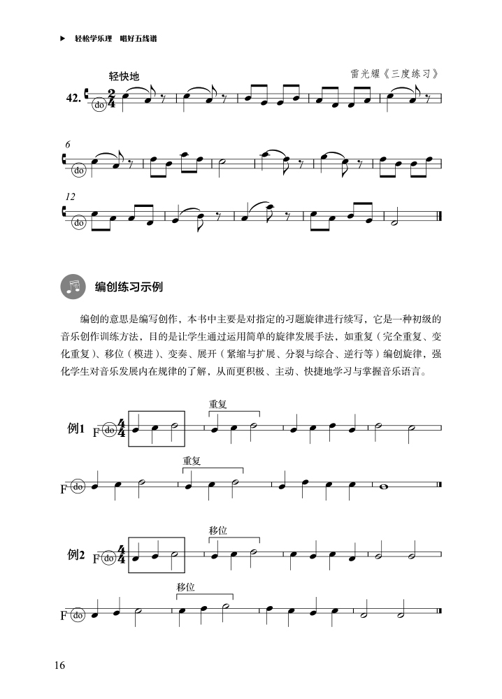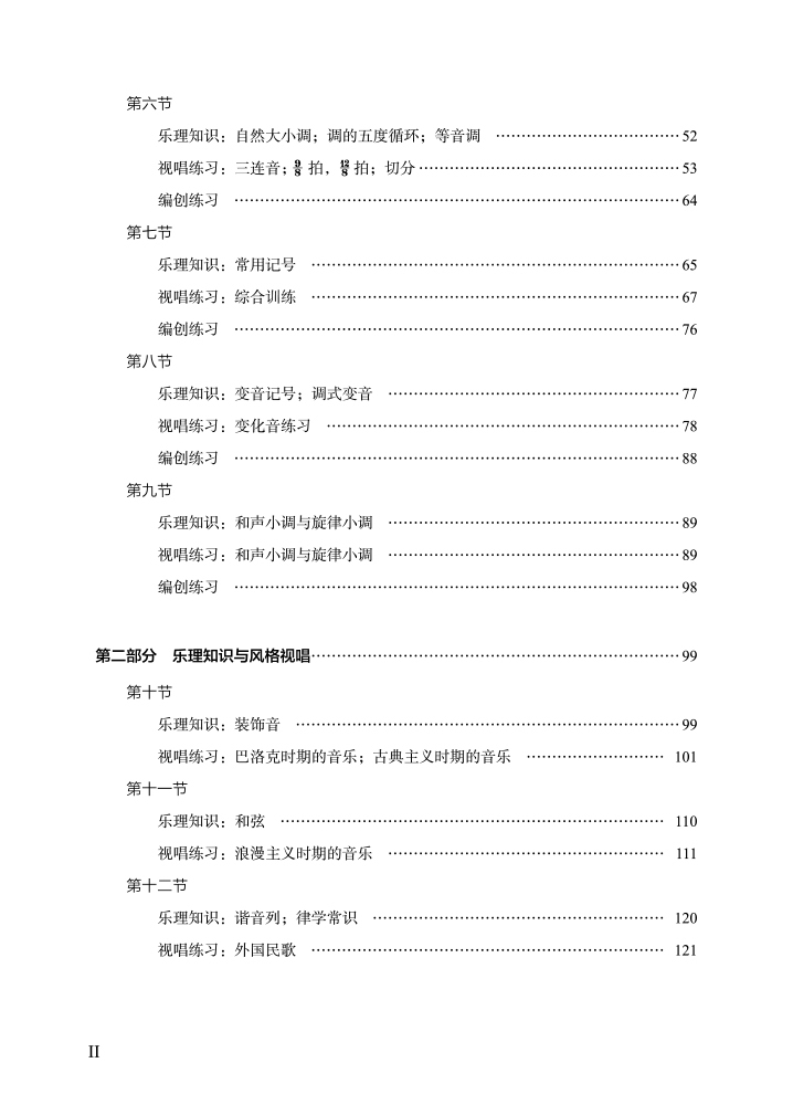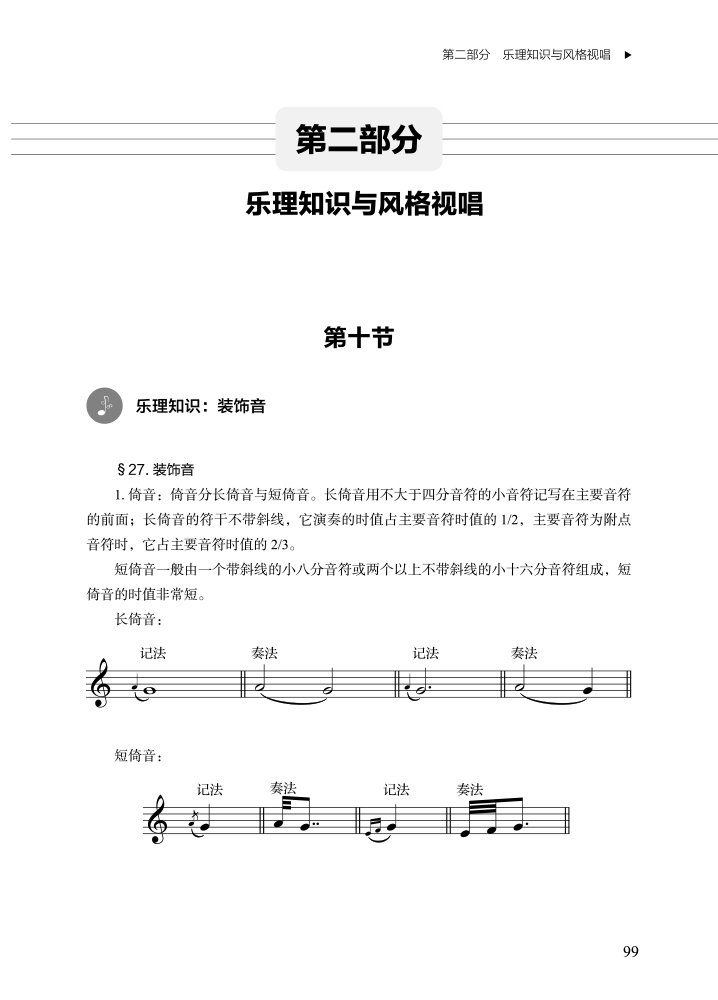 本书受众对象主要是非艺术类在校大学生以及社会业余音乐爱好者。书稿分三个部分,共计18节,第一部分为乐理知识与视唱基础训练;第二部分为乐理知识与风格视唱;第三部分为乐理知识与视唱提高训练。教材将简明乐理与视唱结合,依循五线谱发展历史,从一线到五线循序渐进,培养学生的识谱习惯。书中的乐理只是初级的基本内容,重点是将乐理与五线谱的学习紧密结合,使之成为一本简明、实用,既有识谱技术训练、又有音乐文化内涵的通用型教材。 |