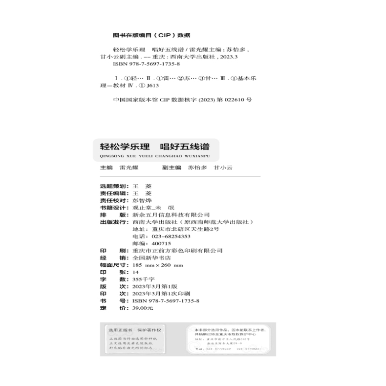 *书名:轻松学乐理 唱好五线谱 | *ISBN:978-7-5697-1735-8 |
