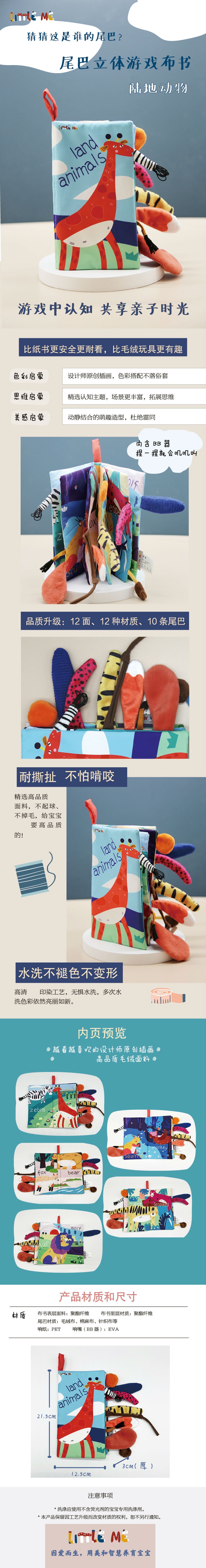本产品专为婴幼儿而设计,设计师原创精选插图设计,采用柔软的安全布料和填充棉,加上响纸、BB器等做成婴幼儿喜欢捏喜欢抓的布书。插画设计颜色鲜艳而不浮躁,采用环保染料,可以水洗不掉色,宝宝啃咬也没事哦!原创图案设计,设计风格源于北欧,结合低幼儿童的生理特点,设计出兼具实用价值和艺术价值的作品。上面的每个动物造型憨萌,艺术感十足,配色鲜明但不艳俗,培养宝宝的抽象思维能力、美感认知能力、小手抓握能力等。每个动物都有对应的中英文名字,兼具认知功能。