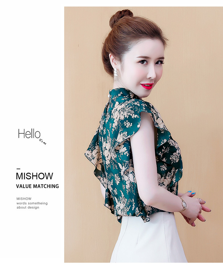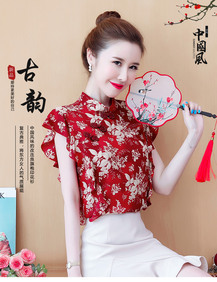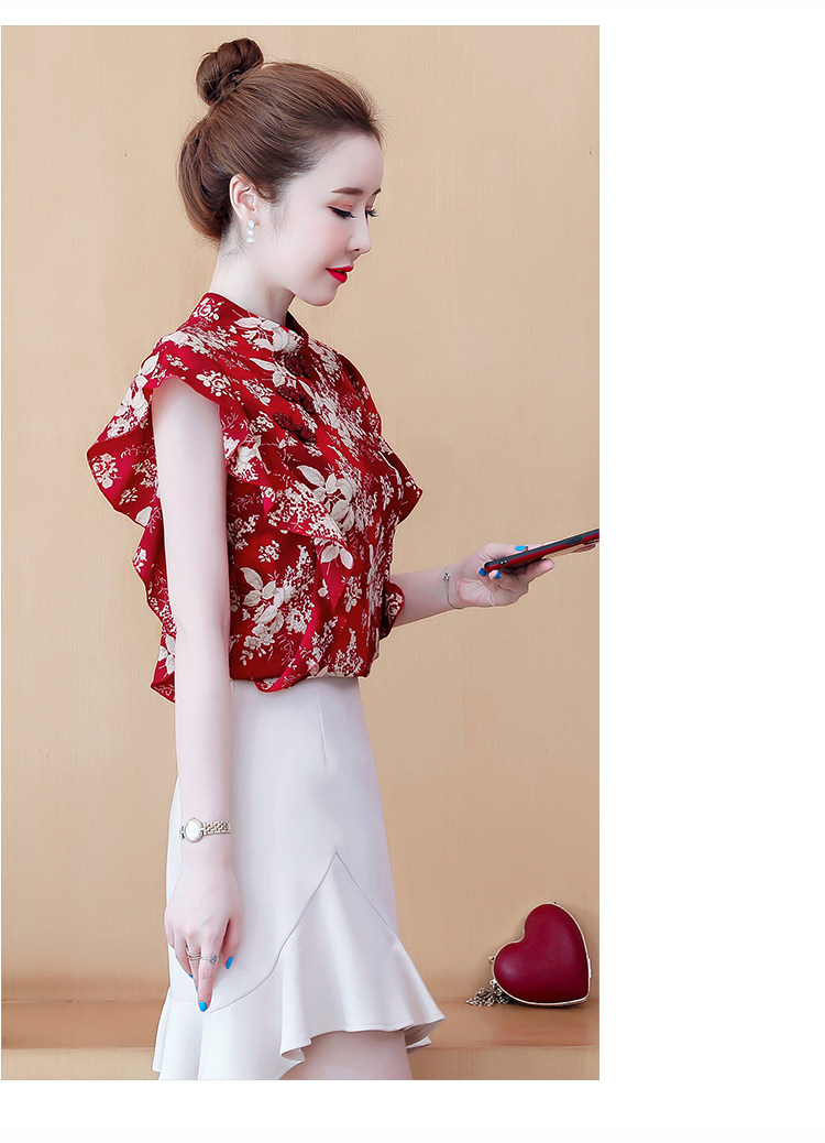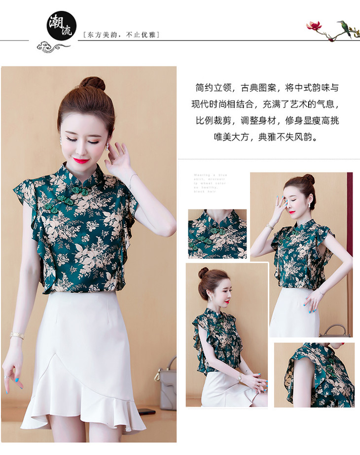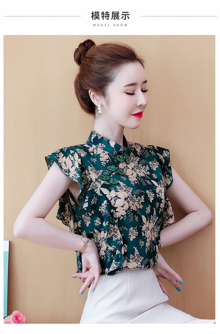 KQL- E316N8967 2022夏新款女装复古宫廷风立领盘扣荷叶边无袖仿真丝衬衫上衣