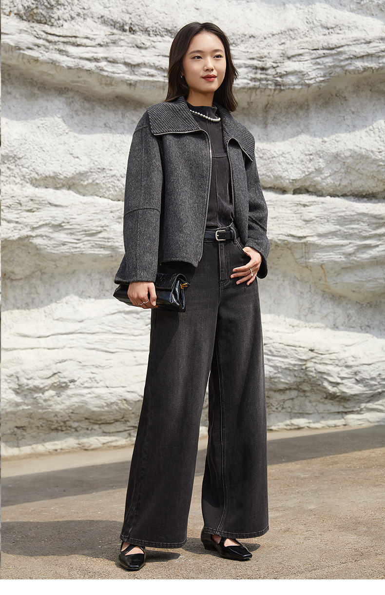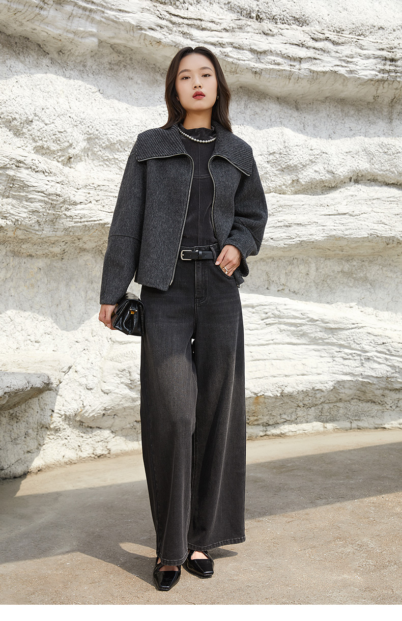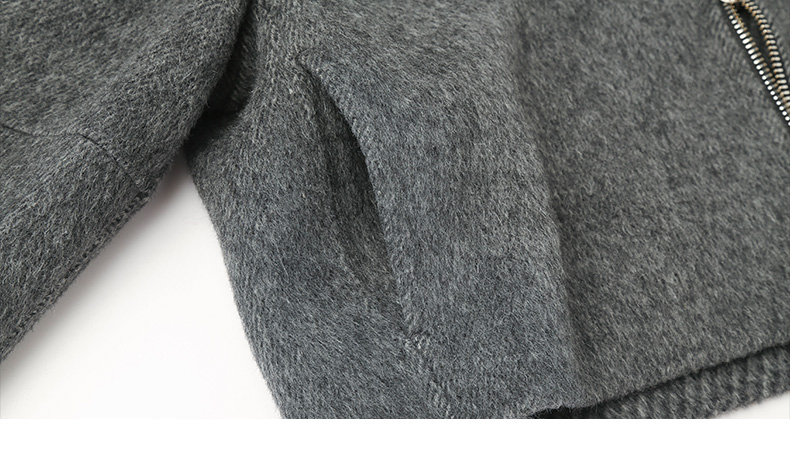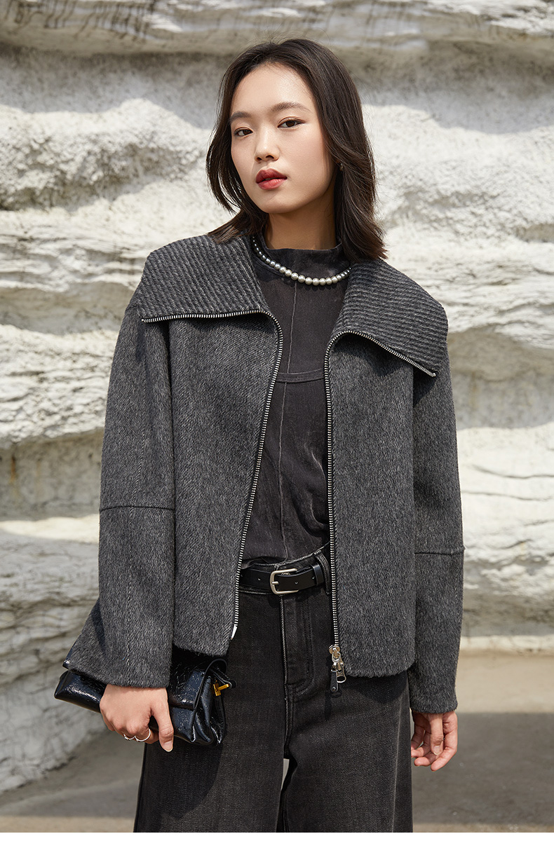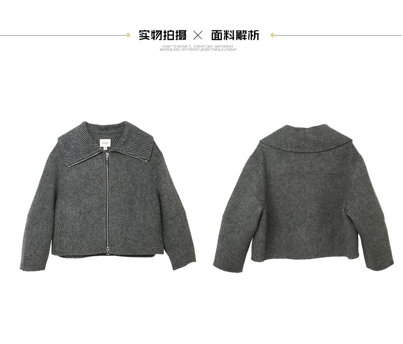 深灰色翻领拉链针织短外套 粗纺肌理宽松短款夹克 秋冬休闲慵懒风上衣