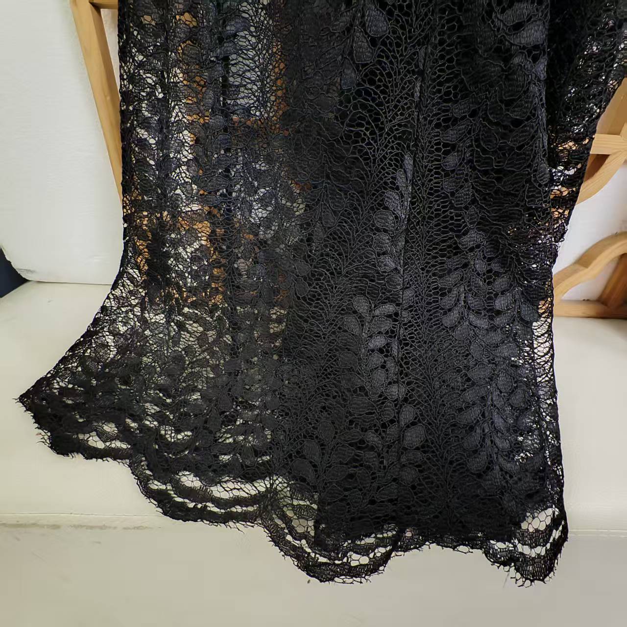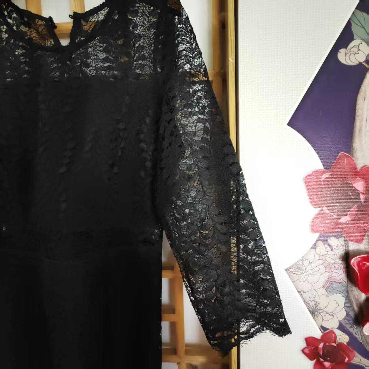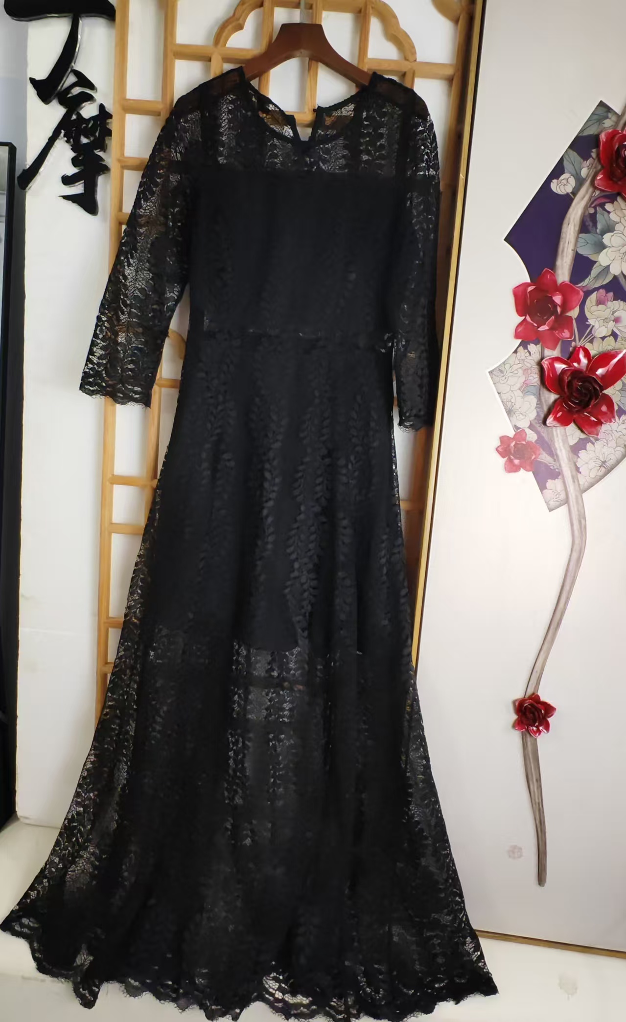 仅一件! 【断码清仓】黑色蕾丝镂空连衣裙 七分袖收腰显瘦长款礼服裙 复古优雅名媛风长裙ZFYY016