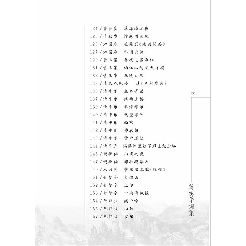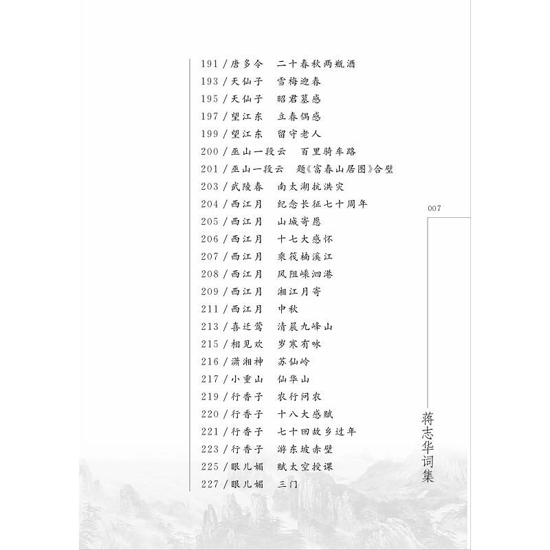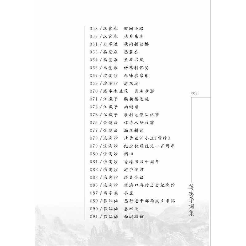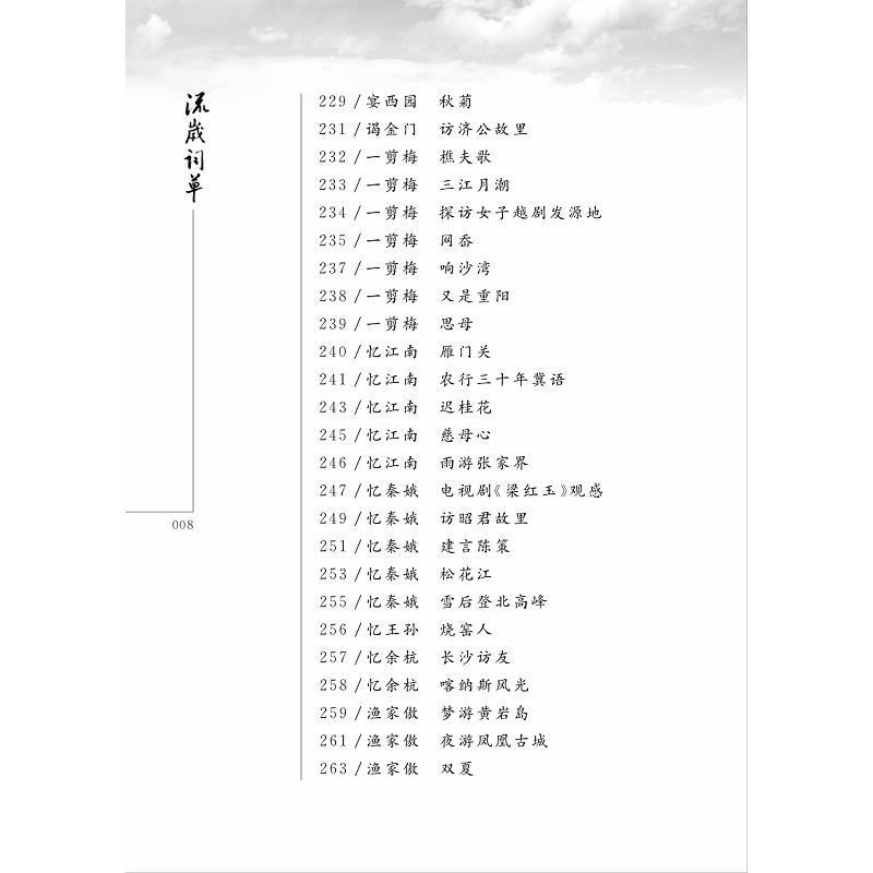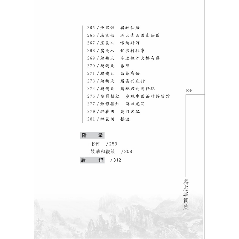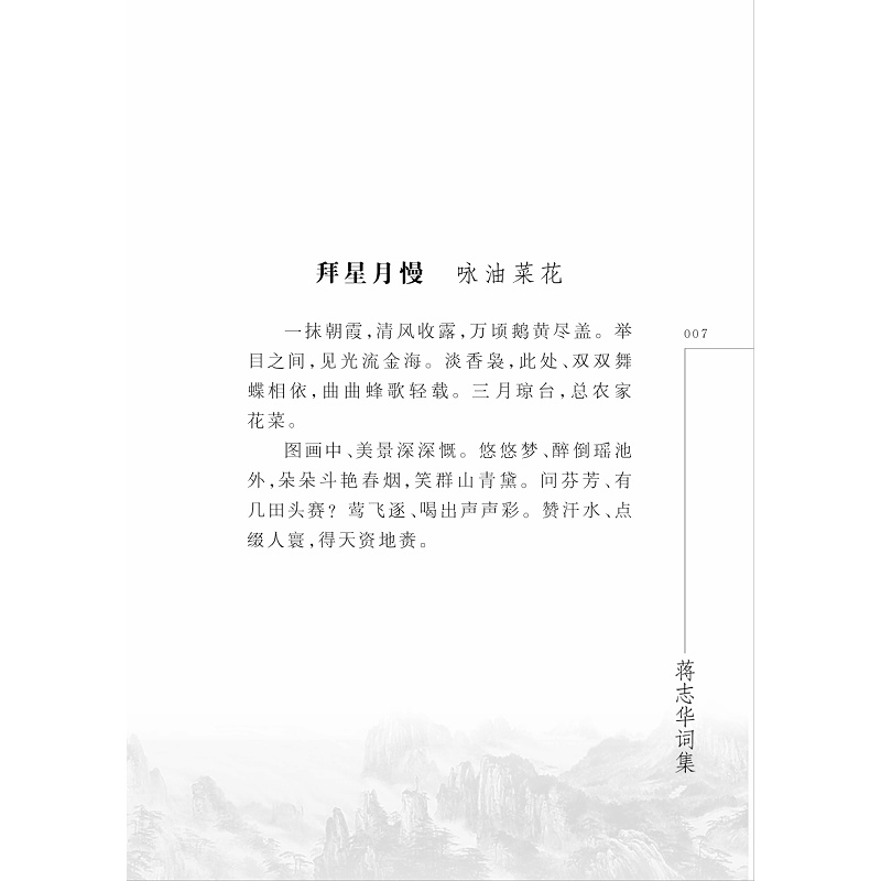 本书为词集。汇集了作者多年来吟写的词近200首,按词牌顺序排列。本词集继承传统,弘扬国学,以鲜活题材反映现代社会风貌,既有对人间正气的讴歌、时代风云的感赋、;又有对大好河山的赞咏、人生旅程的追忆等,洋溢着美好的人生激情,充满着对祖国、对人民、对生活、对未来的无限深情。
