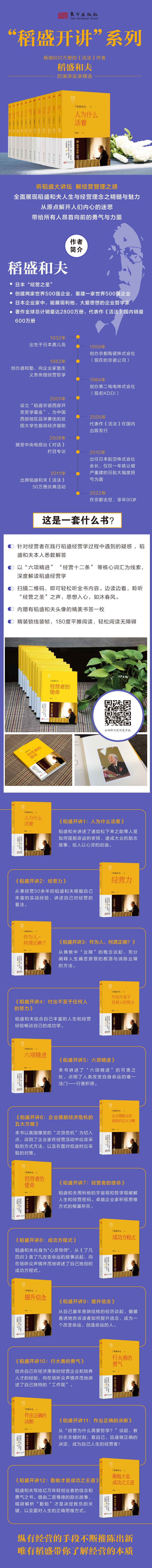 1、《稻盛开讲1:人为什么活着》是稻盛和夫在2001年7月份召开的“盛和塾中部地区合同例会”上的演讲实录,主题是“人生的目的”。稻盛和夫在《稻盛开讲1:人为什么活着》一书中谈到,身处混沌时代的我们应该选择什么样的活法?如何面对命运对自己的安排?演讲中,稻盛和夫还讲述了诸如松下幸之助等耳熟能详的人物是如何能摆脱命运的安排,遂成大业的励志故事,给人以心灵的启迪。