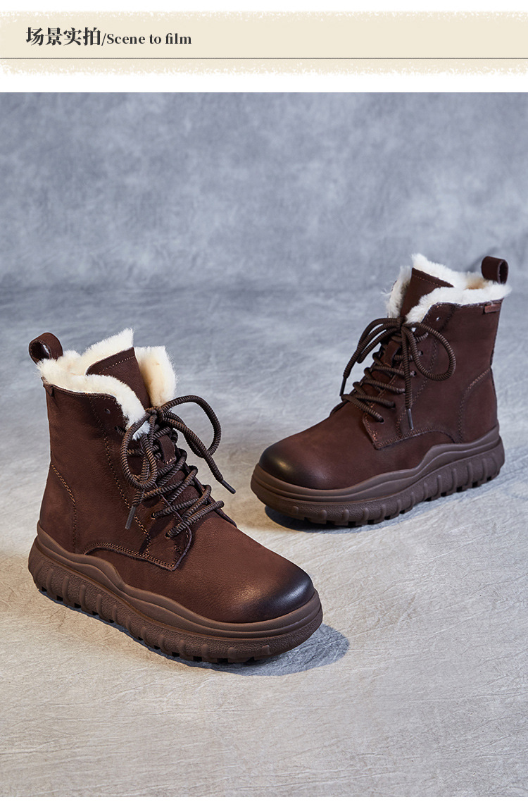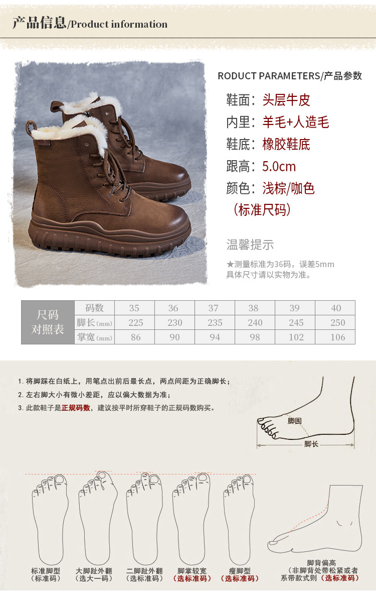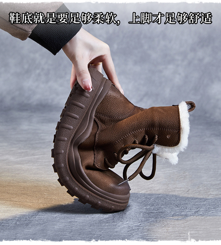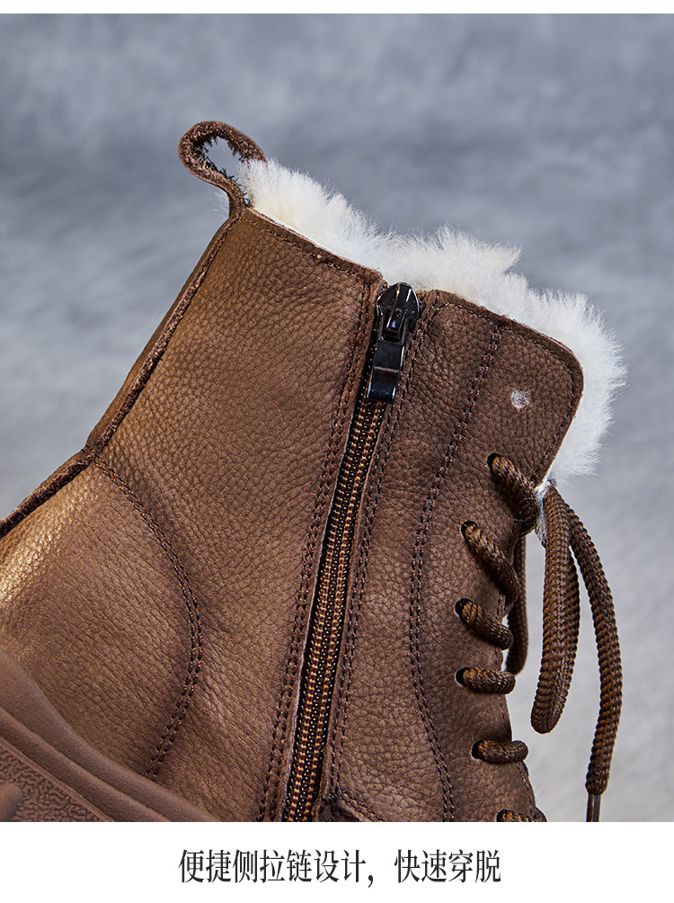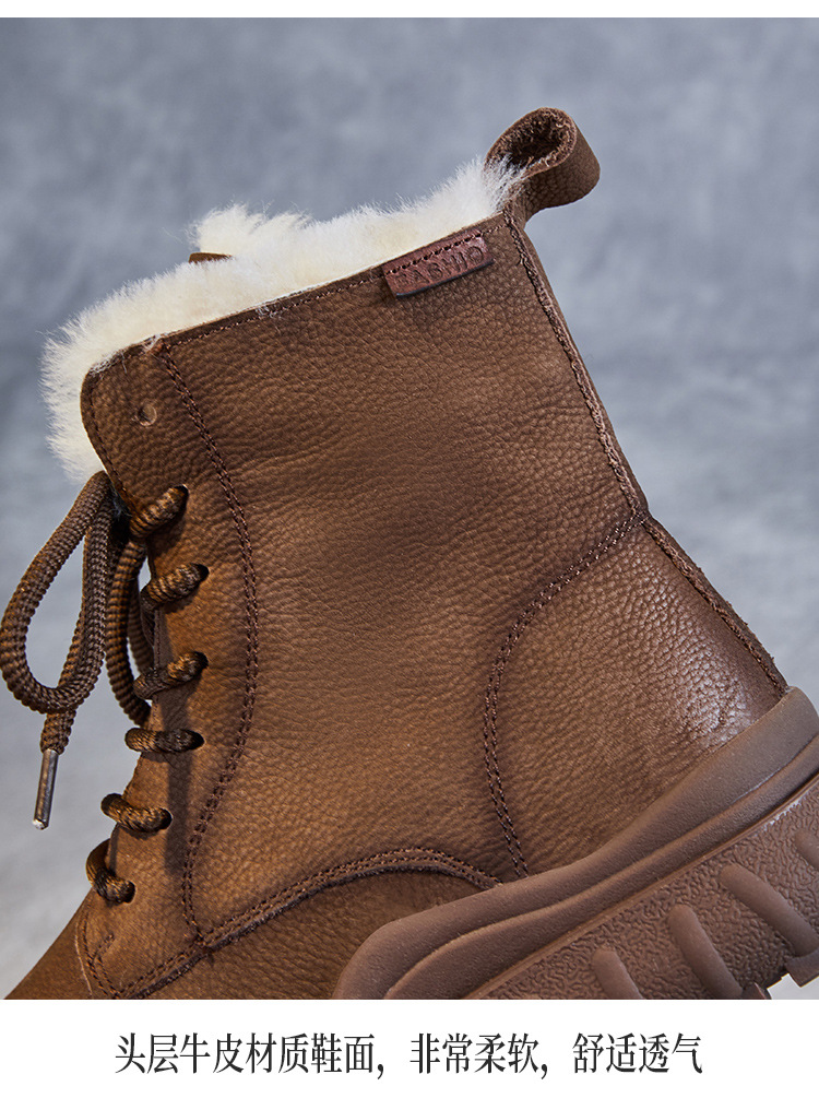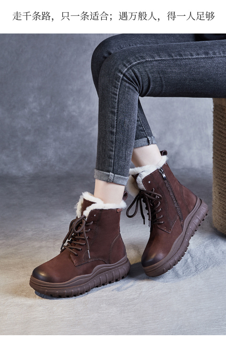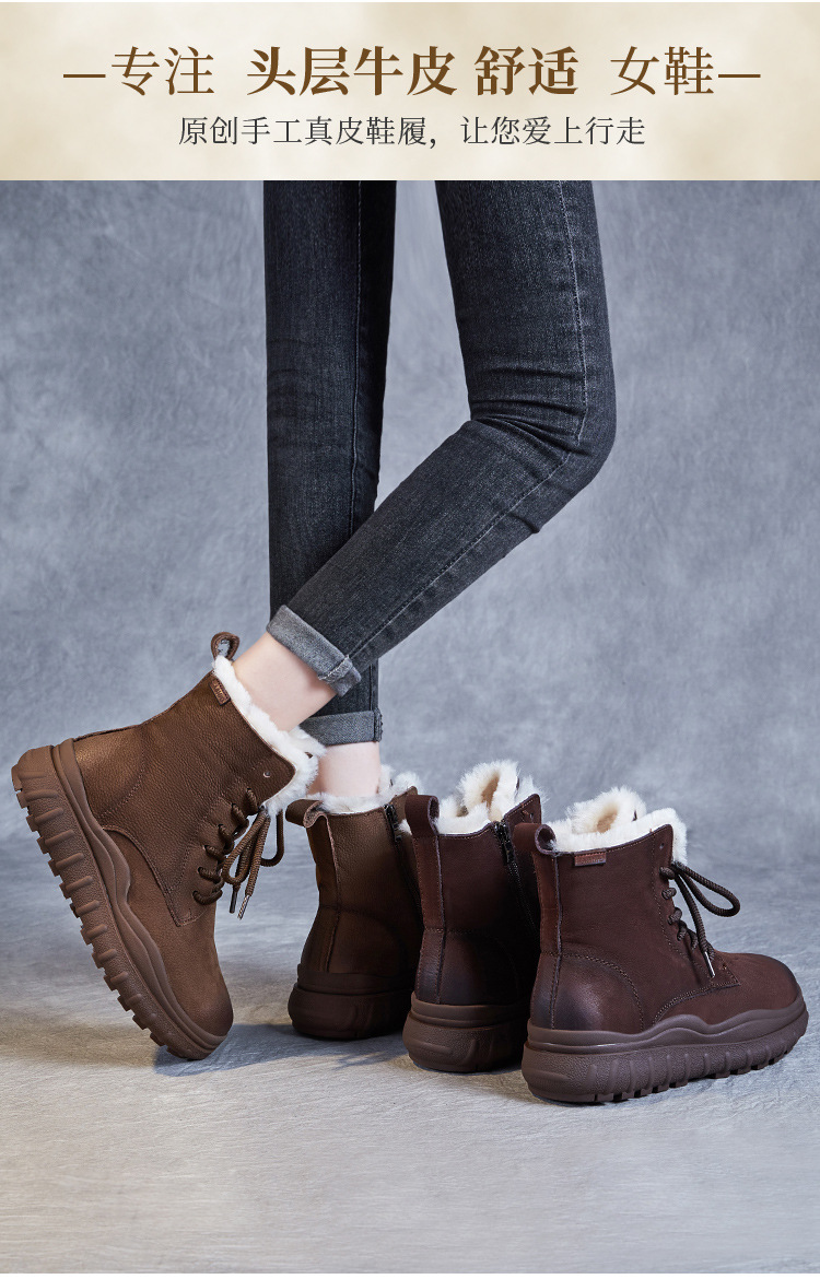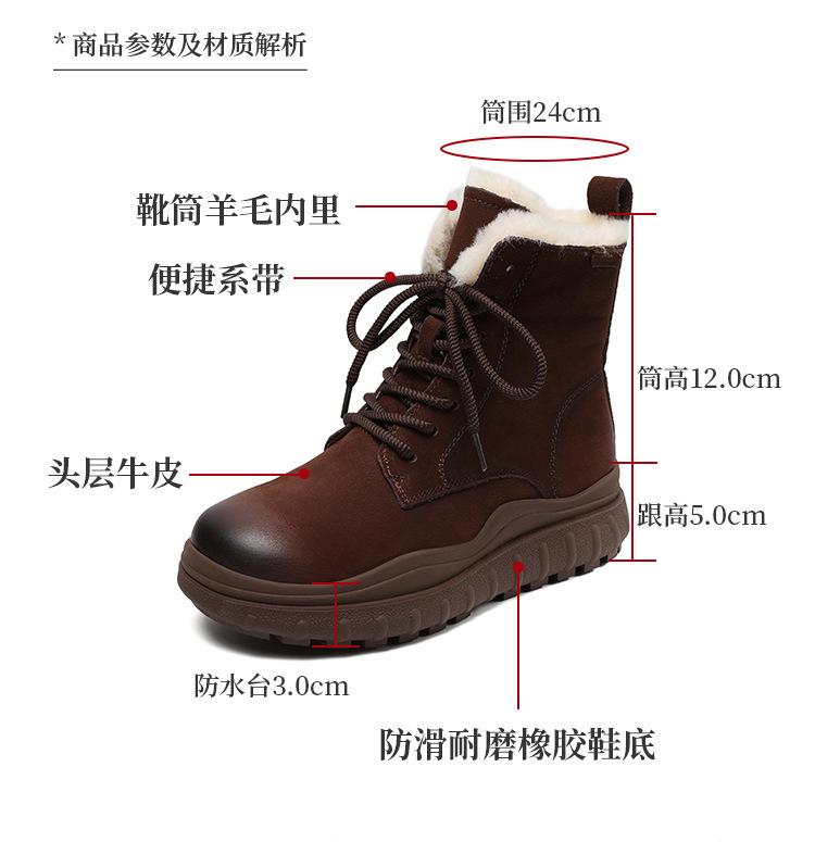 羊毛雪地靴,女秋冬新款加绒加厚保暖棉靴头层牛皮圆头厚底复古短靴ZM233529