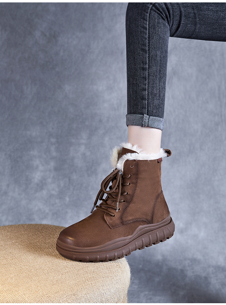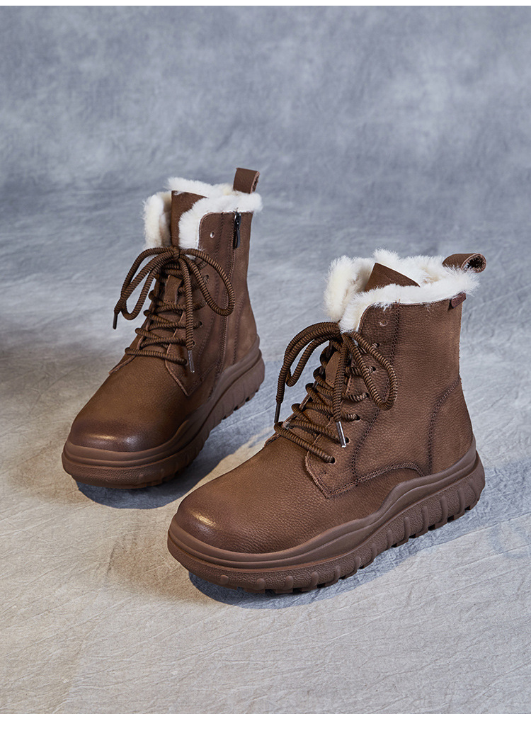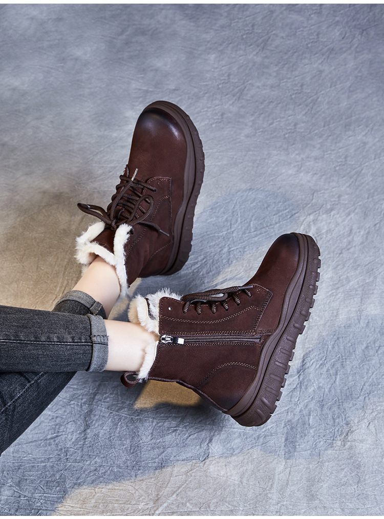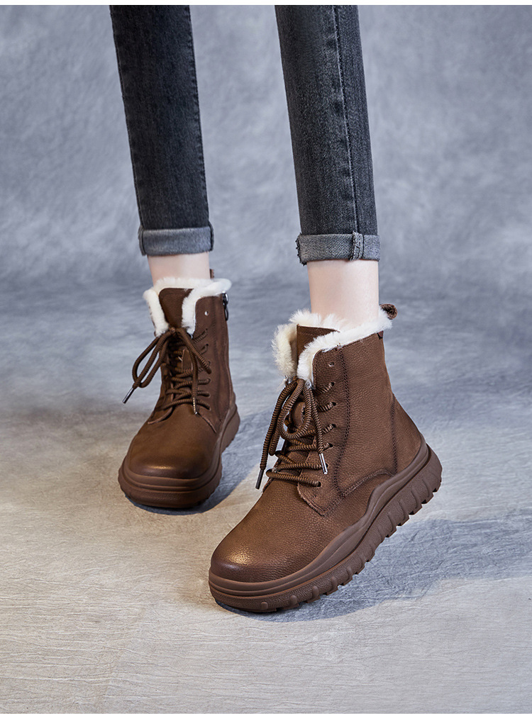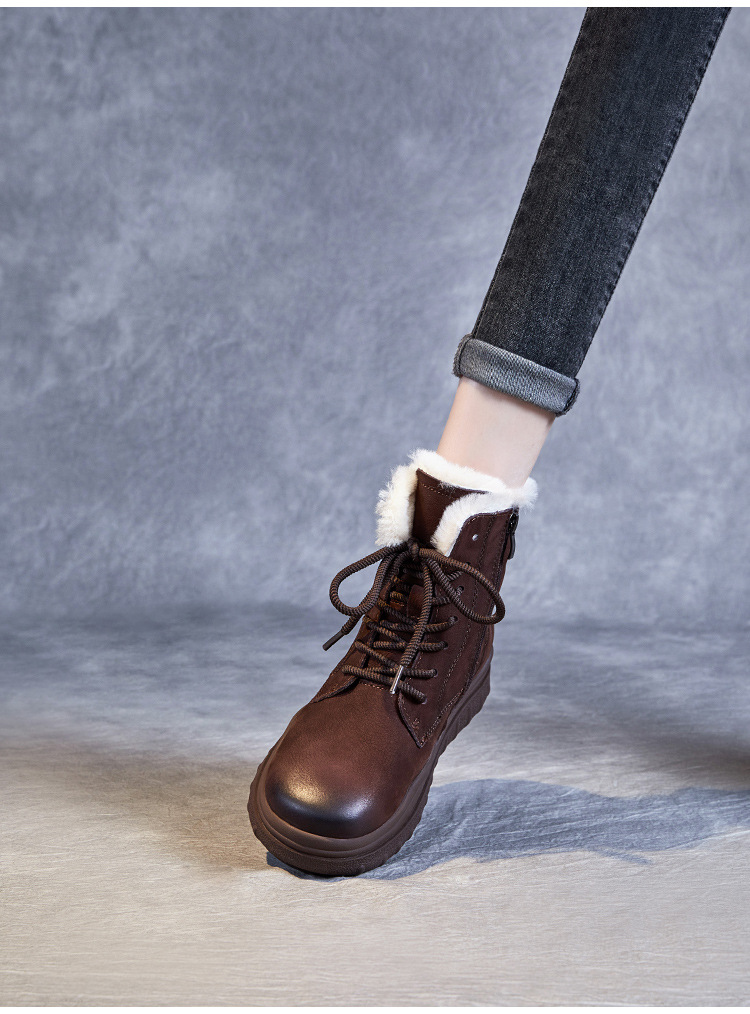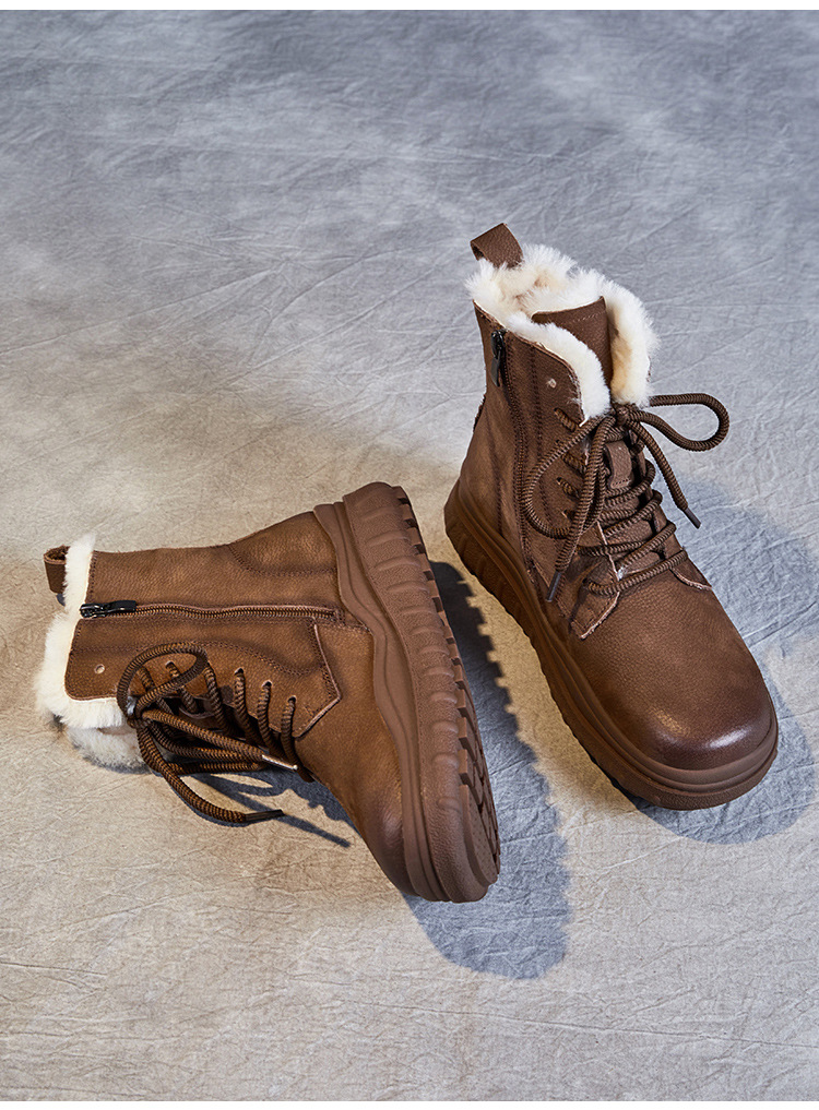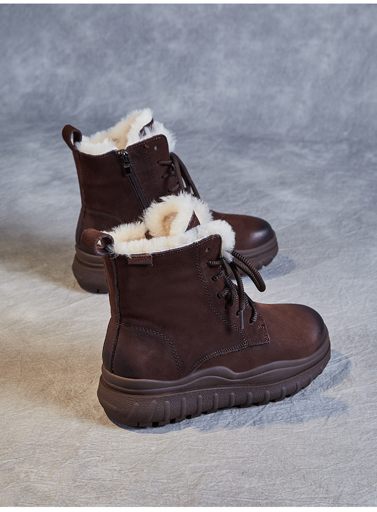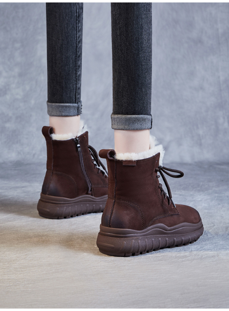 羊毛雪地靴,女秋冬新款加绒加厚保暖棉靴头层牛皮圆头厚底复古短靴ZM233529