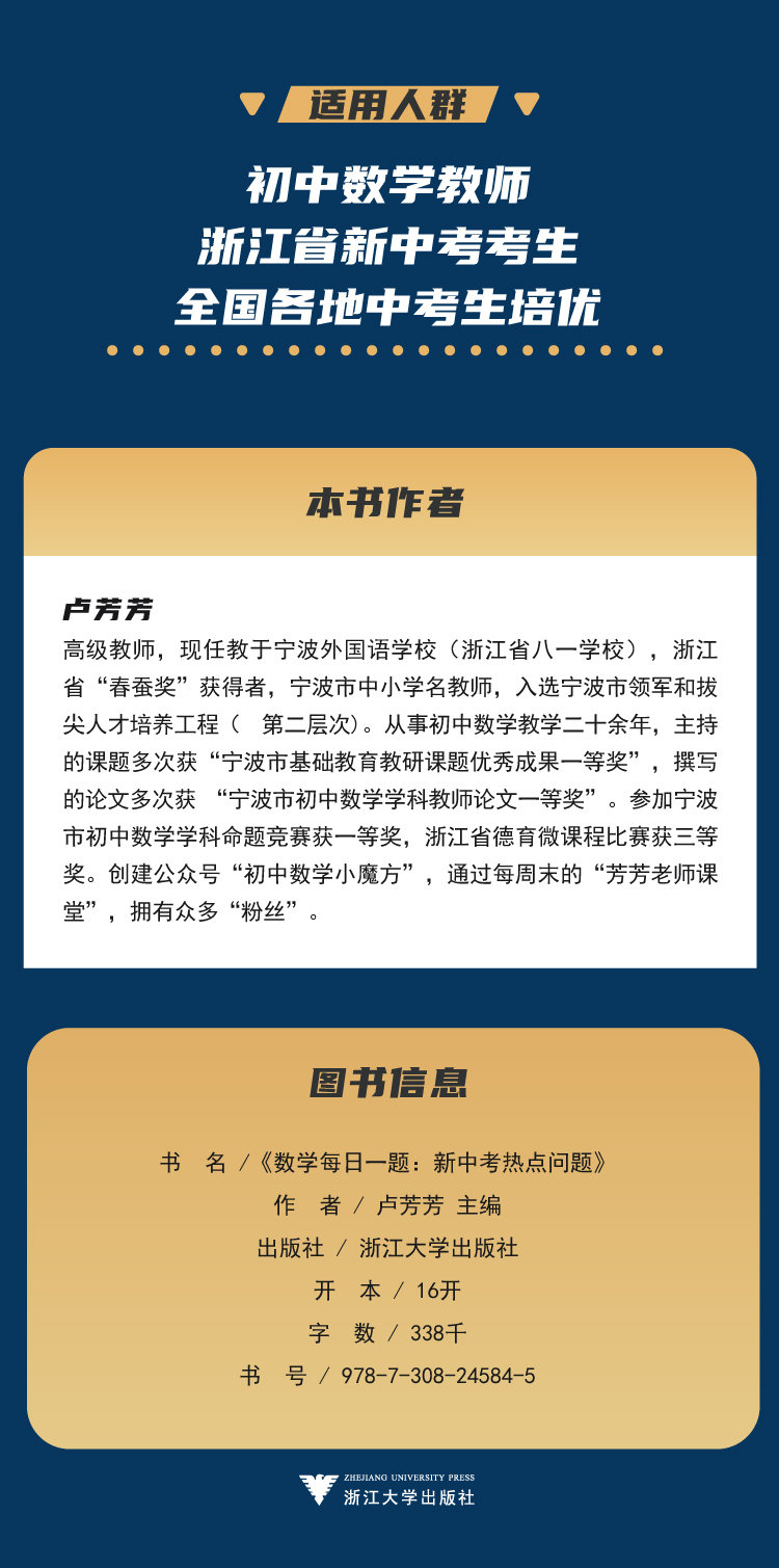 卢芳芳,高级教师,现任教于宁波外国语学校(浙江省八一学校),浙江省“春蚕奖”获得者,宁波市中小学名教师,入选宁波市领军和拔尖人才培养工程( 第二层次)。从事初中数学教学二十余年,主持的课题多次获“宁波市基础教育教研课题优秀成果一等奖”,撰写的论文多次获 “宁波市初中数学学科教师论文一等奖”。参加宁波市初中数学学科命题竞赛获一等奖,浙江省德育微课程比赛获三等奖。创建公众号“初中数学小魔方”,通过每周末的“芳芳老师课堂”,拥有众多“粉丝”。