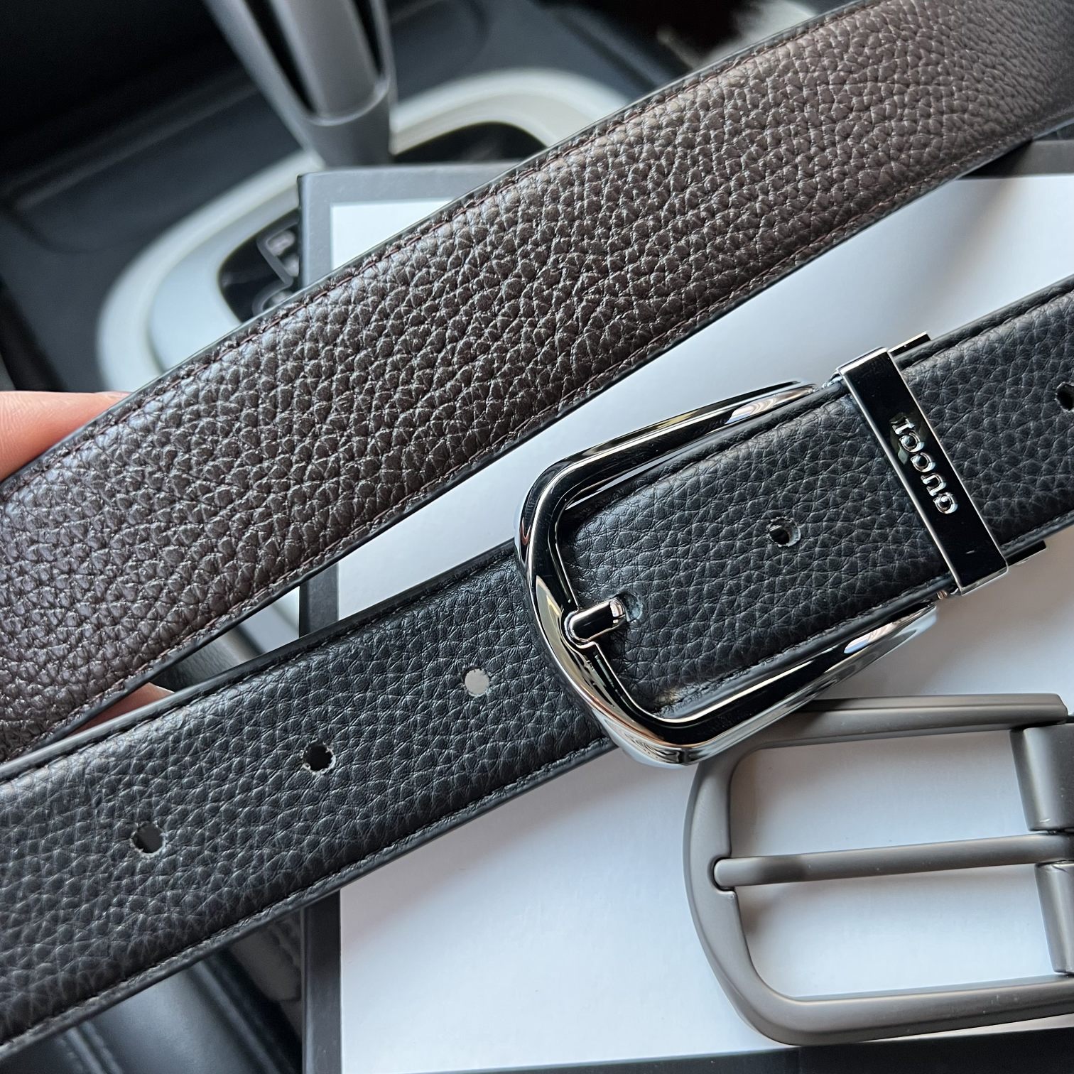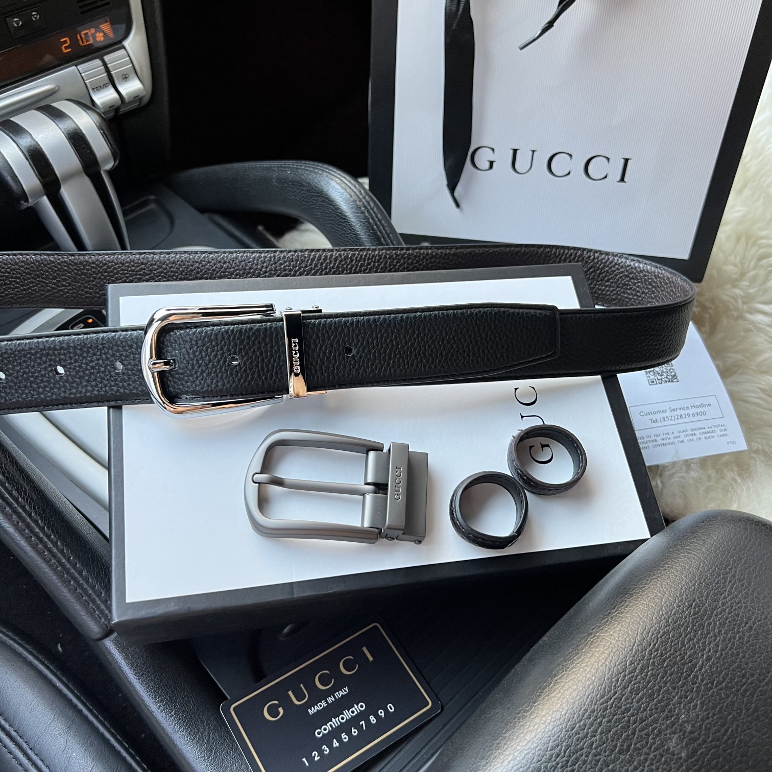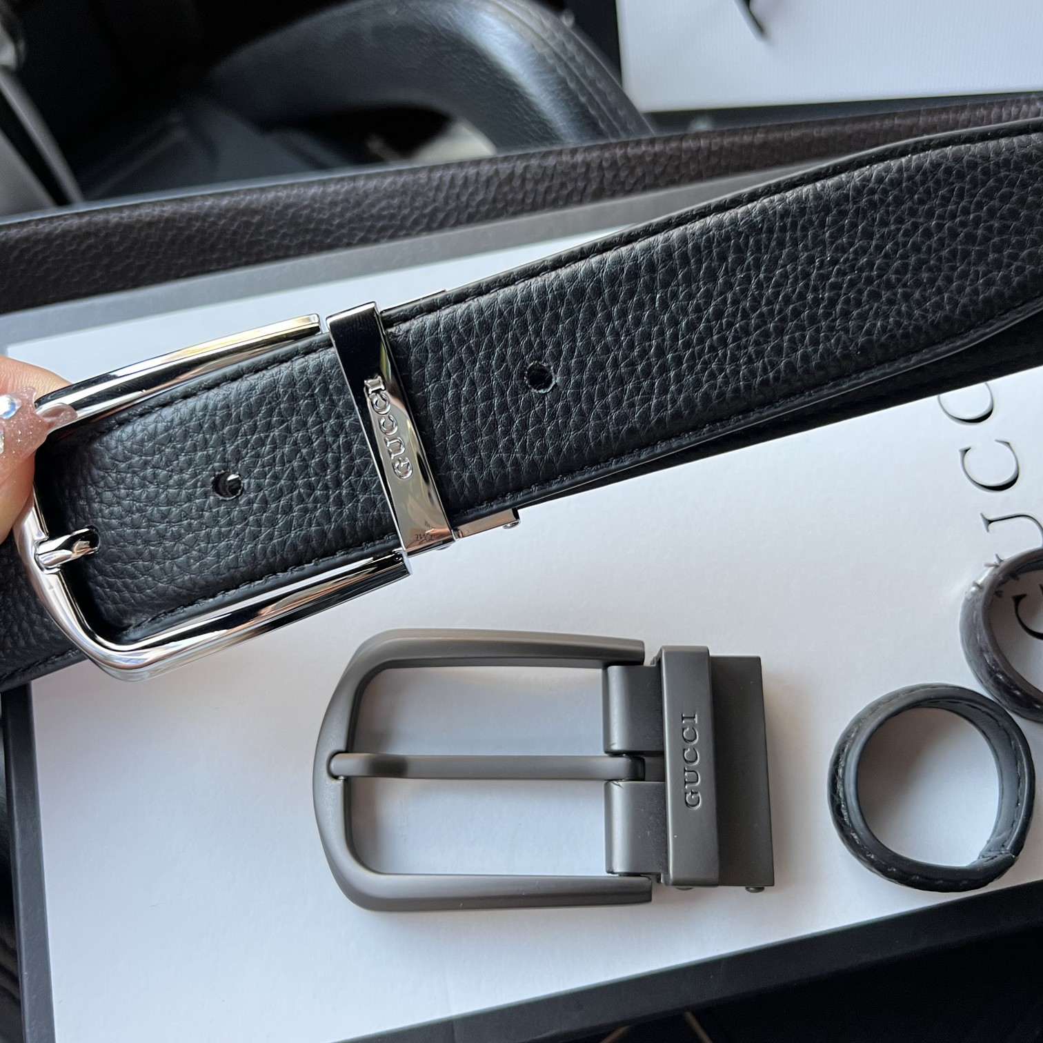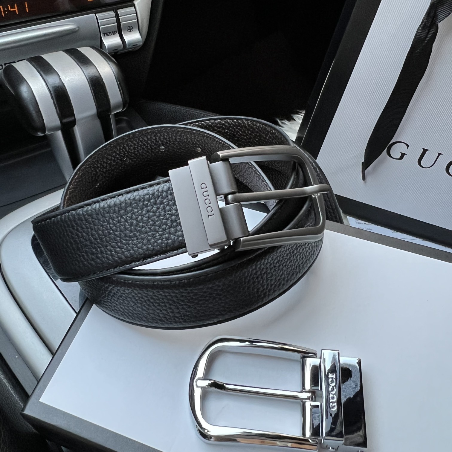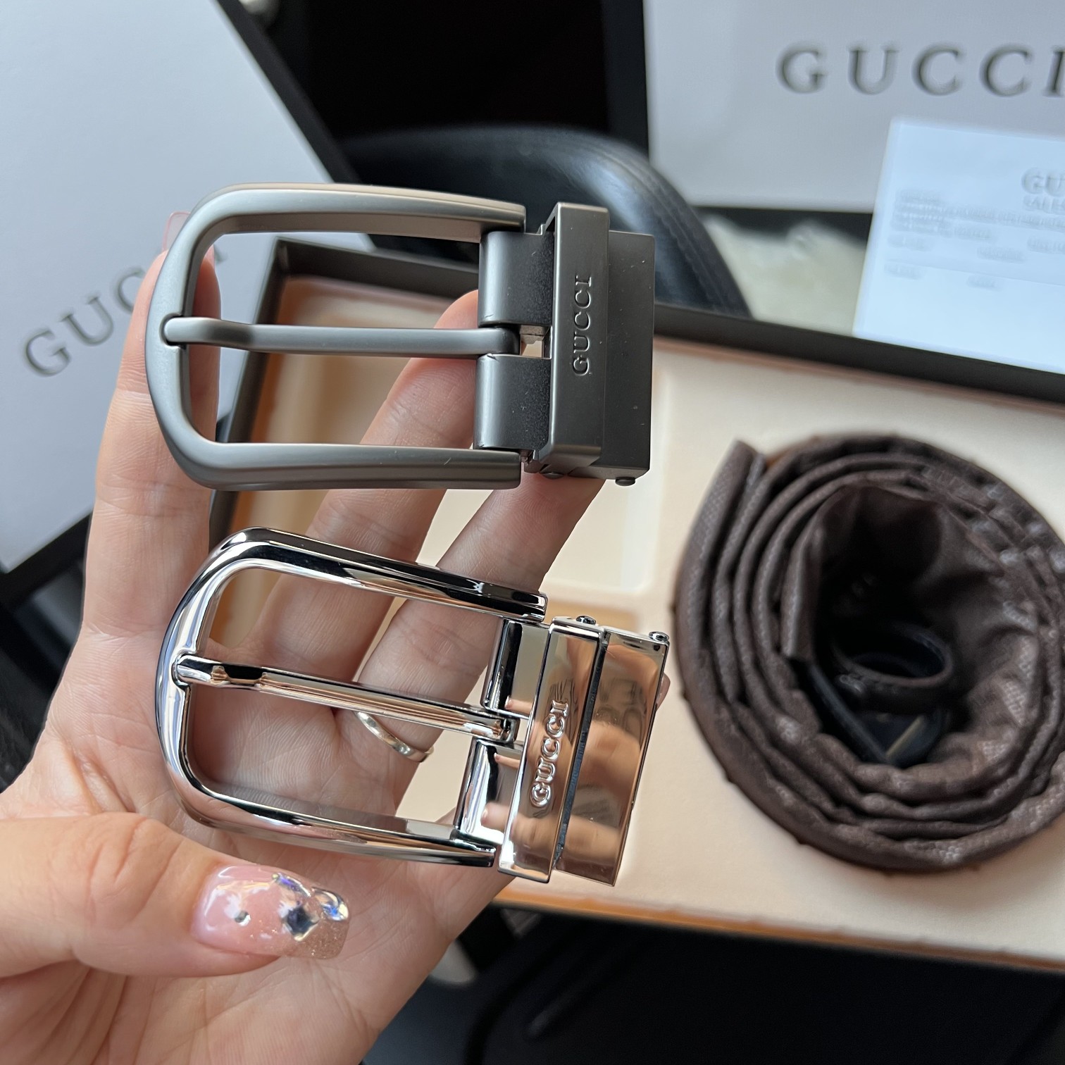古奇新款男士M双扣商务休闲皮带腰带礼盒装男士经典款,出口德国货!!一盒含:2个扣头+1条双面皮带!!带身一面黑色一面棕色。花了一条皮带的钱买四条!!标志性设计呈现给敢于追求内心热爱,开拓自我成功之路的年轻!!真正的低调奢华.. 均码可截断,全套包装! 宽度 3.5cm,长度 120cm。 东西好到爆...皮质手感 绝对罕见!!!牛皮材质,手感滑滑的很有光泽,在经过针扣压印工艺,手感更佳突出!!古奇顶级一线奢侈...男人必入款式...送男士礼物首选!这款万宝龙的皮带双面都可以使用,可商务可休闲,适合正装,也适合日常穿搭~想给男士选一款低调又不失品味的皮带,万宝龙这款一定要考虑,强烈推荐! 品名,古奇腰带 均码,长度:120