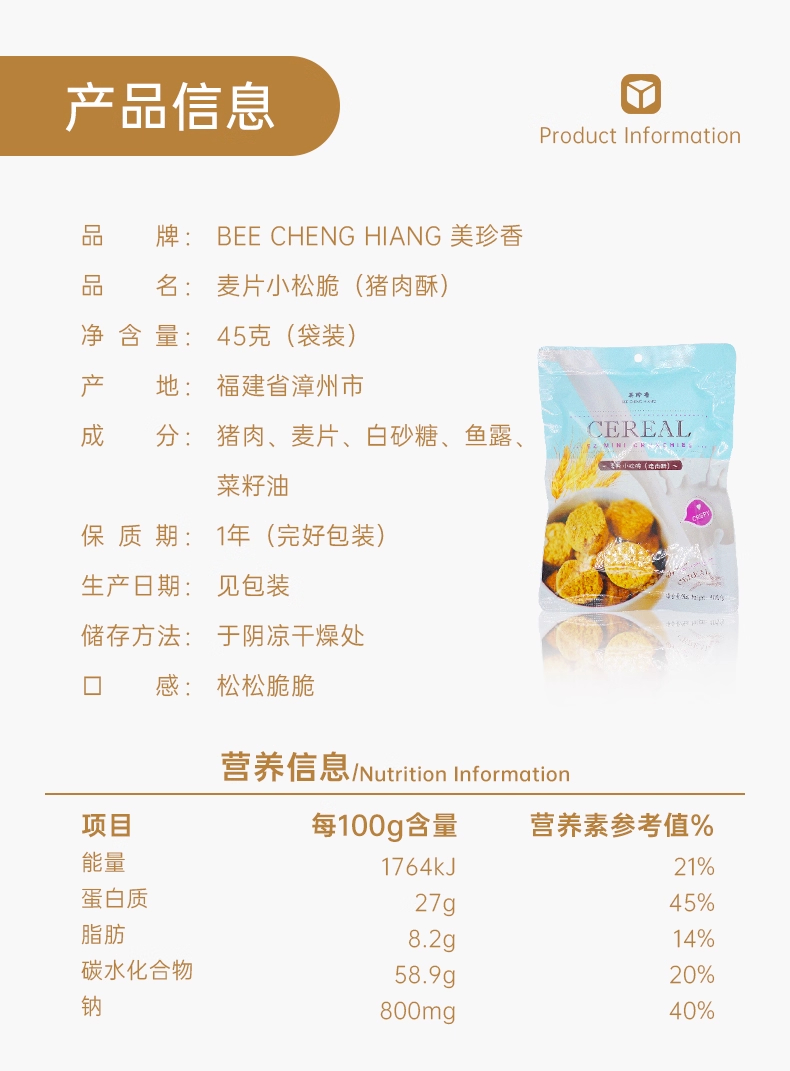 美珍香麦片小松脆(猪肉酥)45g营养休闲零食小吃新加坡风味特产
