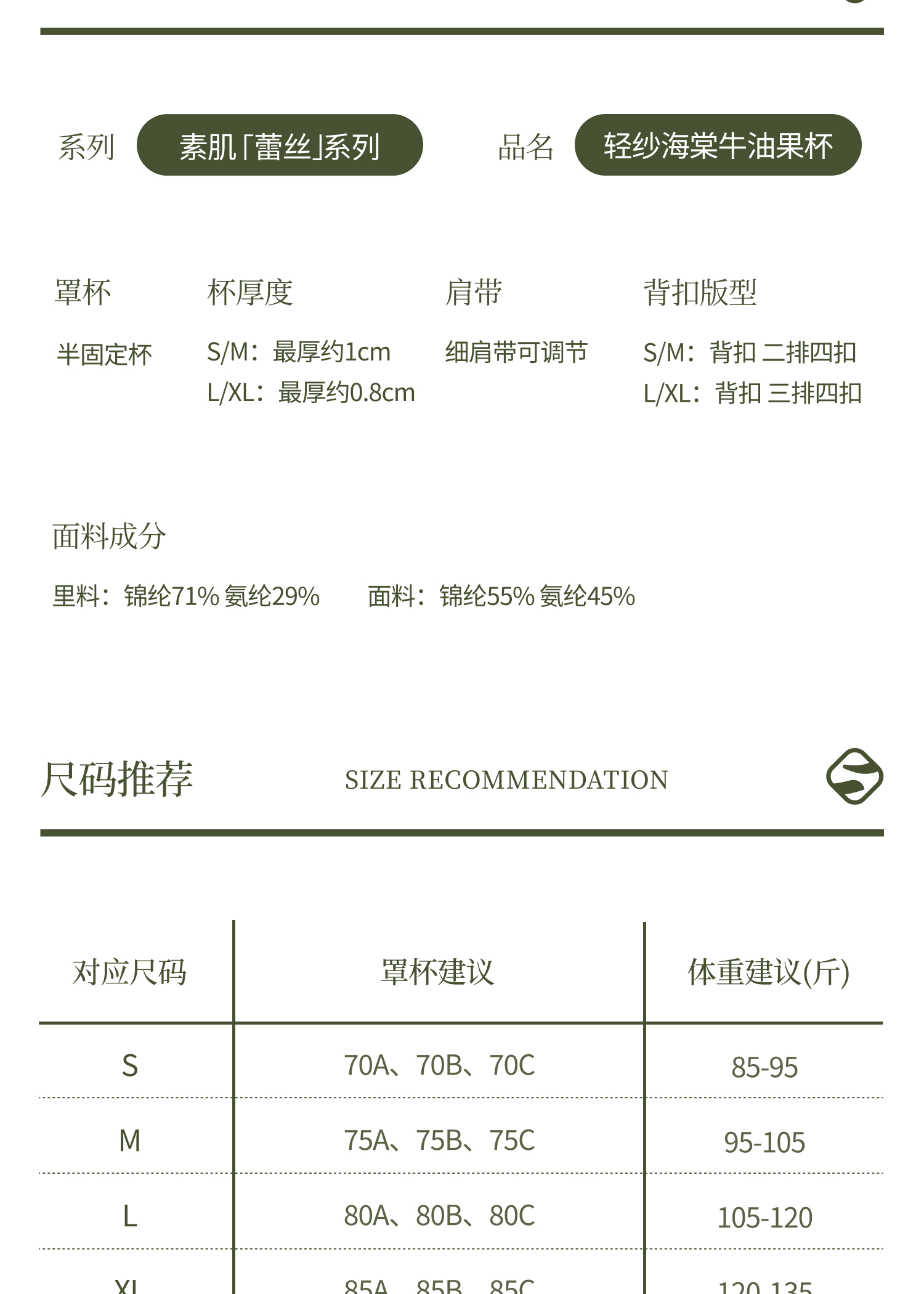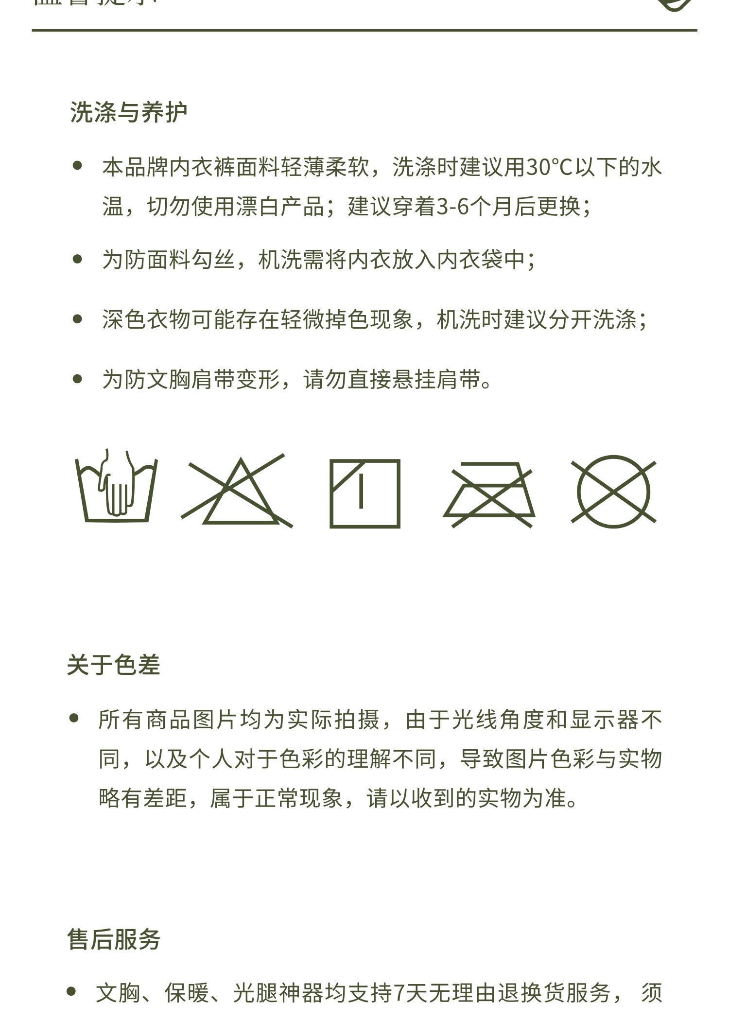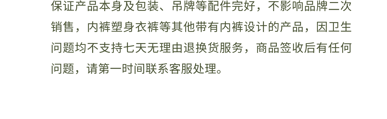 退换货规则:1.7天无理由退换货规则:品牌产品为贴身私密性衣物,务必保证所退产品吊牌水洗标齐全,无人为因素导致的破损、污渍、异味等影响二次销售的状况,否则,品牌有权不予退货退款,退货请将赠品一同寄回。内裤不支持7天无理由退换。换货差价将遵循多退少补的原则。