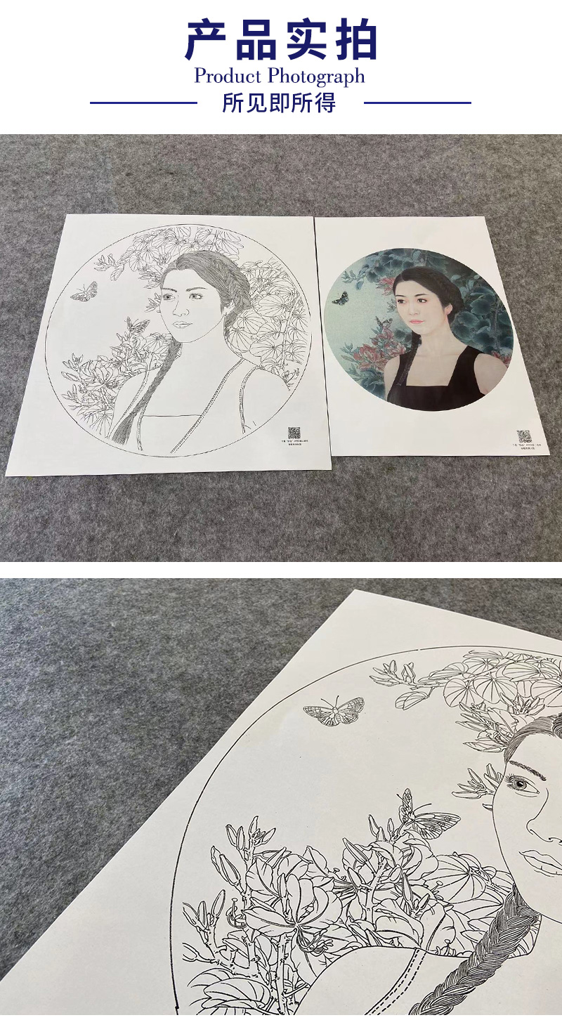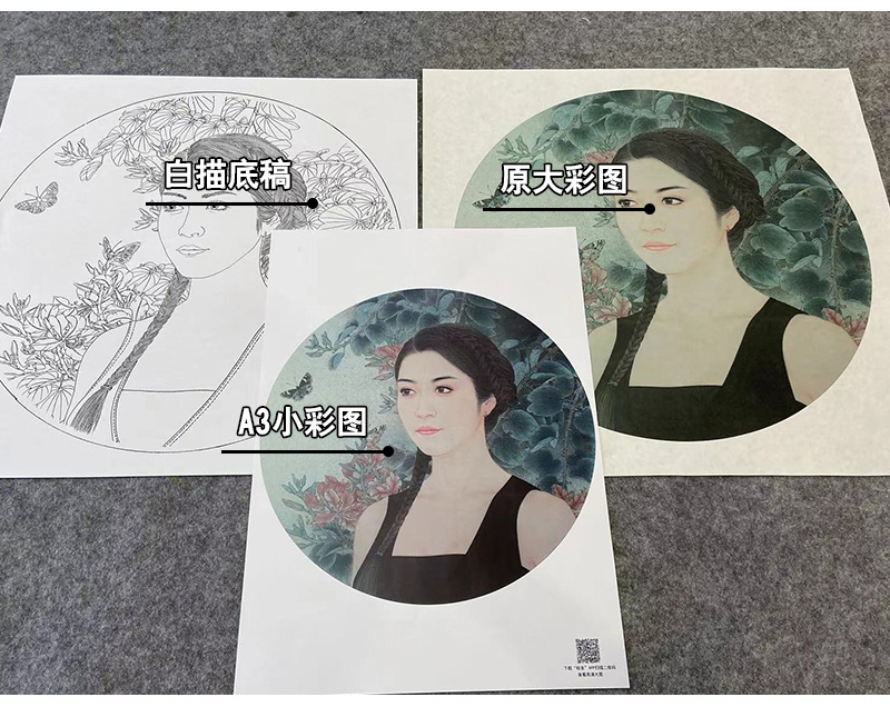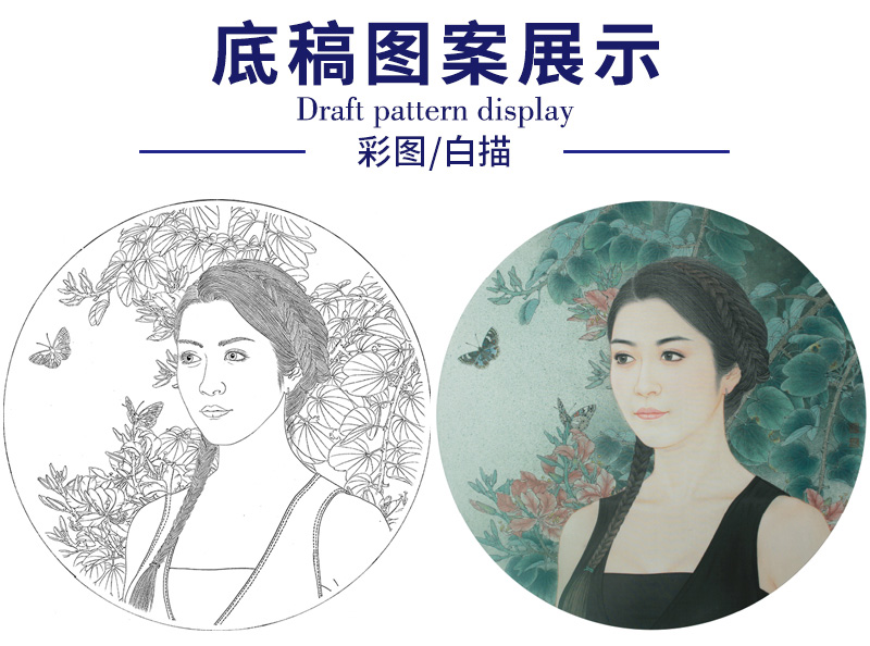 【大彩图】盘虎杰工笔画白描底稿圆形小品《花弄影》现代人物高清打印稿HJ28