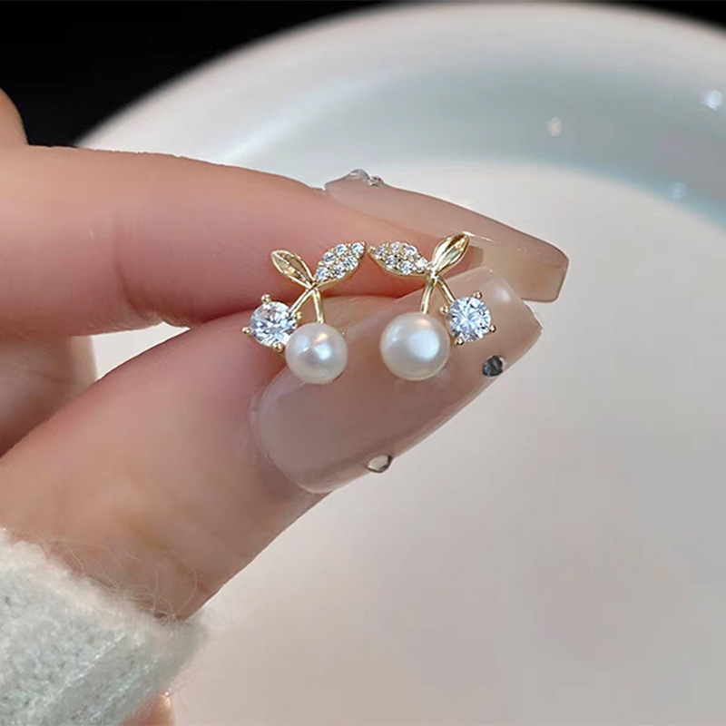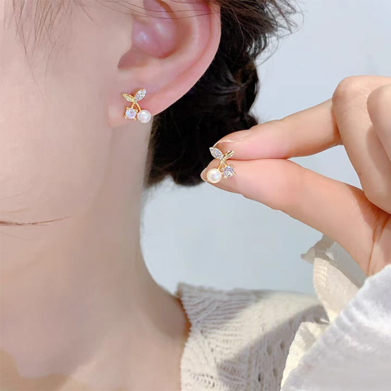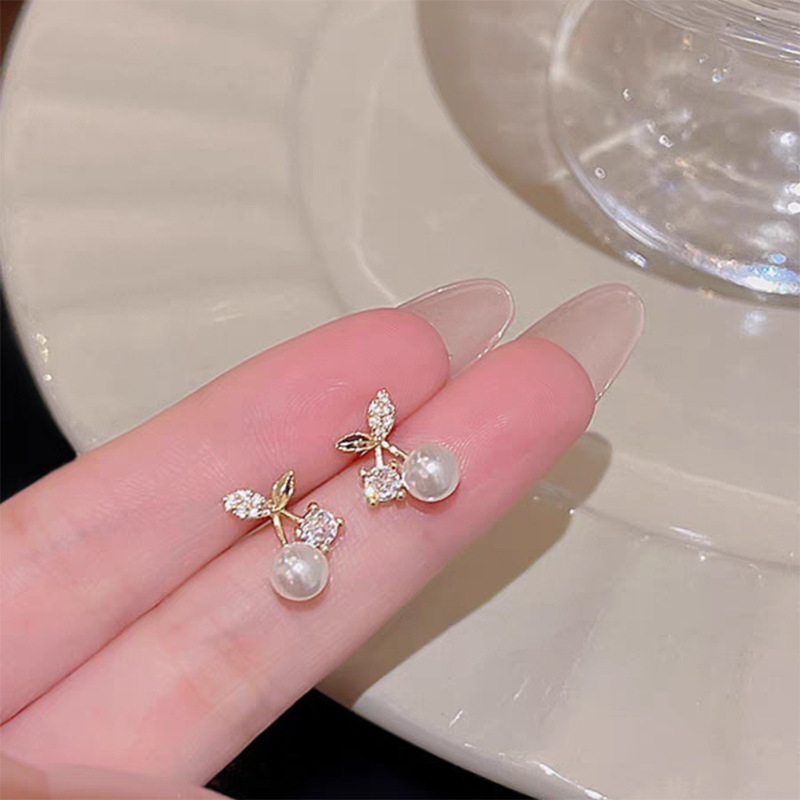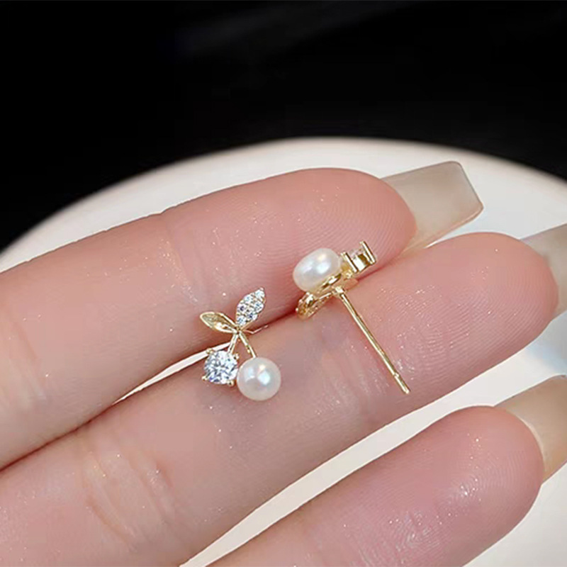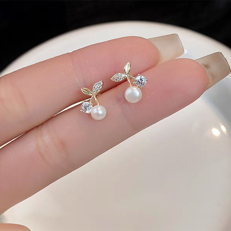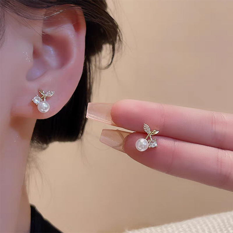 JU-B-0021樱桃气质精致微镶锆石树叶耳钉韩国新款轻奢小众简约迷你珍珠耳钉