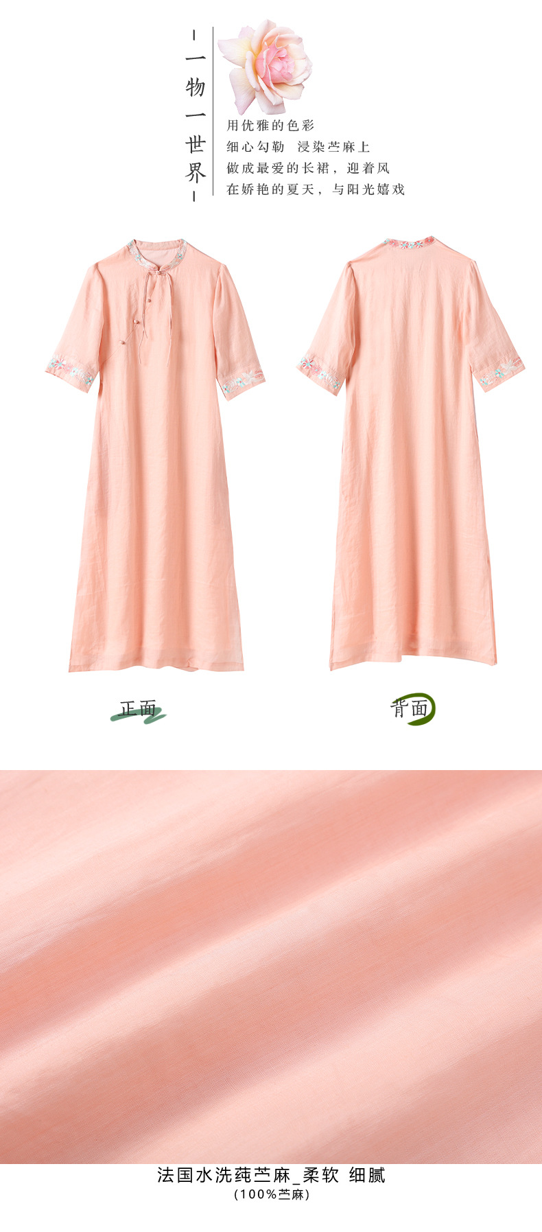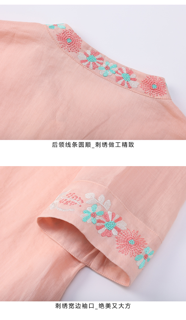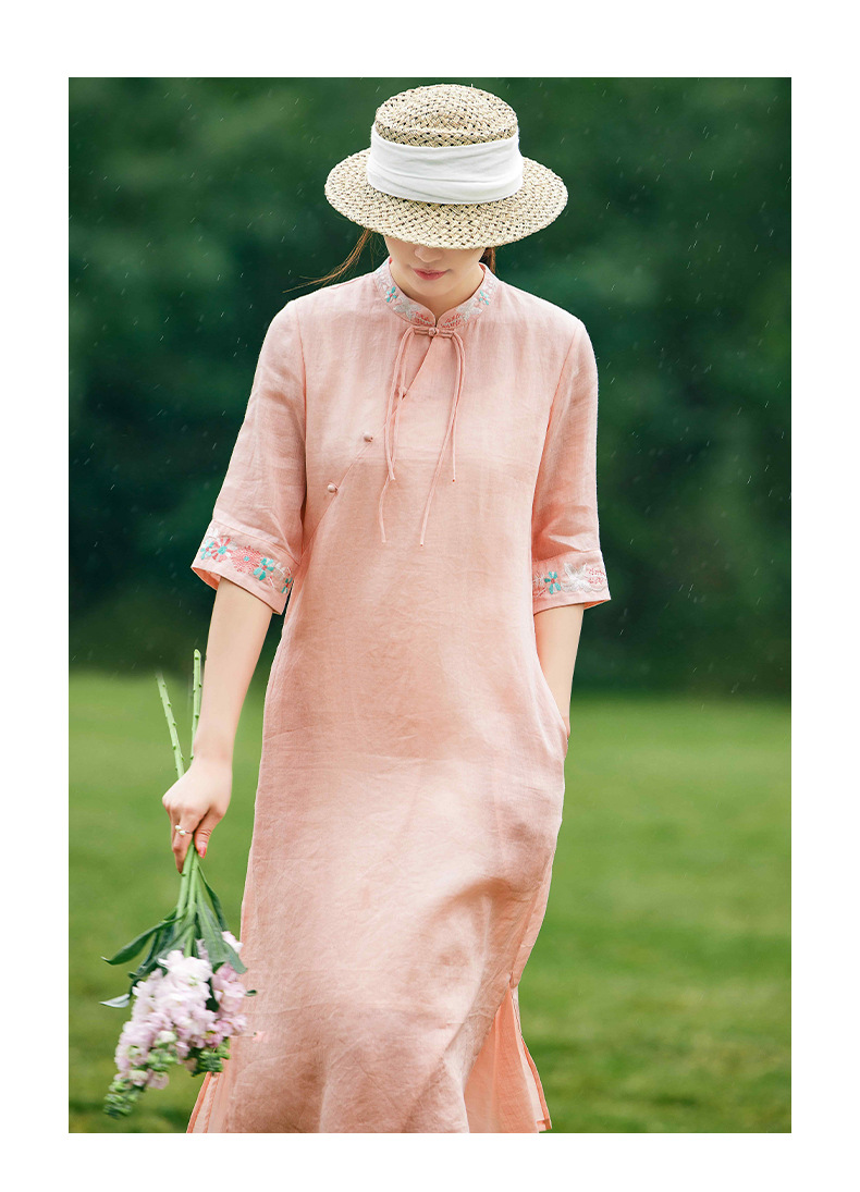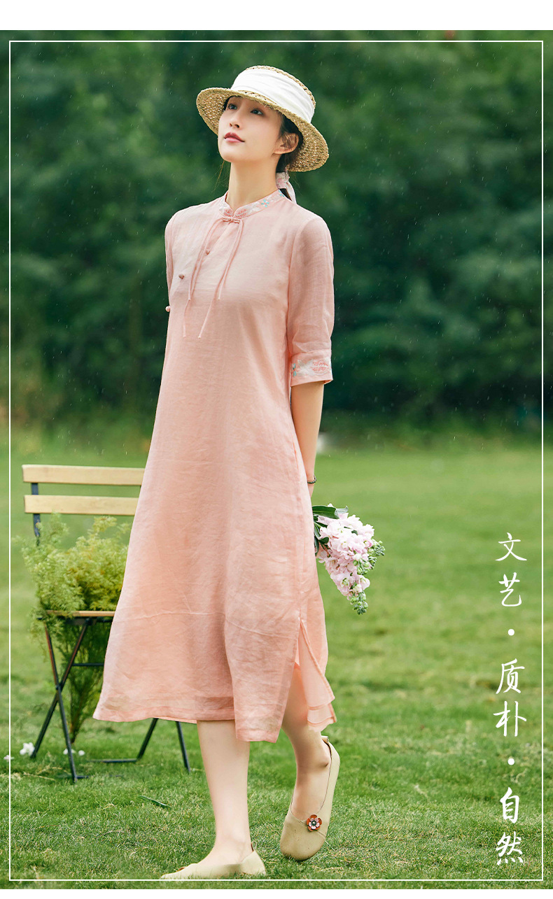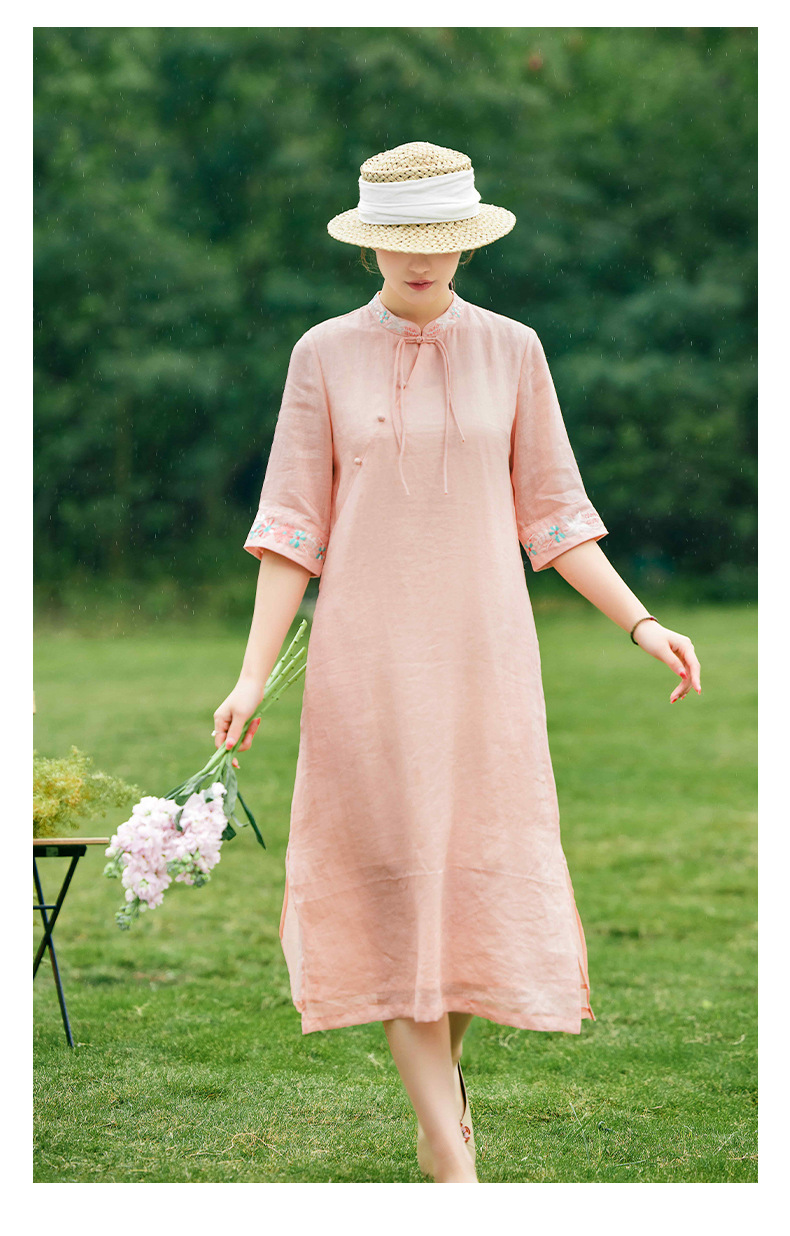 HM-S357春夏新款新中式刺绣改良旗袍苎麻文艺国风盘扣仙绣花连衣裙