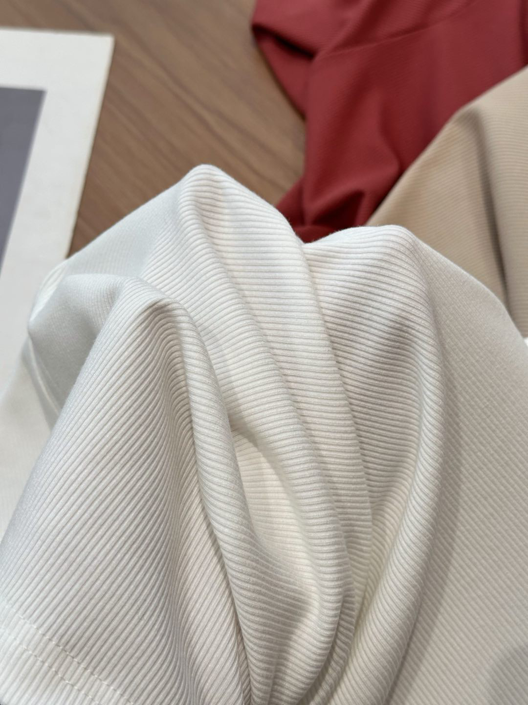罗纹肌理感摸起来却有丝般滑爽,氨纶的加入使面料更具有弹性,运动健身穿着都毫无压力。上身无论是正面侧面,视觉上都特别显薄!!!!