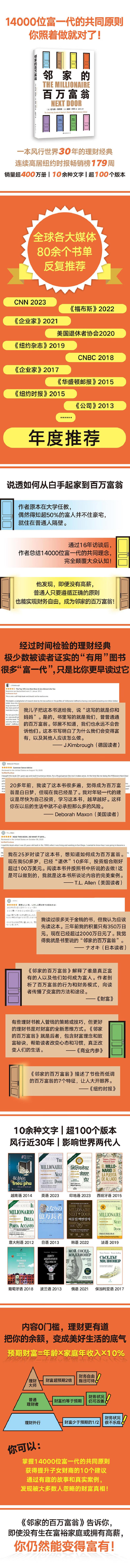 这一主题颠覆了对富人的固有认知,触动了公众心弦,很快登上《纽约时报》图书榜并连续在榜179周,随后风行近30年,以10余种文字、超100个版本售出超400万册。包括作者在内的很多人开始践行书中的核心理念,向成为邻家的百万富翁稳步迈进。他们一致认为:变富比炫富更重要;即便没有高薪,只要遵循正确的原则,普通人一样能实现财务自由。