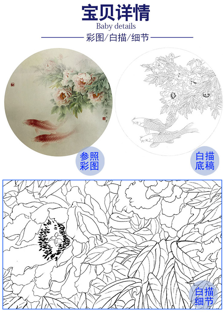 龚雪青工笔花鸟白描底稿-牡丹鲤鱼小品-多种白描尺寸可选-XQ11