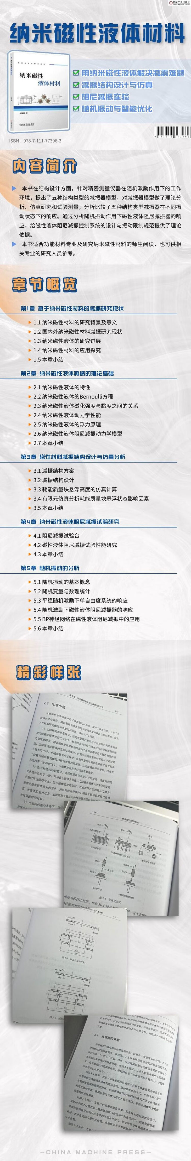 是一本专注于纳米磁性液体在减振领域应用的著作。磁性液体是一种特殊的功能材料,既具有固体磁性材料的磁性,又具有液体材料的流动性,同时具有普通液体不具备的二阶浮力,磁性液体的这些特殊性质使其在阻尼减振领域的应用前景十分广阔。本书系统介绍了纳米磁性液体的特性及其在精密测量仪器减振中的应用,结合理论分析、仿真模拟和实验验证,提出了基于二阶浮力原理的减振器设计方法,为精密仪器的振动控制提供了创新解决方案。