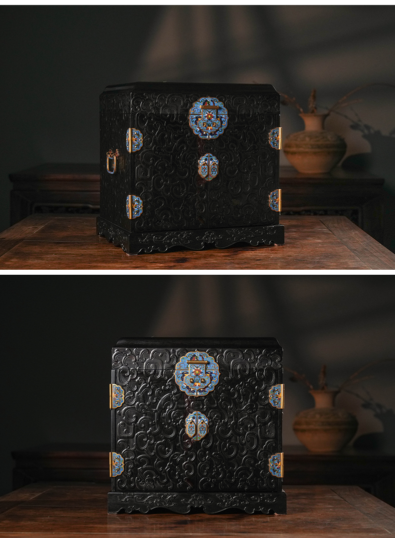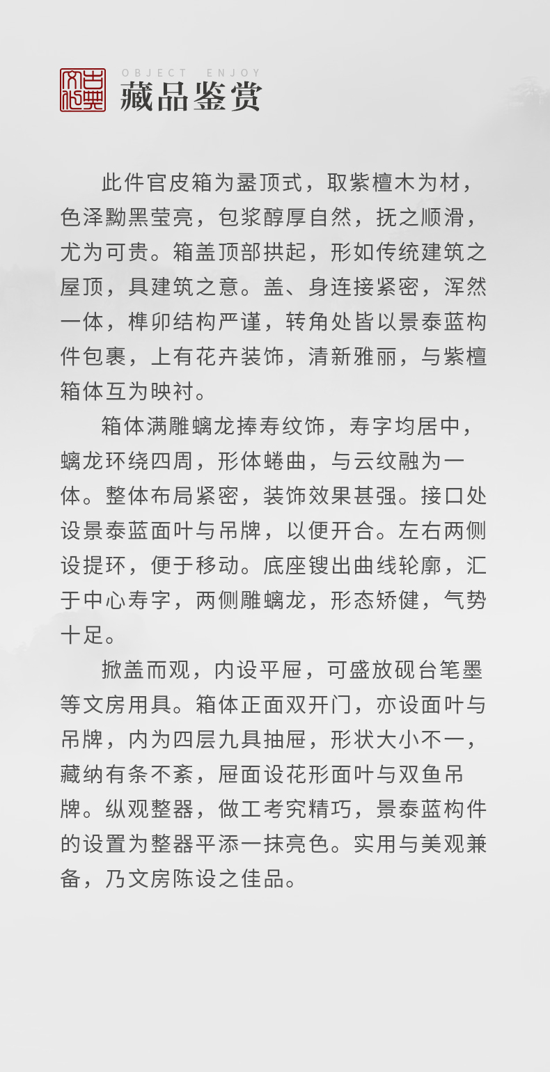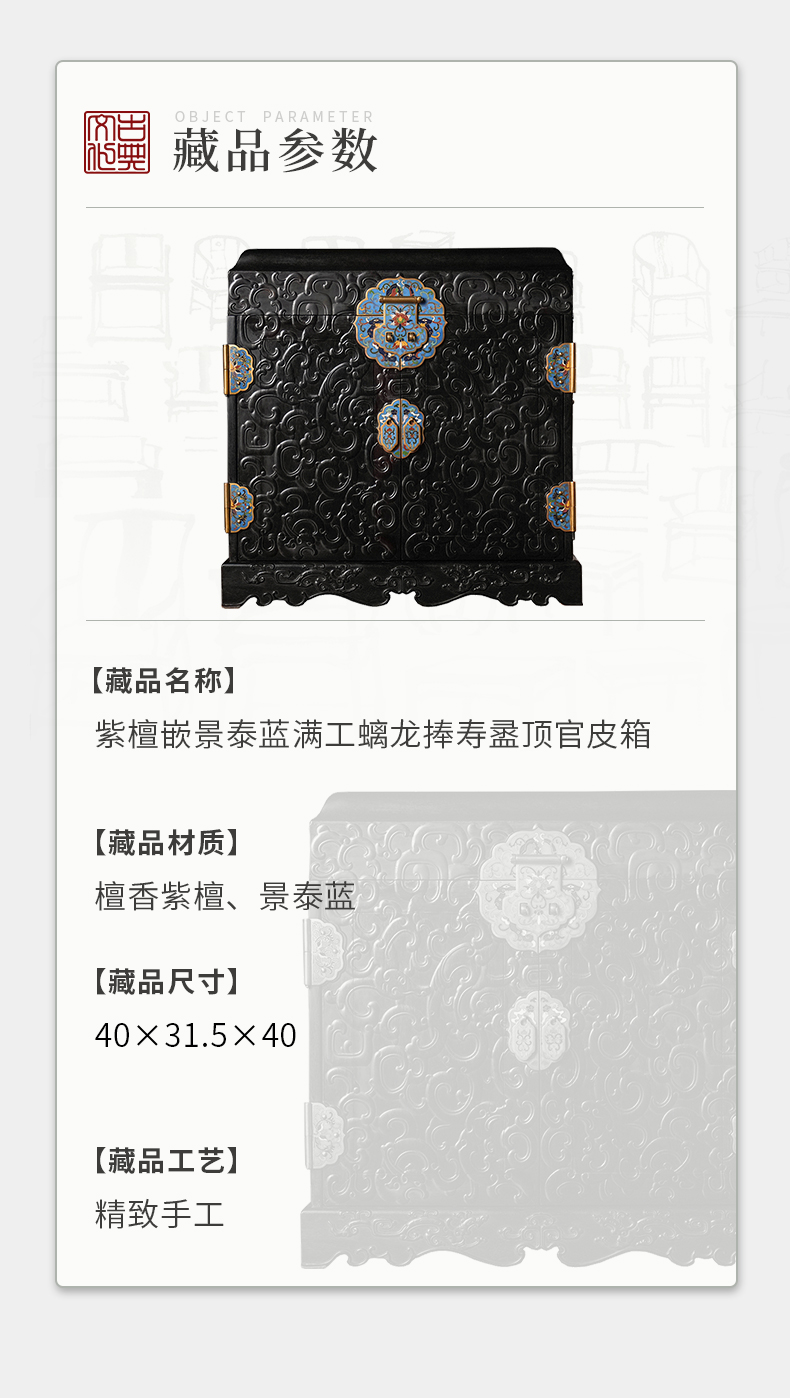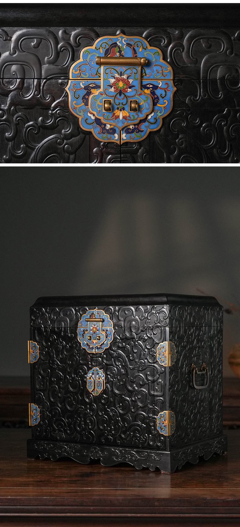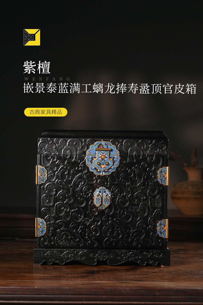 紫檀嵌景泰蓝满工螭龙捧寿盝顶官皮箱