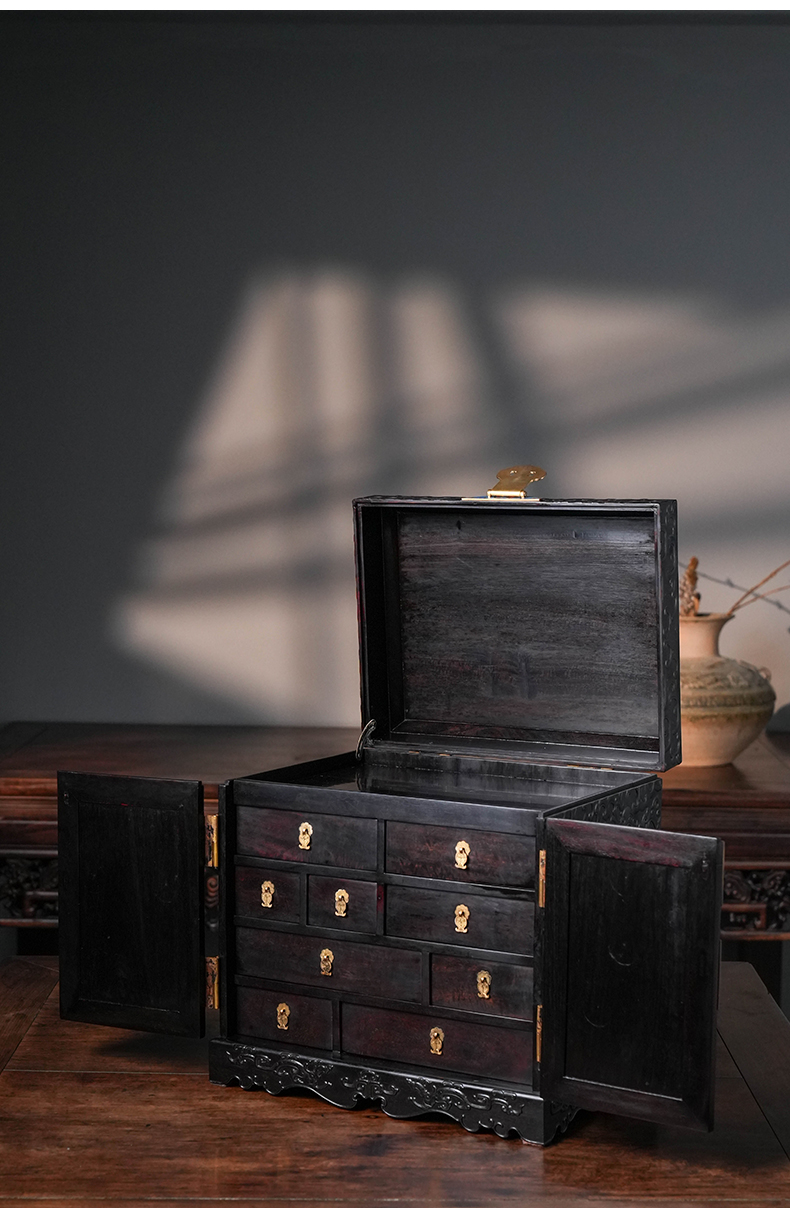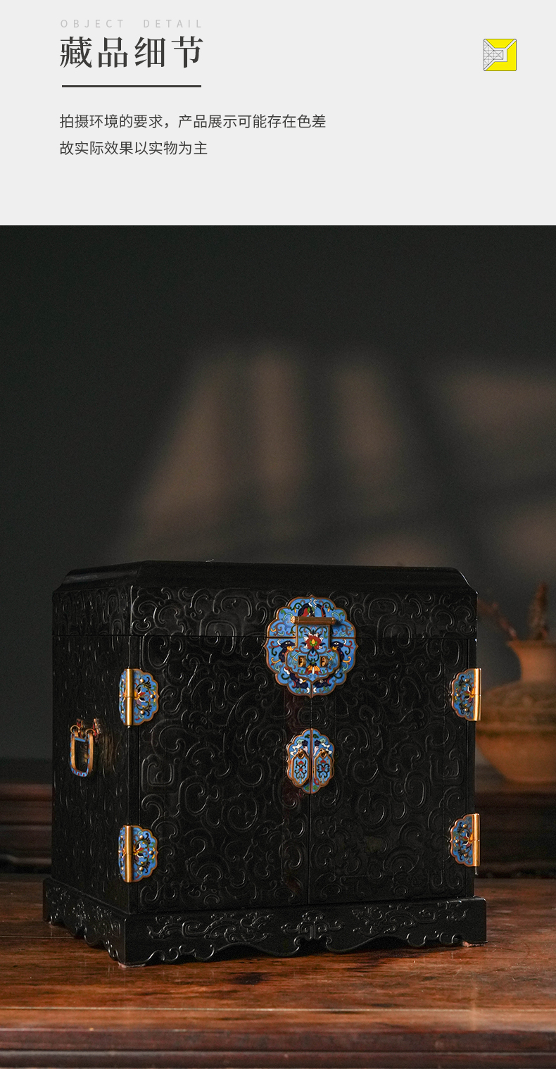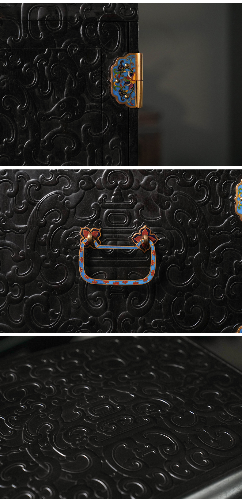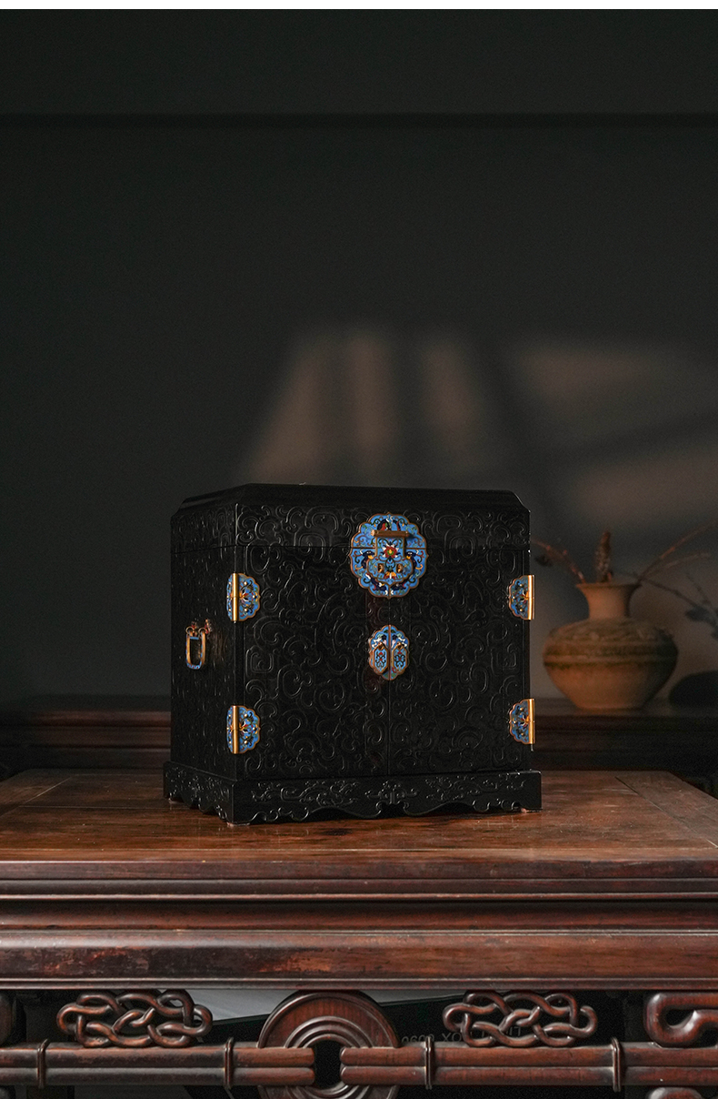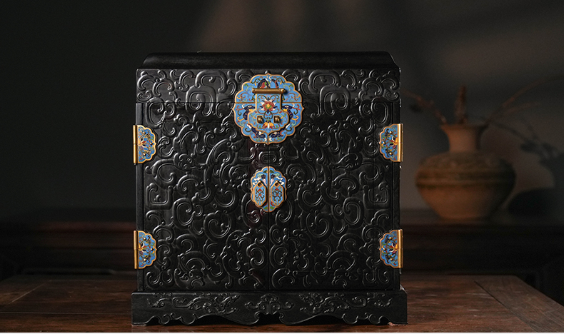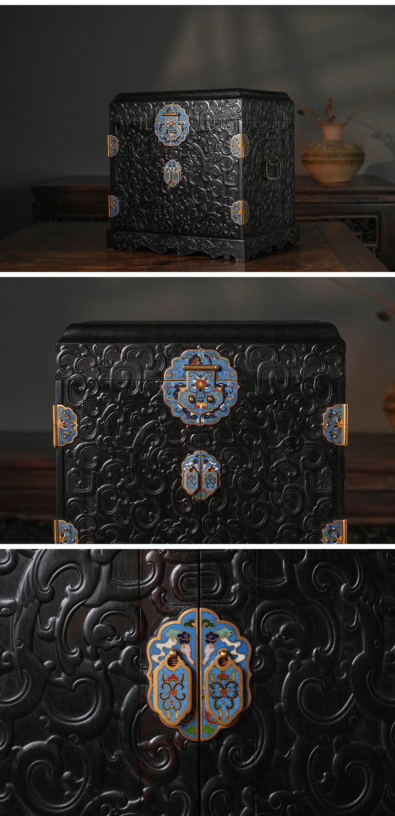 紫檀嵌景泰蓝满工螭龙捧寿盝顶官皮箱