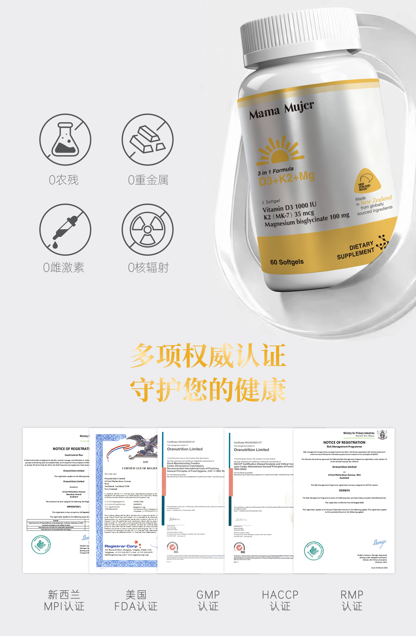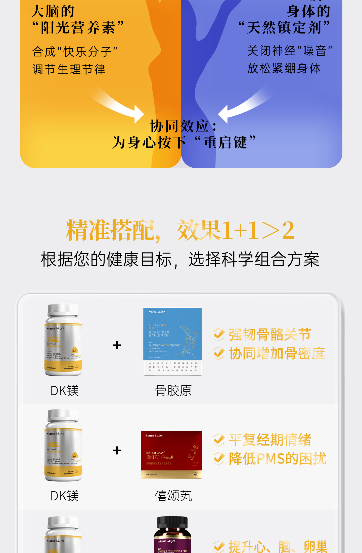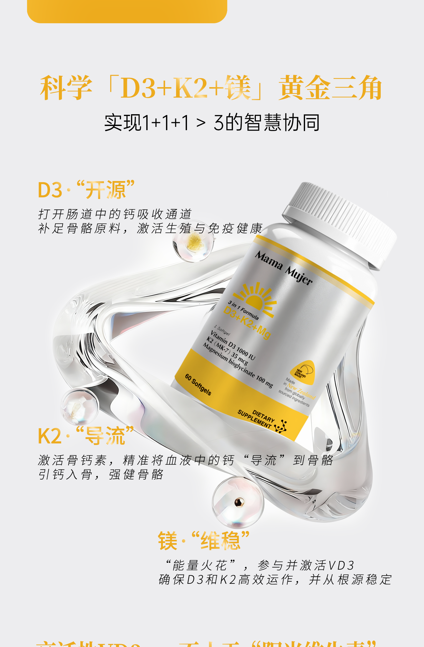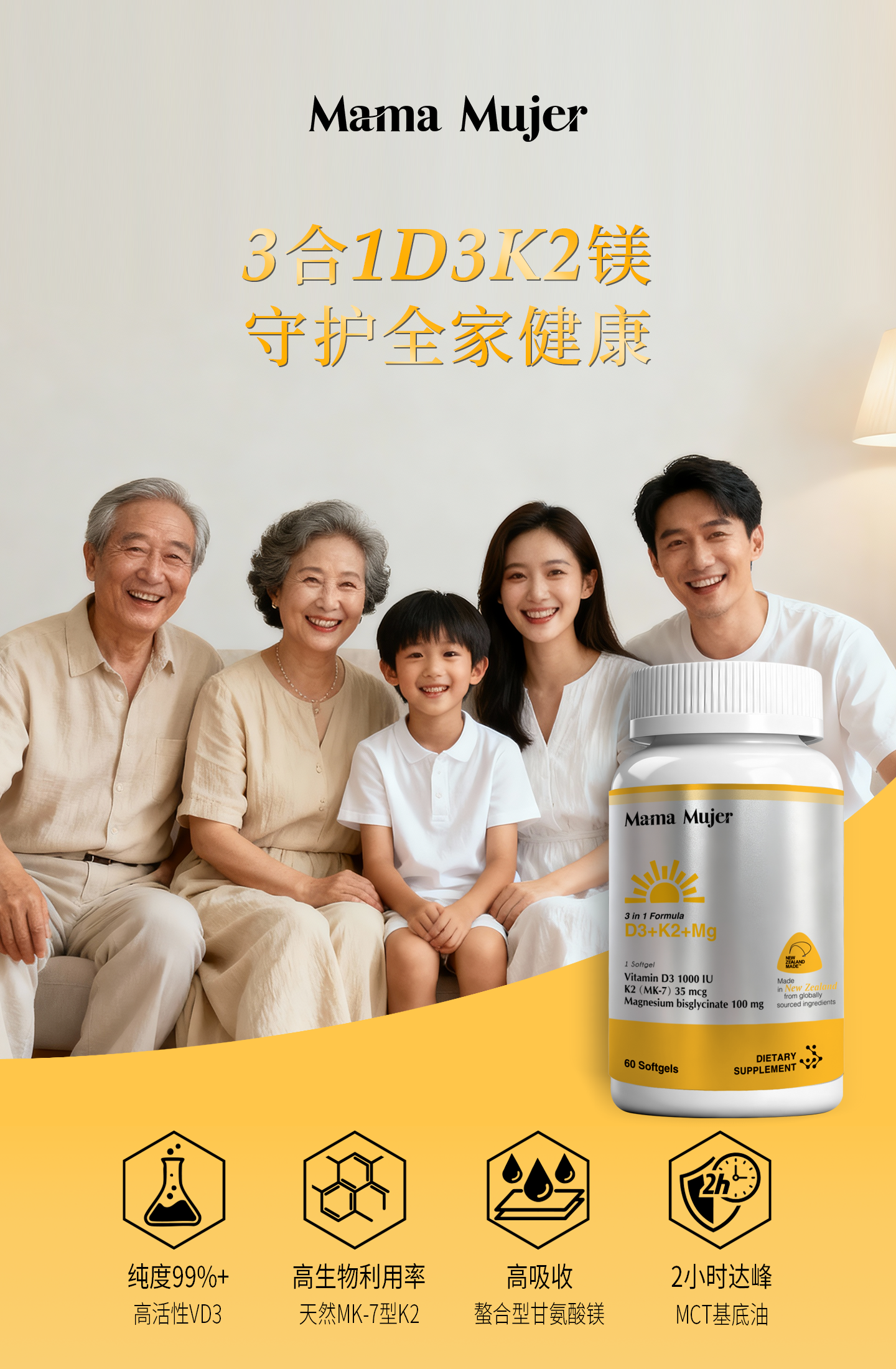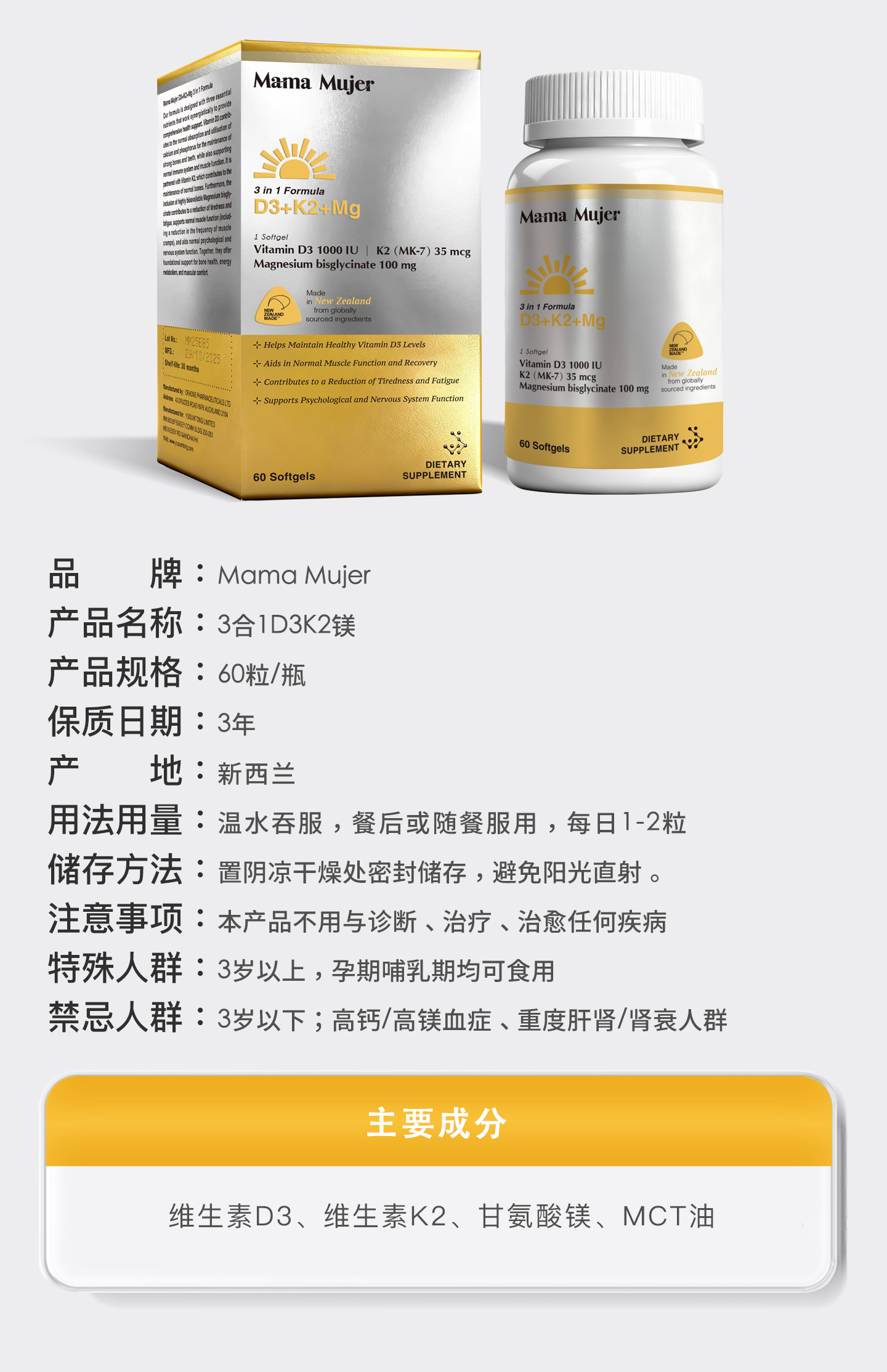 【最后库存】【下一批5月】【东亚女性缺VD】Mama Mujer 3合1 VD镁 2000iu高活性VD3 中国营养协会推荐量 全家补充 K2 甘氨酸镁 钙补不到骨 偏头痛 60粒/瓶 MMMJ海淘