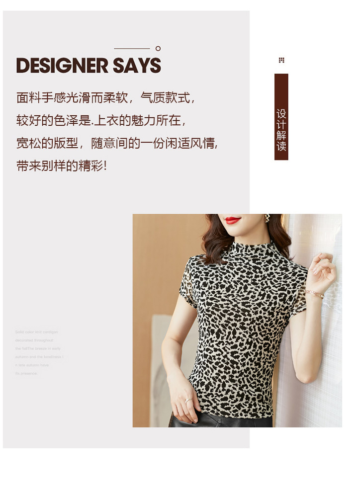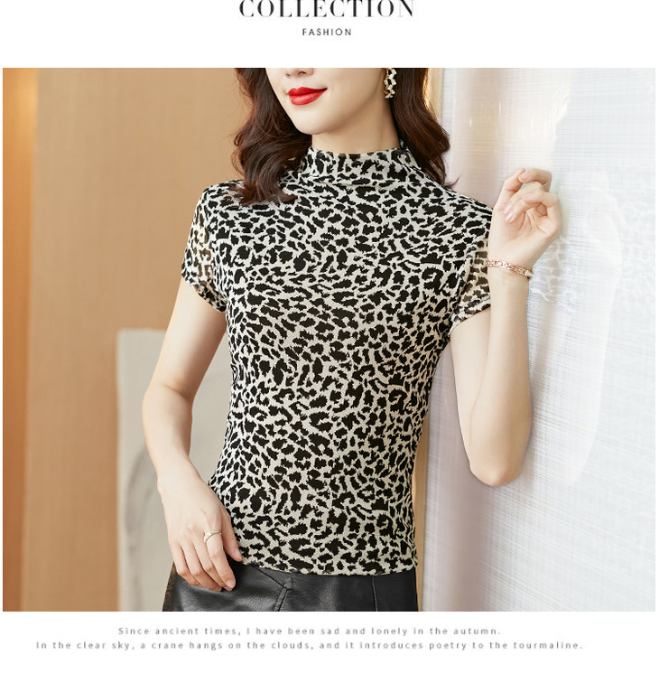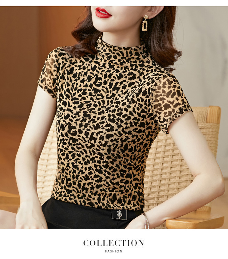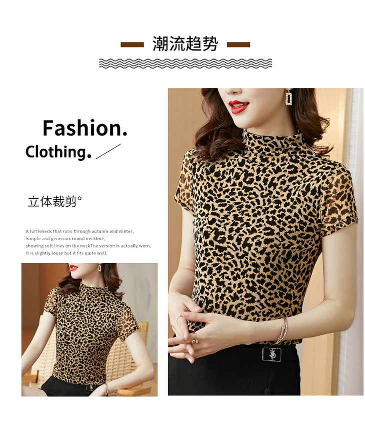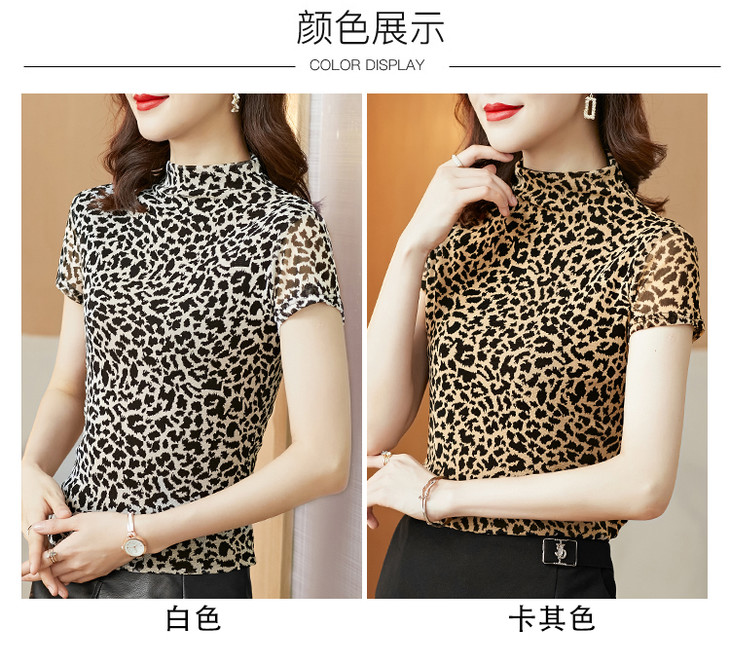 KQL-E001M60472021秋季新款时尚网纱印花豹纹半高领内搭外穿短袖女修身显瘦T恤