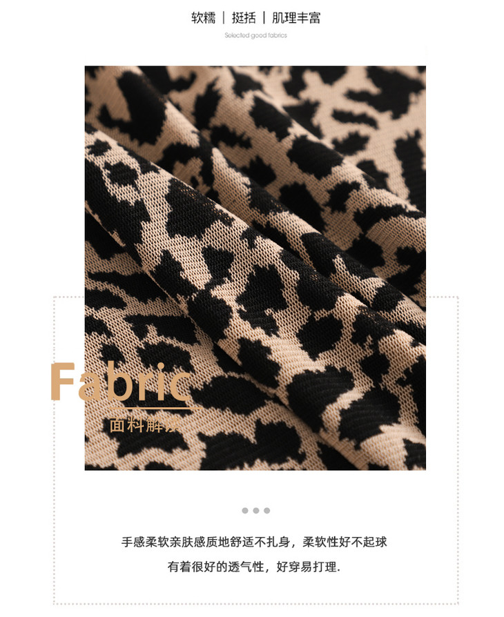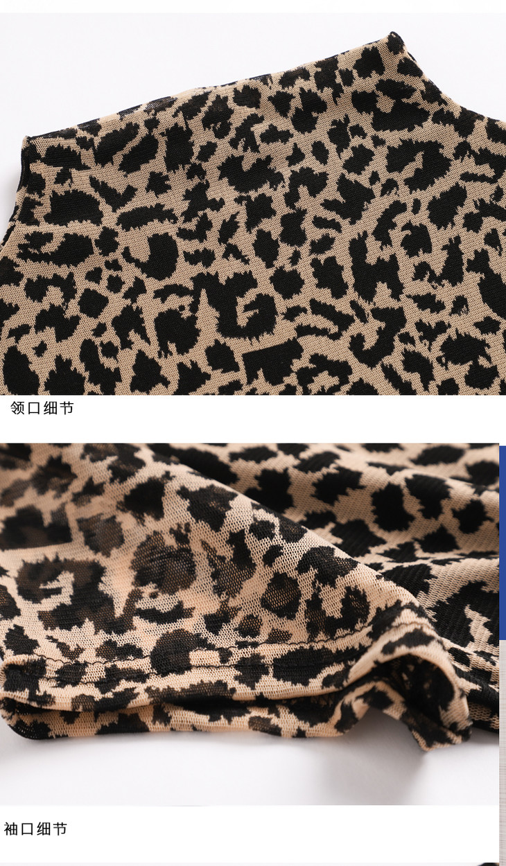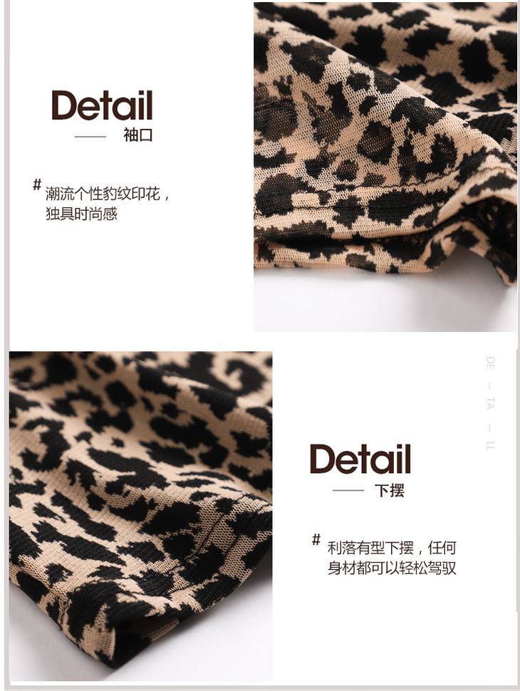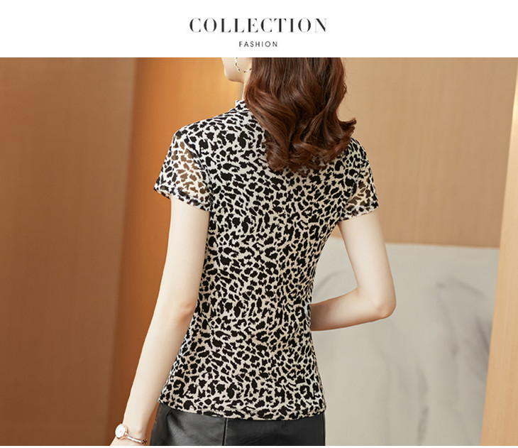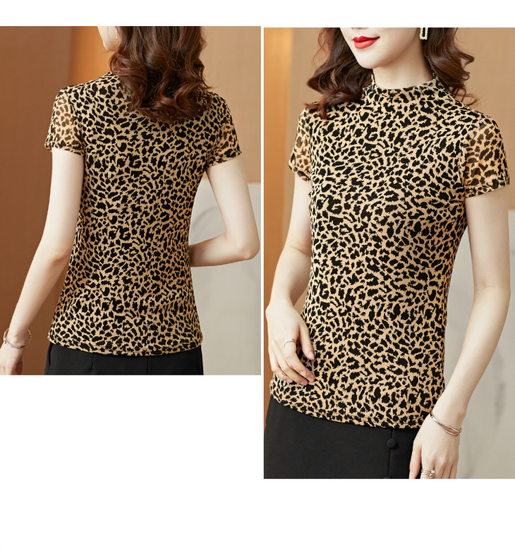 KQL-E001M60472021秋季新款时尚网纱印花豹纹半高领内搭外穿短袖女修身显瘦T恤