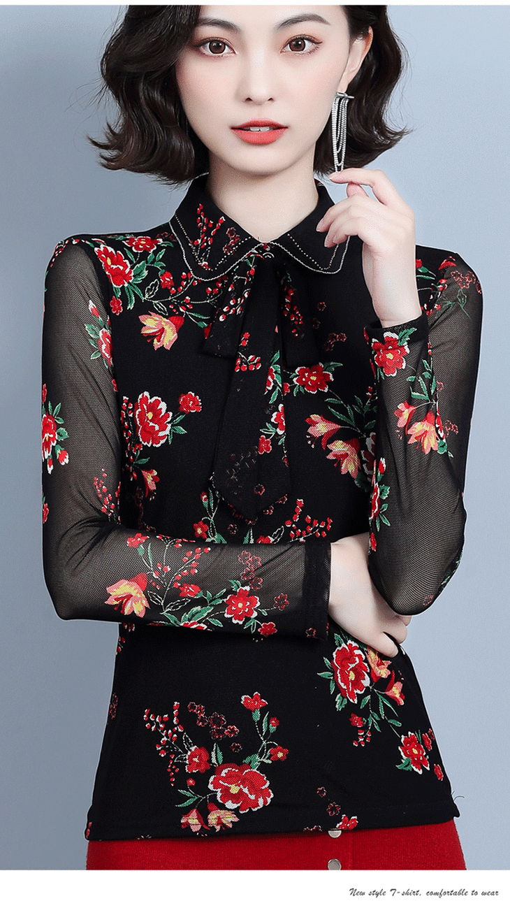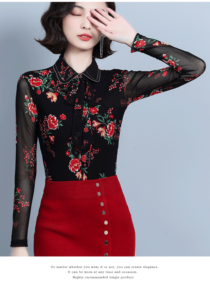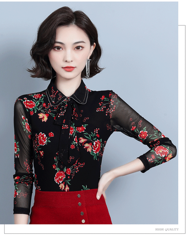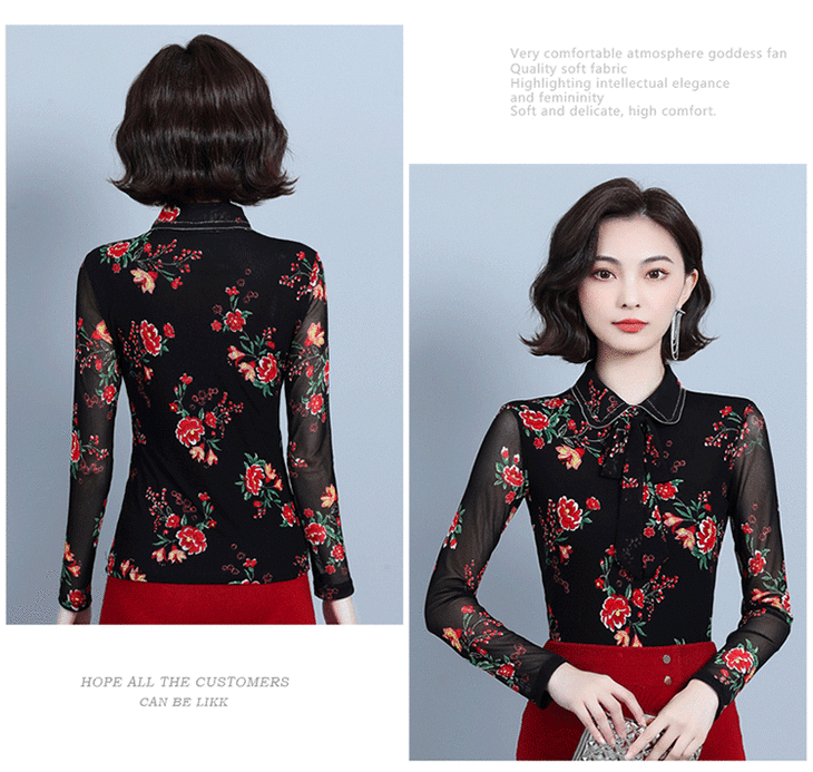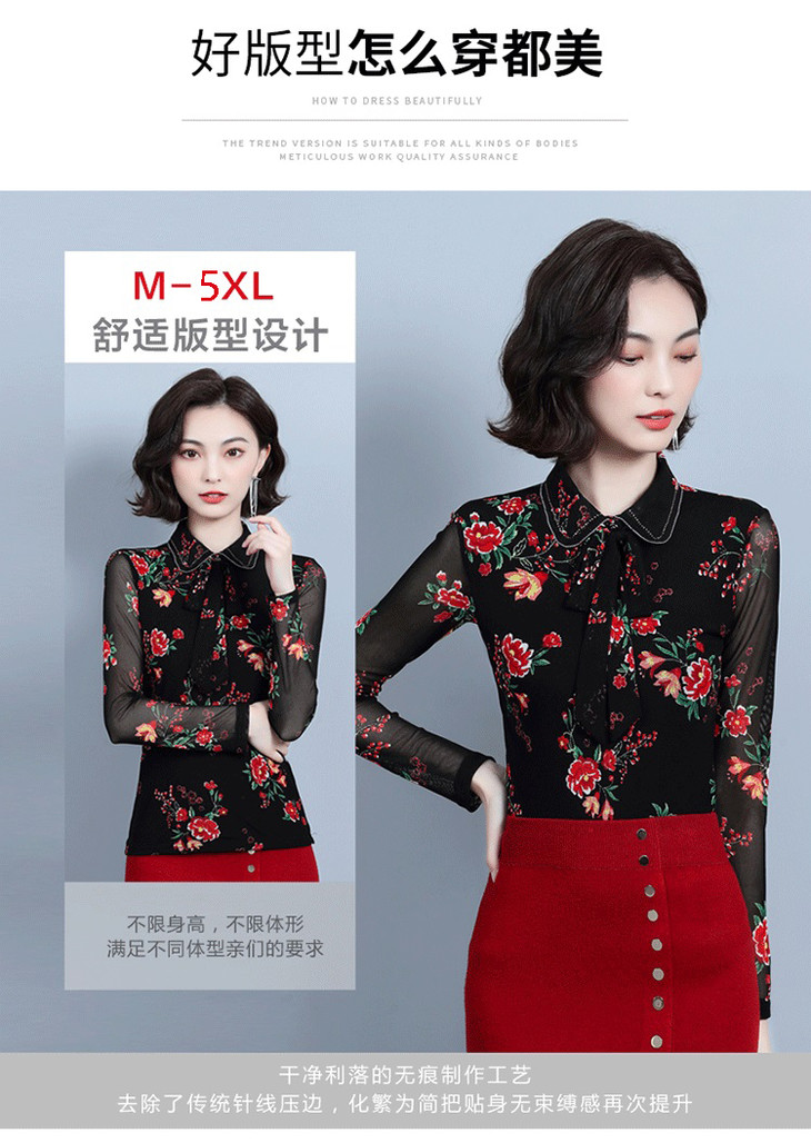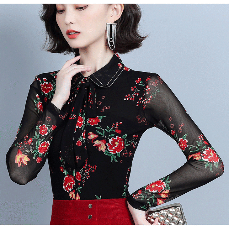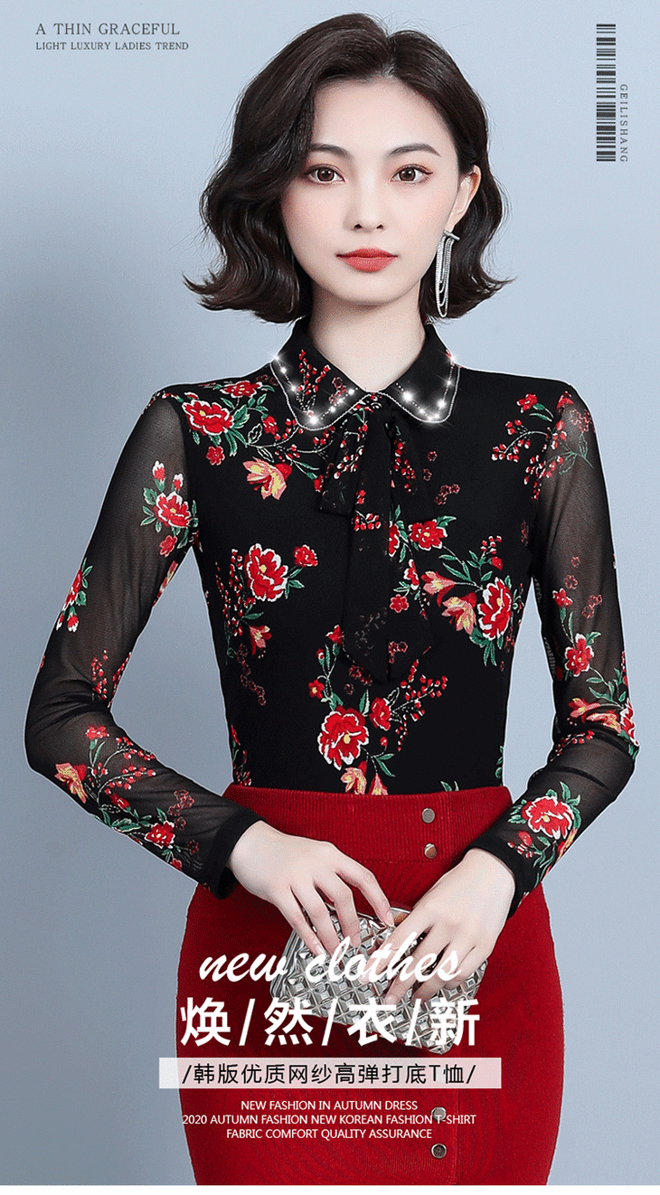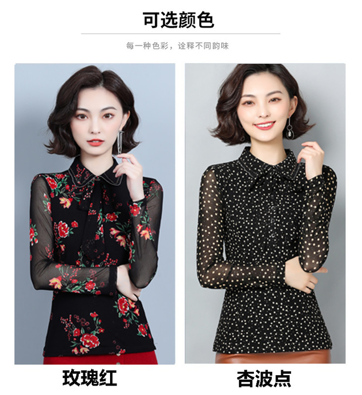 MZ-MZ6200秋季新款时尚翻领弹力网纱印花小衫