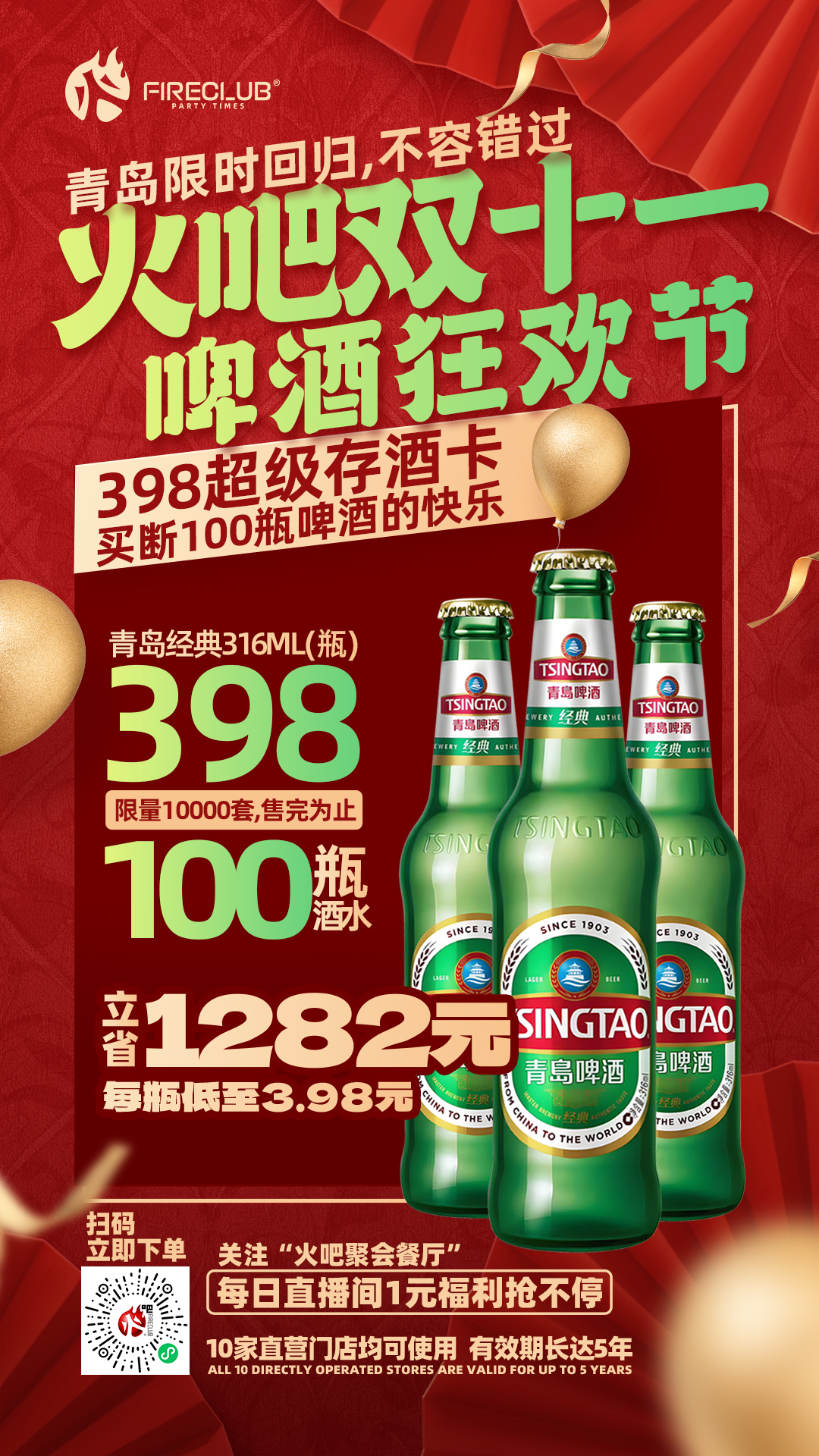 【兰州通用】双11火吧啤酒节—超值存酒卡—398元100瓶青岛经典316ml