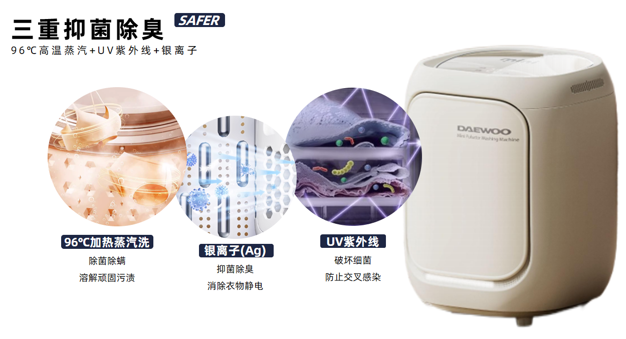 3、【高温清洗】:96°高温煮洗,高温溶解衣物污渍,UV紫外线和银离子,除菌除螨的同时抑制细菌再生长;