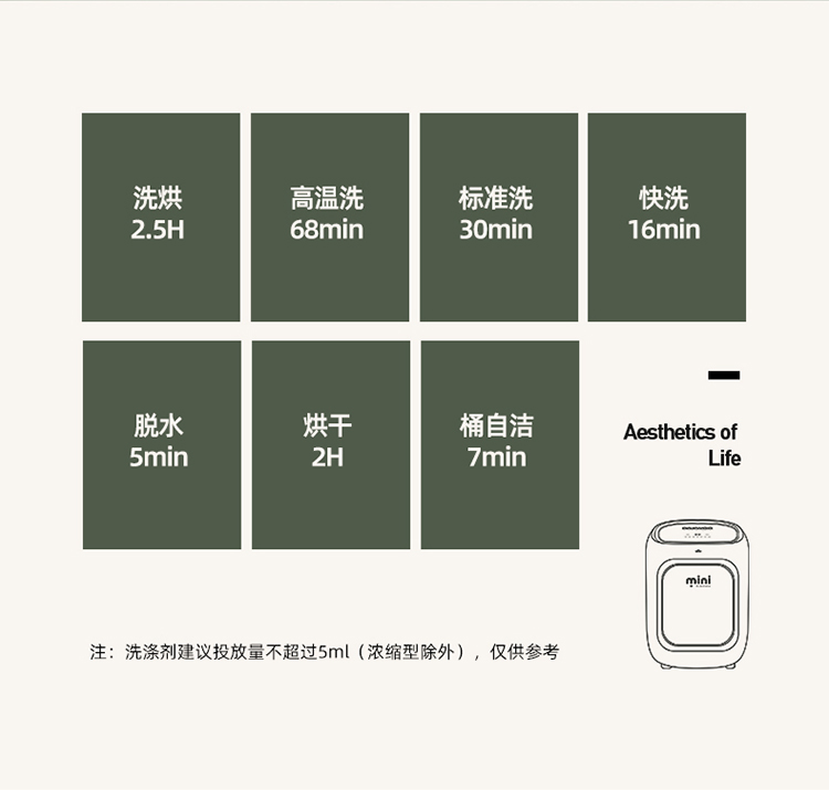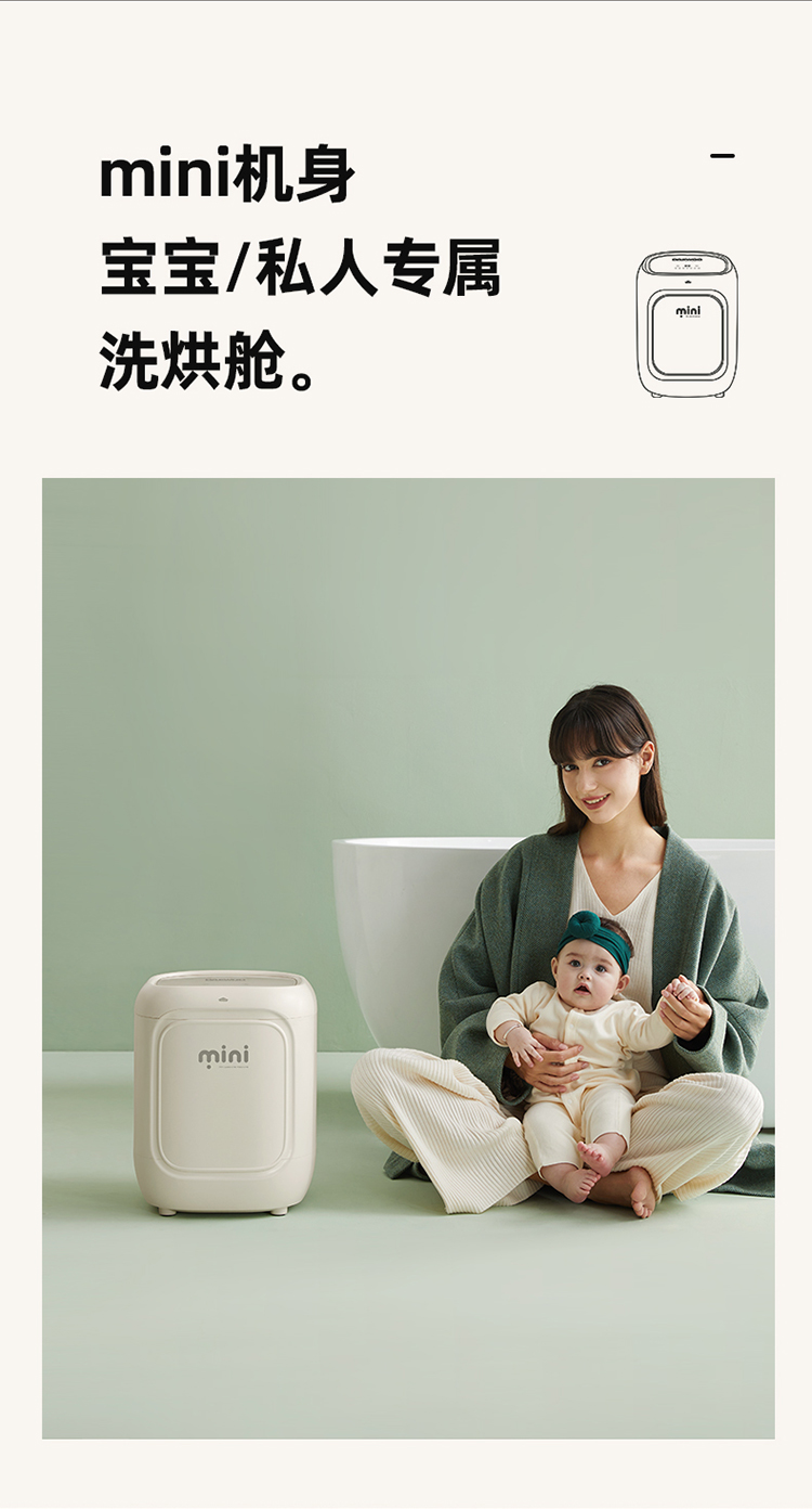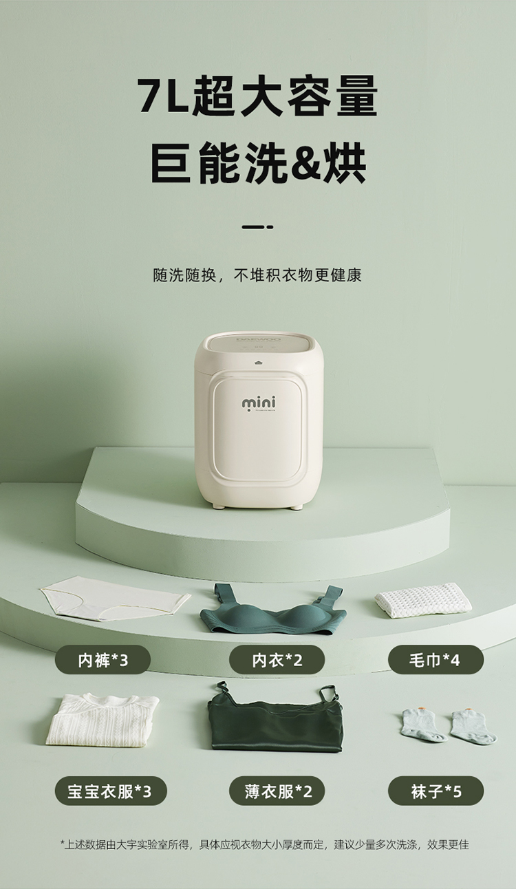 4、【黄金容量】:7L超大容量,巨能洗&烘,随洗随换,不堆积衣物更健康,专属私人/宝宝的洗烘舱;