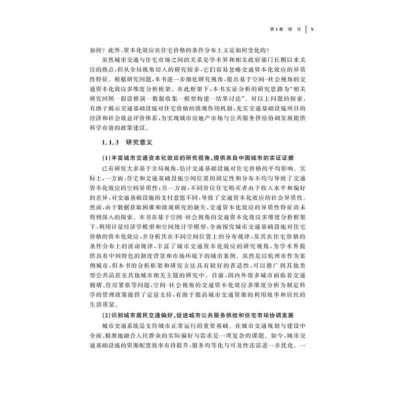 本书主要关注城市交通基础设施对住宅价格的资本化效应及其在空间维度和社会维度的异质性,构建了基于空间-社会维度的交通资本化效应分析框架。在此框架下,通过构建计量经济学模型和空间统计学模型定量识别城市居民对各类交通基础设施的偏好和支付意愿,并揭示其在不同空间位置和住宅价格条件分布上的分异规律。这些定量参数有助于揭示城市交通资源配置中可能存在的可及性低、均等化不足等问题,为交通资源供给的公共决策提供依据,从而改善服务供给与居民需求不匹配的现状。多维度的分析框架及相应的研究方法也为“需求导向”的城市规划和管理政策设计和实践操作提供科学的定量分析工具。