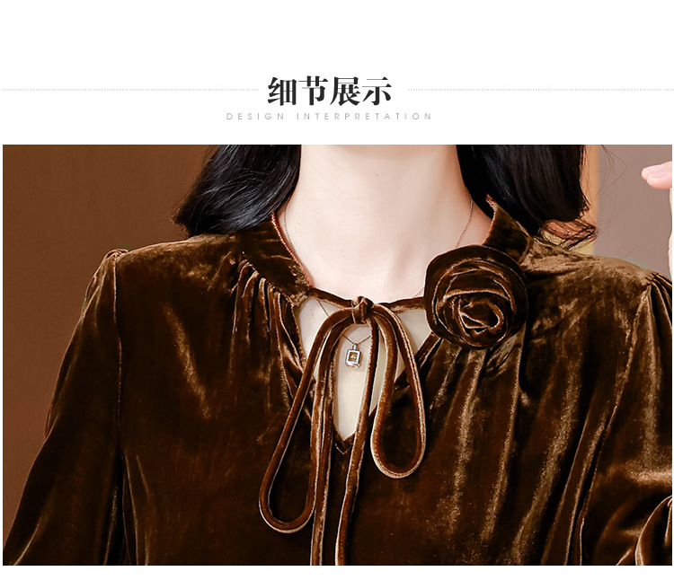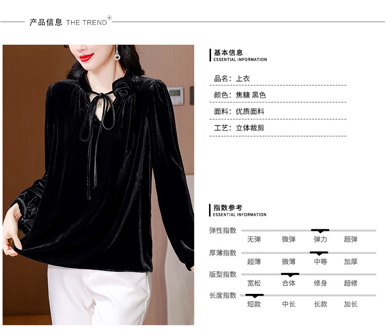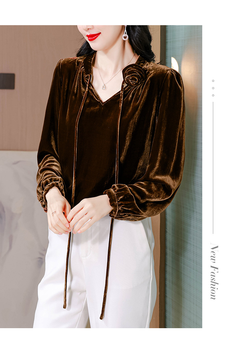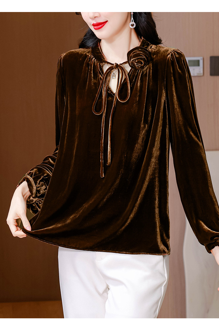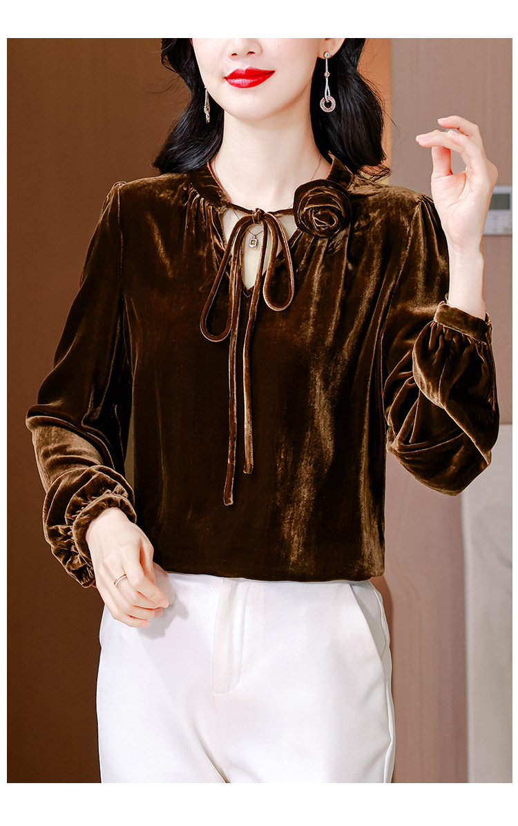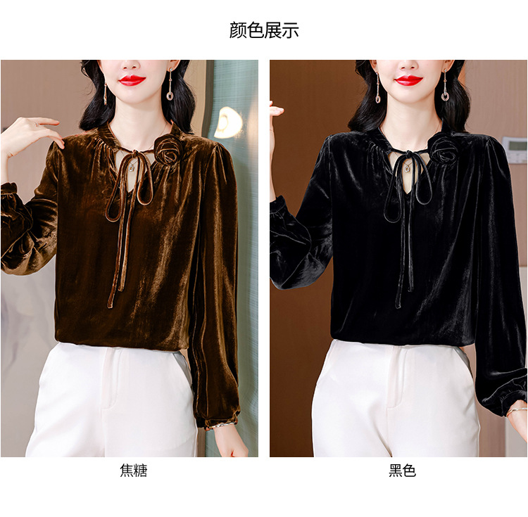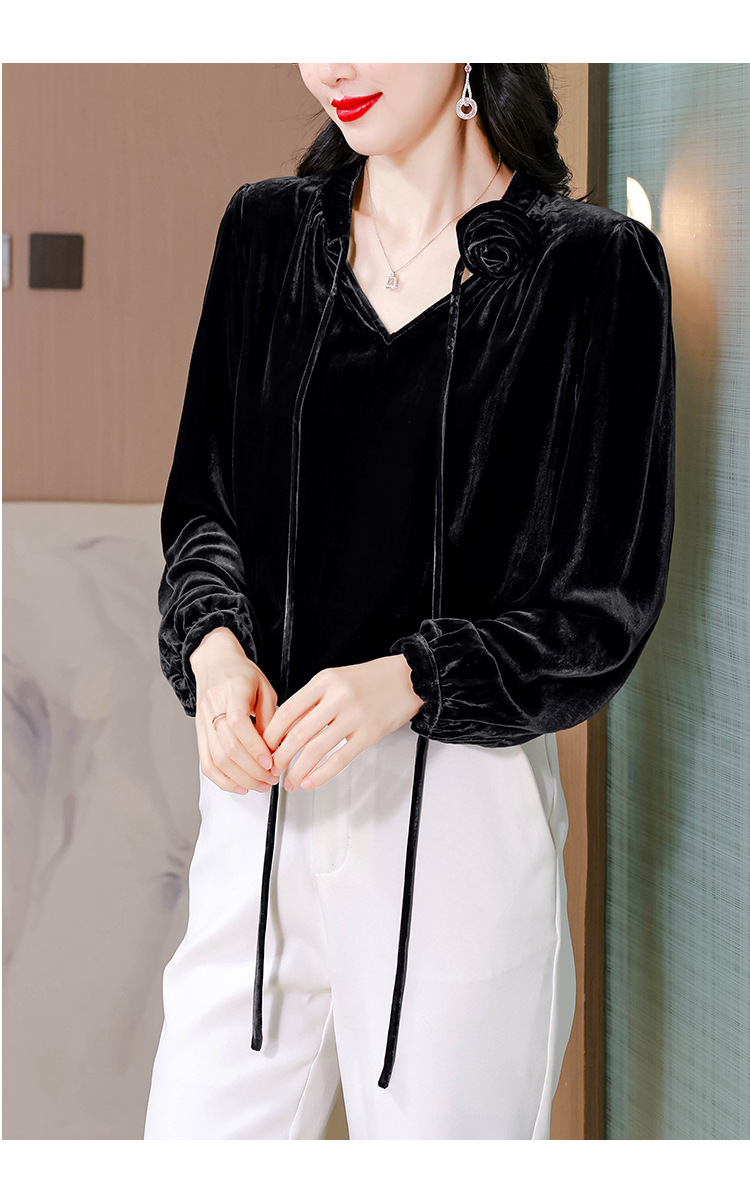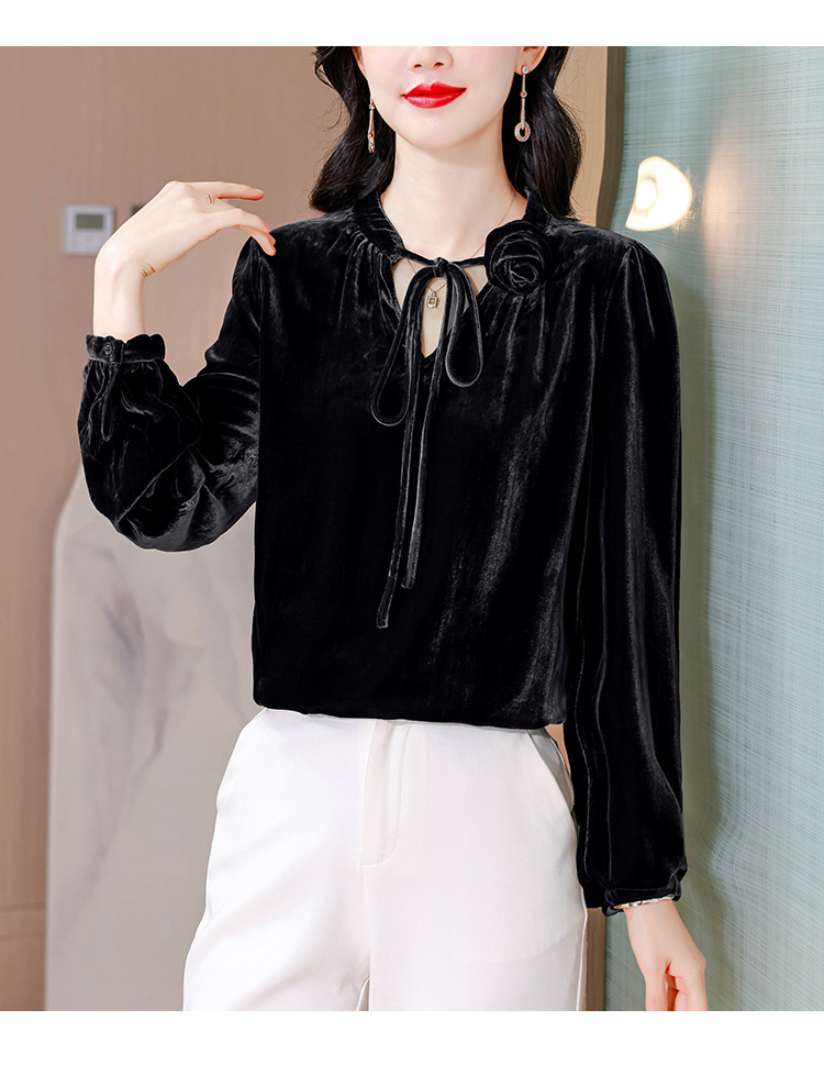 KQL A83N3303法式暗丝绒系带衬衫镂空花朵显瘦上衣