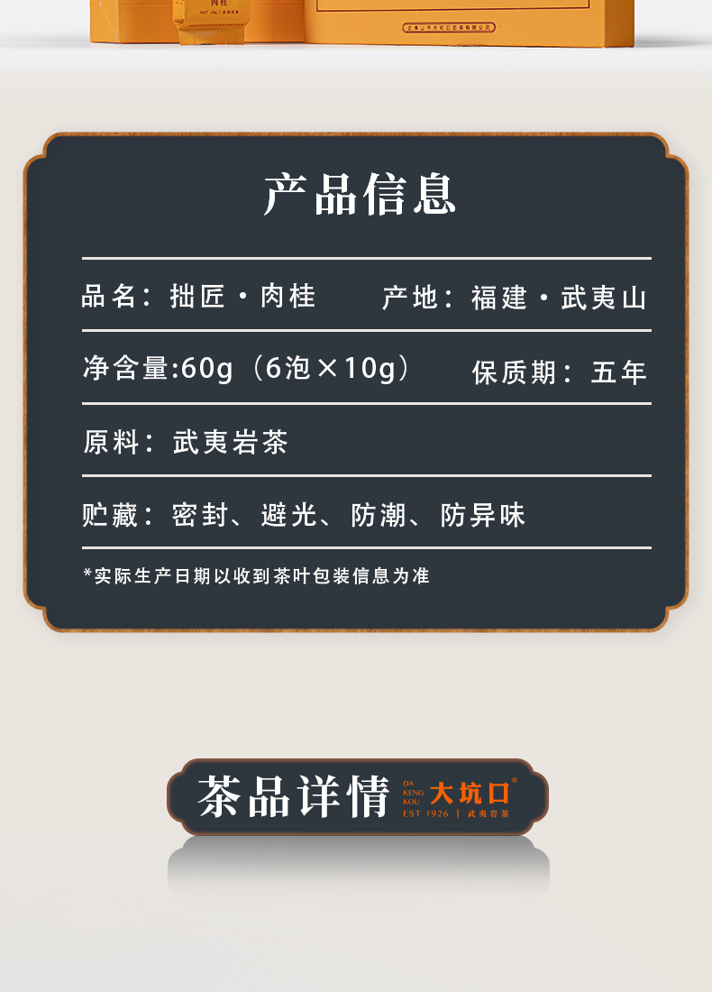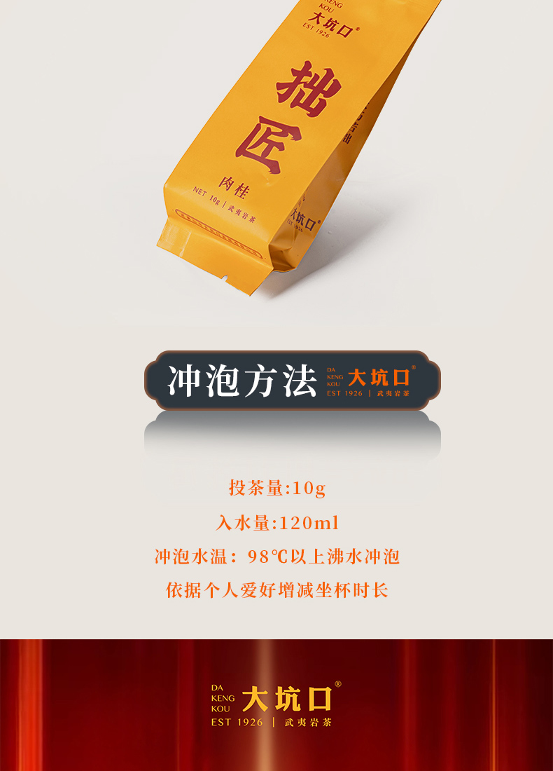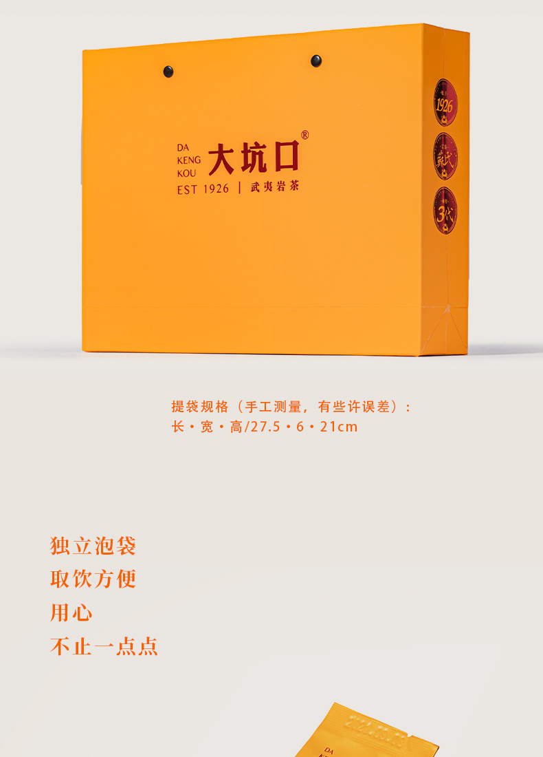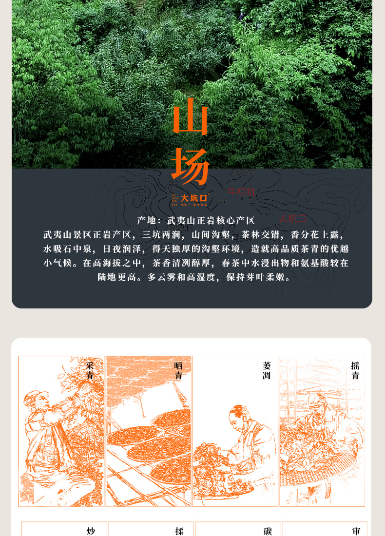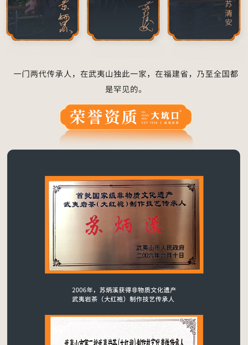 - 大坑口岩茶有限公司,位于武夷山市-天心村,茶山分布于正岩产区的“三坑、两涧”,由首批非物质文化遗产武夷岩茶制作技艺传承人:苏炳溪和第二批传承人:苏德发先生的精心手工制作,造就了大坑口岩茶的独特品质