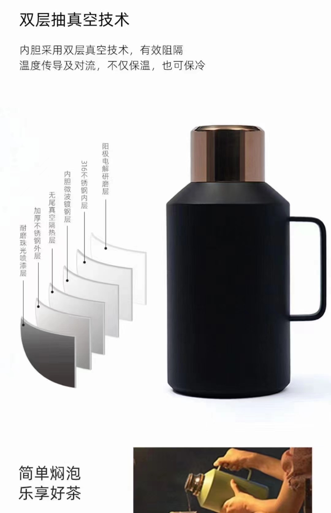 内胆316不锈钢材质,且采用双层真空技术,保温24小时,可以焖白茶,普洱,红茶,小青柑,陈皮,枸杞等等,热天可以放冰冷泡。
