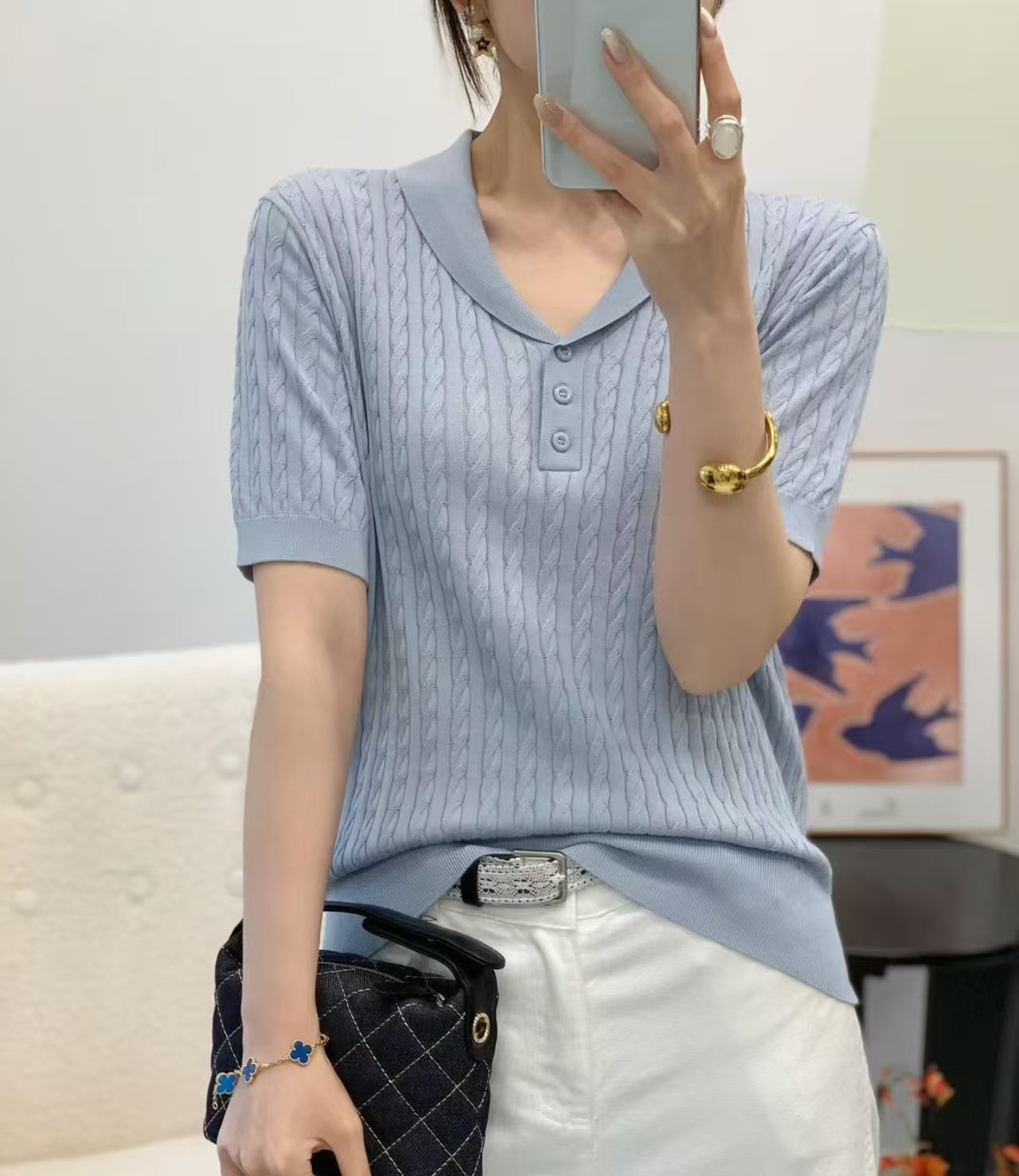【品名】FS竹纤维女士小翻领麻花编针织半袖623
