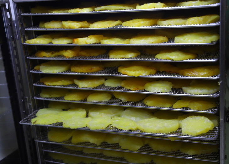 凤梨干的极简制作流程:鲜果人工削皮切片后直接放烘干机内低温烘干。
