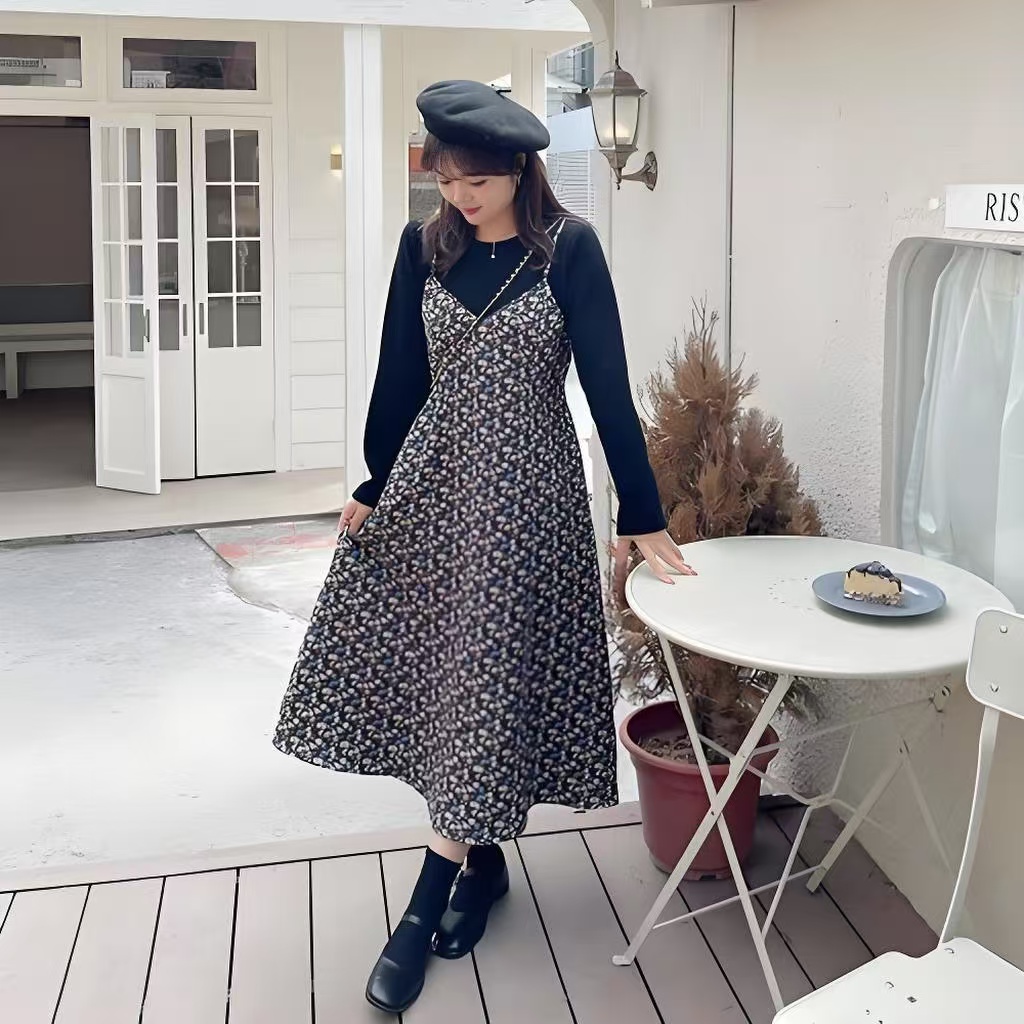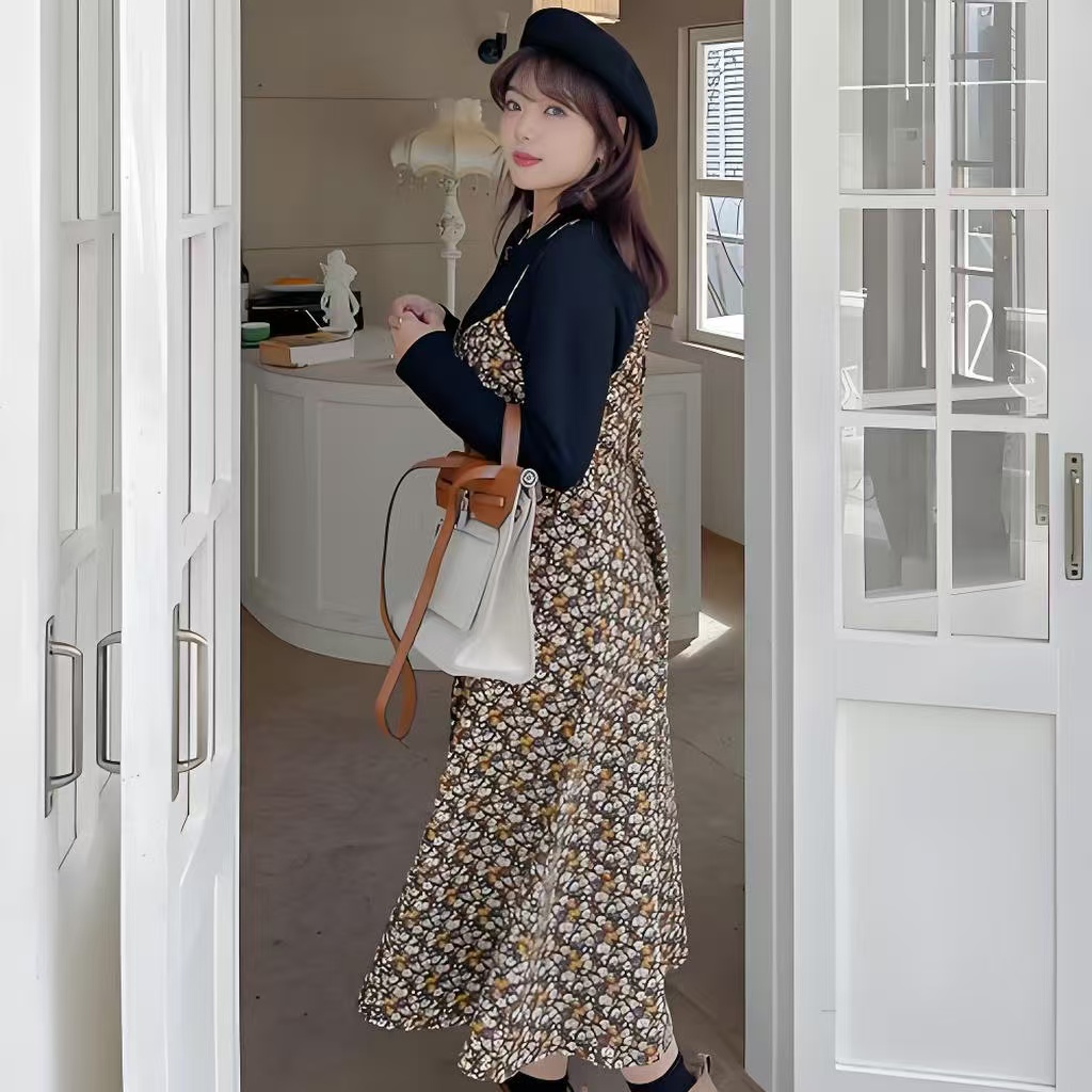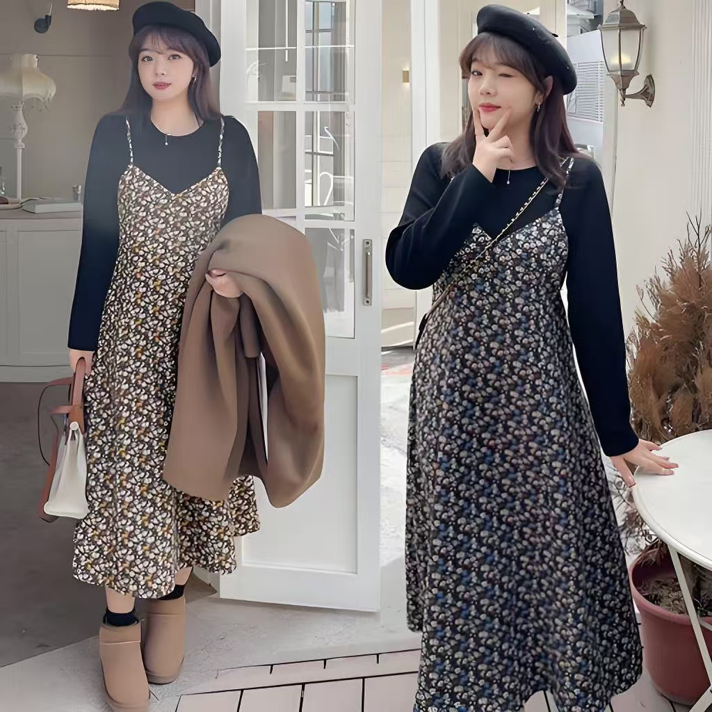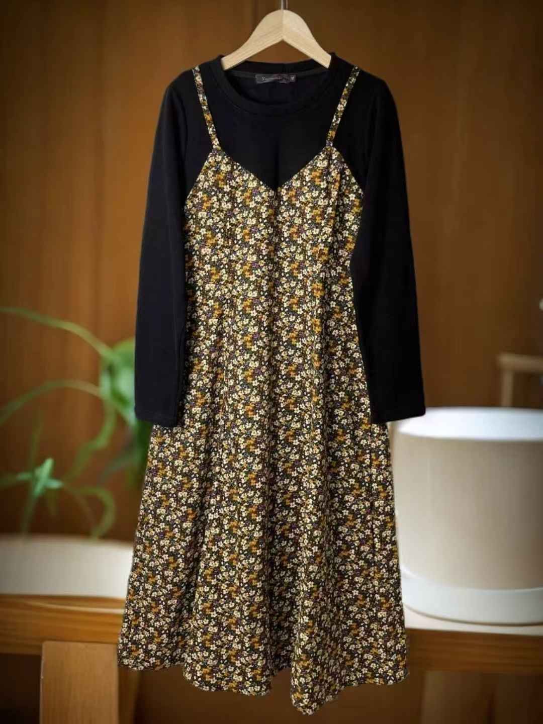 【诗铭洛可】(加绒款)W703连衣裙假两件碎花秋冬裙A1-1