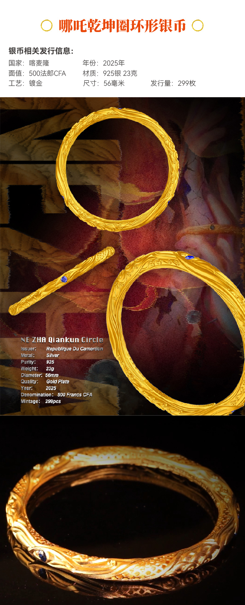 哪吒乾坤圈!2025喀麦隆环形镀金镶嵌银币!
