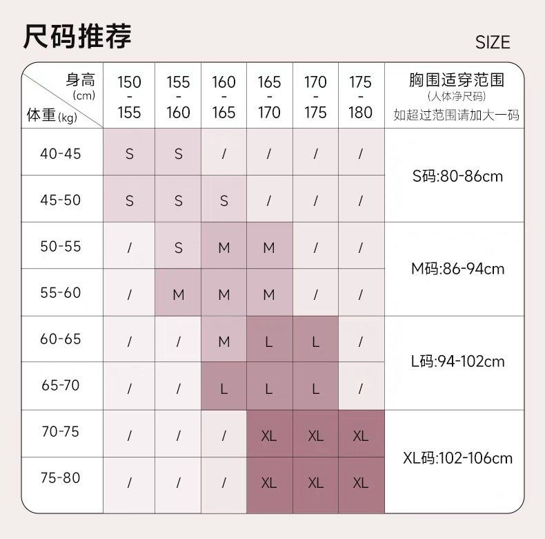 90~118斤参考S;118~128斤参考M;128~138斤参考L;138~150斤参考XL