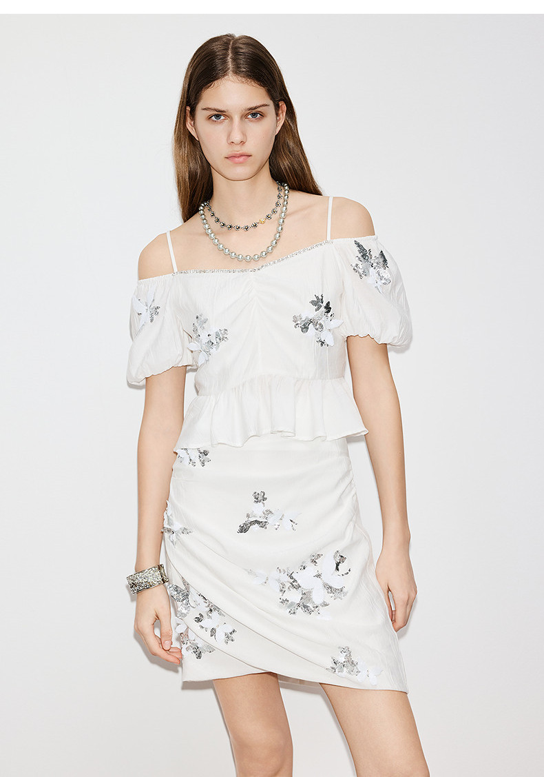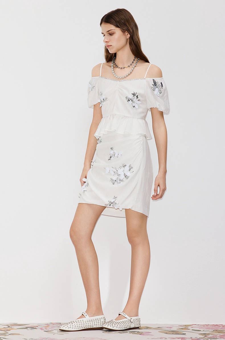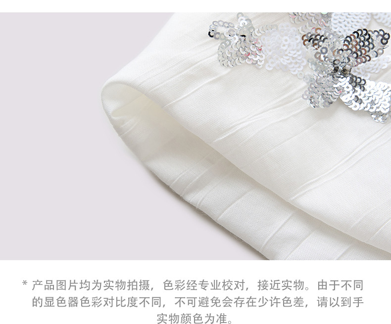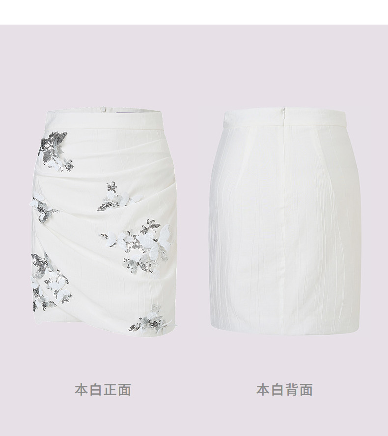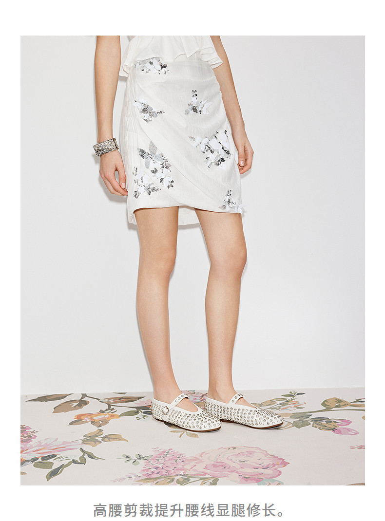 MAXRIENY立体刺绣半身裙2026年春季新款半裙修身收腰亮片白色裙子(货号:MF80SK005)