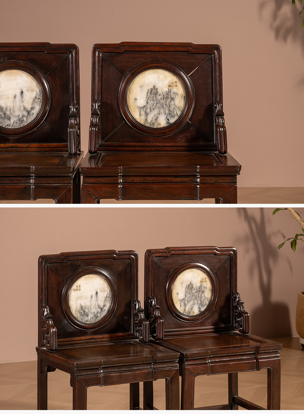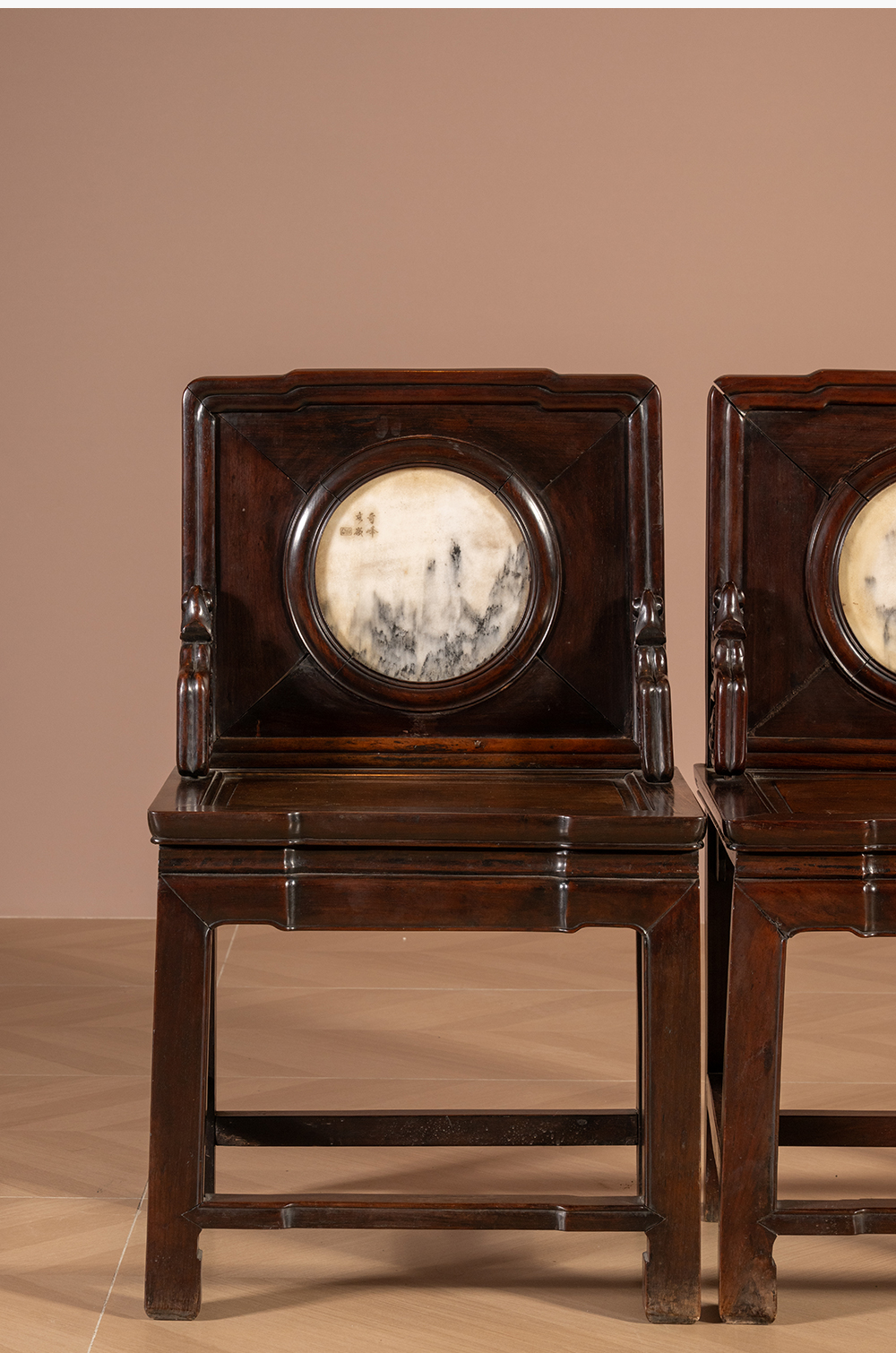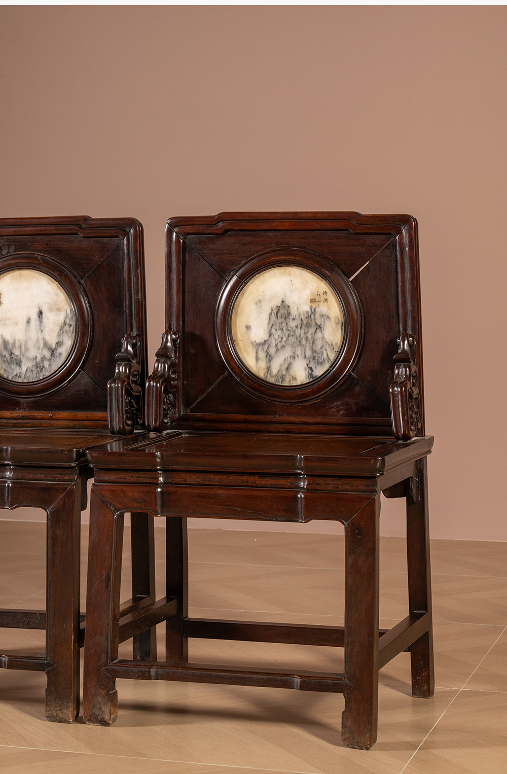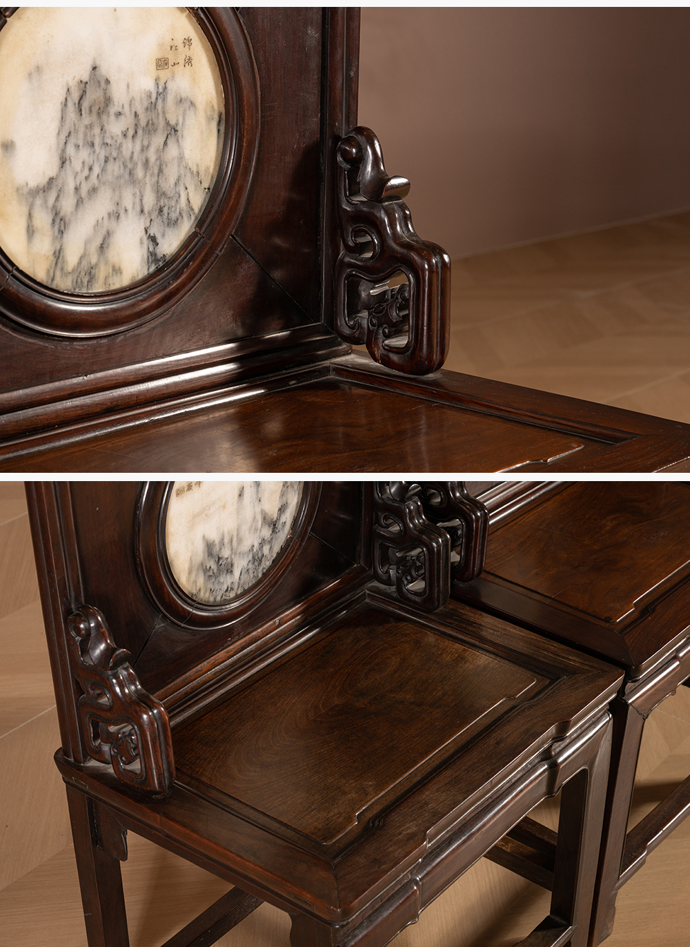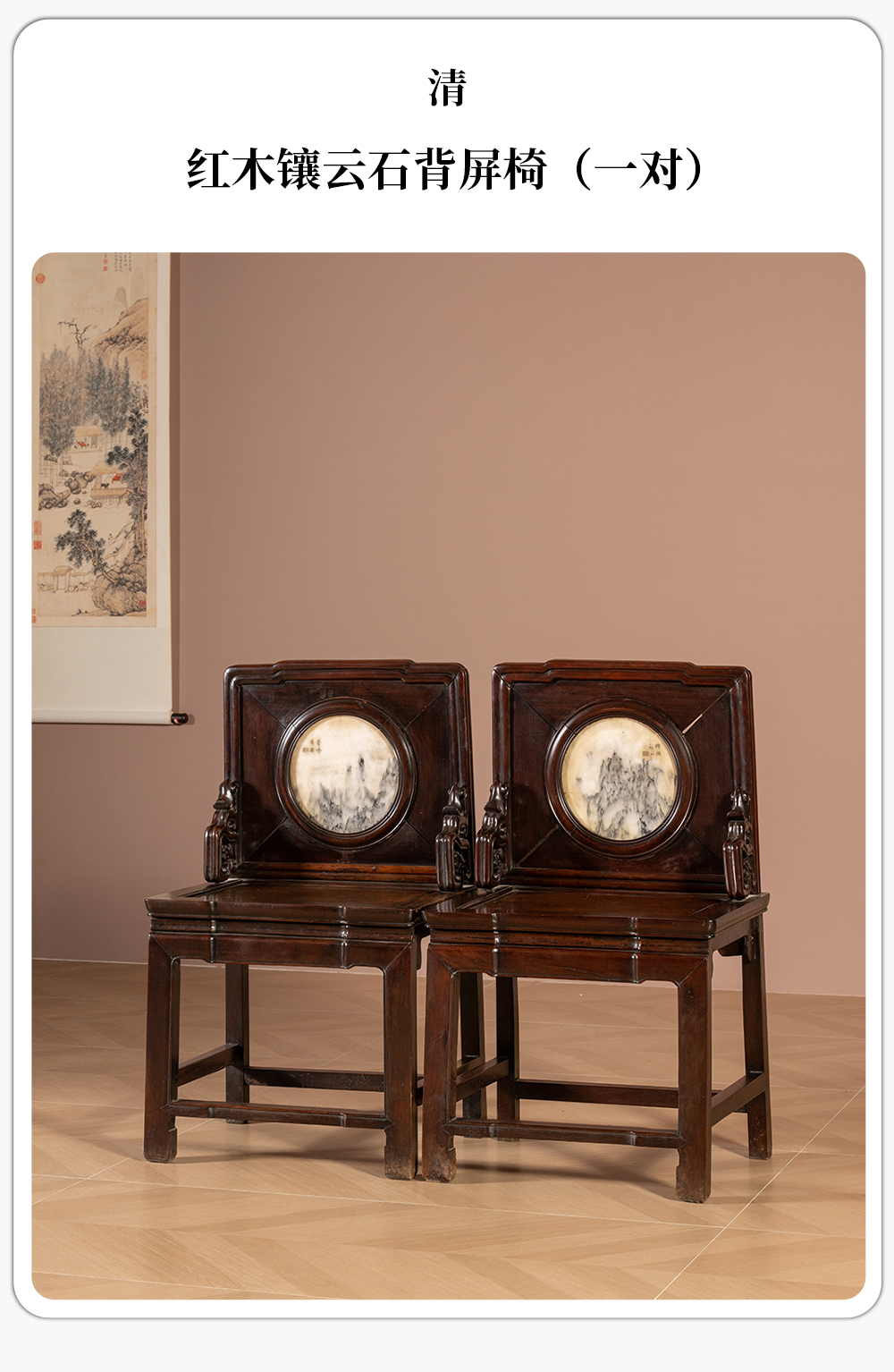 清 红木镶云石背屏椅(一对)