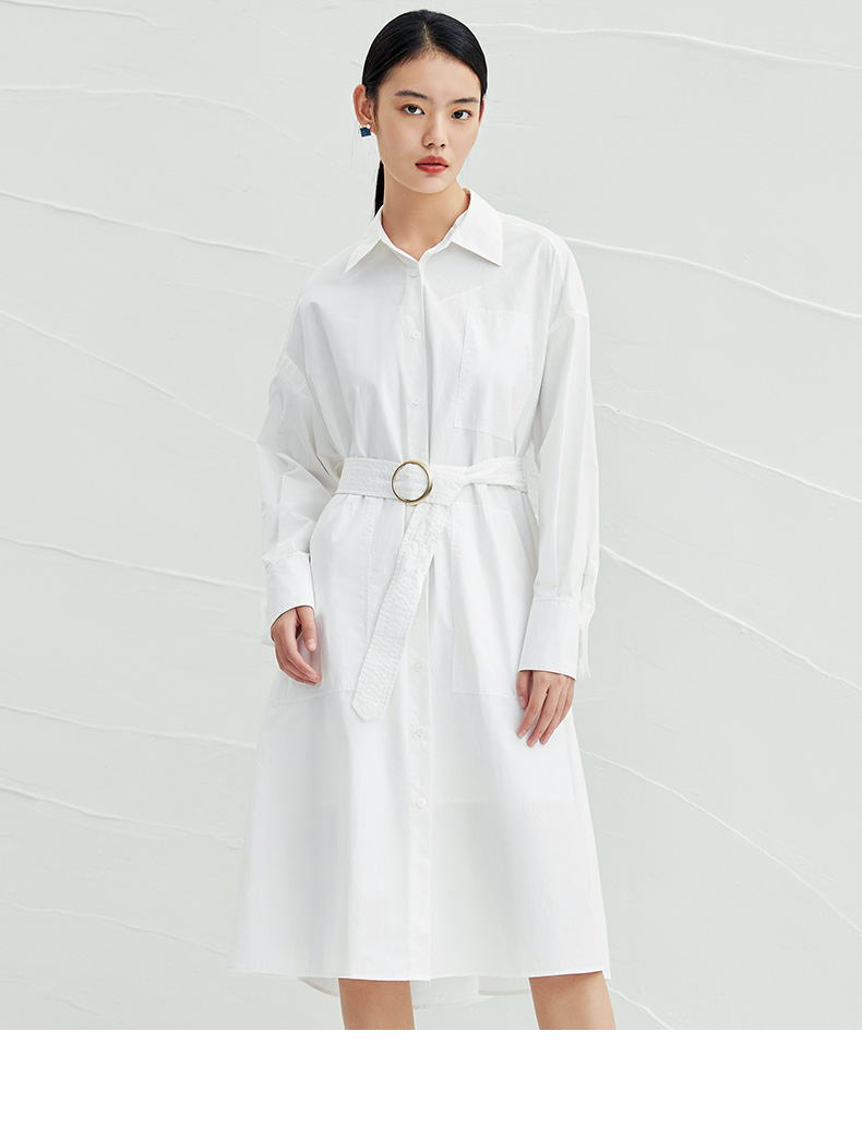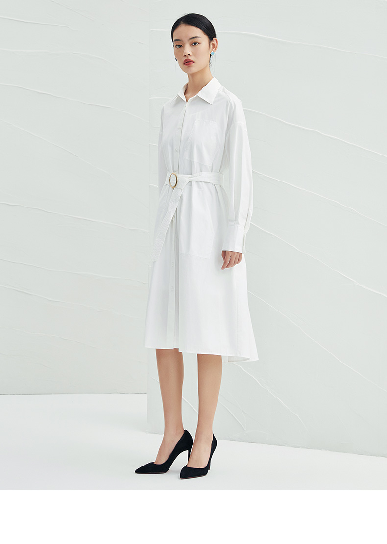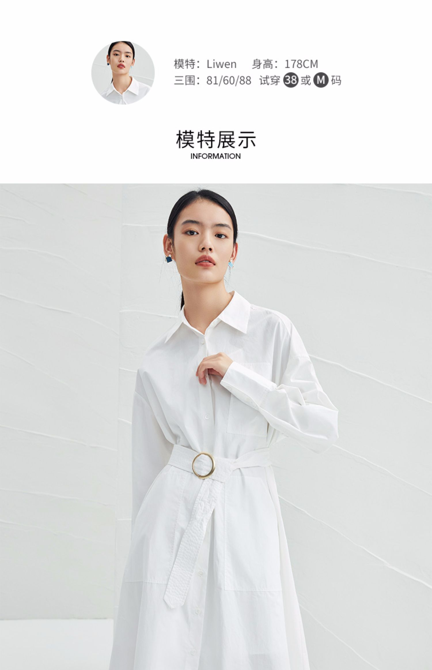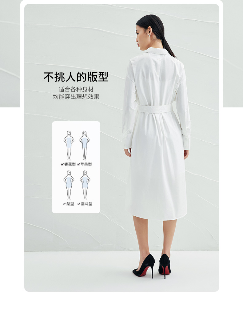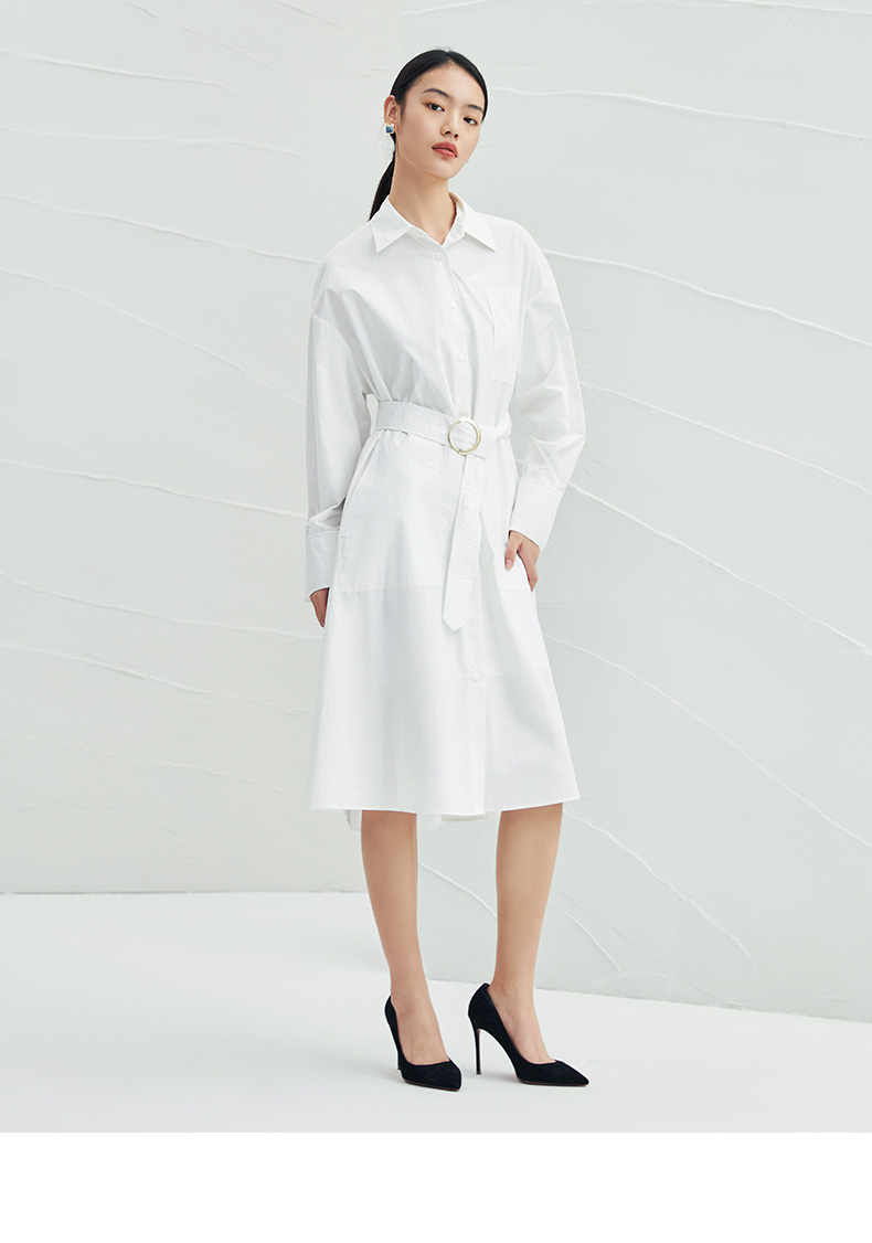 EITIE爱特爱春季新款白色收腰时尚通勤显瘦衬衫式连衣裙A2207917