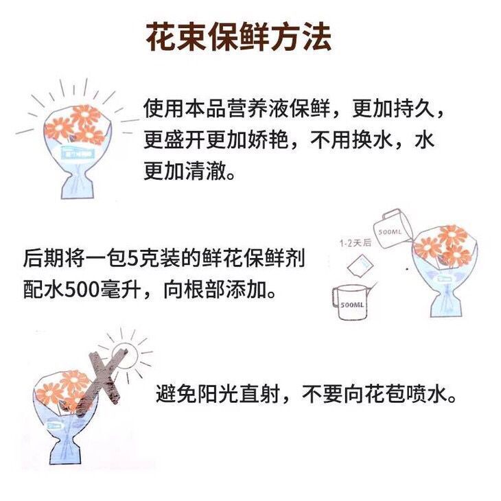 4.请放置阴凉处、避开风口、不要和成熟水果放在一起,千万不要给花表面喷水。每天检查鲜花,摘掉腐烂的花瓣、剪掉凋谢的花头,以保证其他花材环境洁净、卫生!